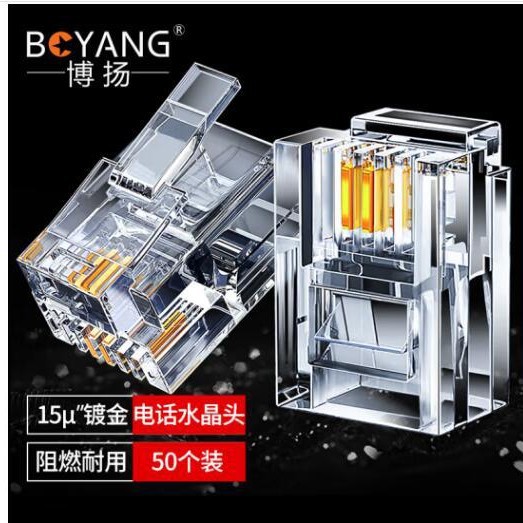 博扬(BOYANG) 电话水晶头三叉式 2芯语音电话线接头 RJ11语音电话线水晶头(15U镀金)50/盒 BY-RJ11-6P2C-50*1 合格证*1 保修卡*1