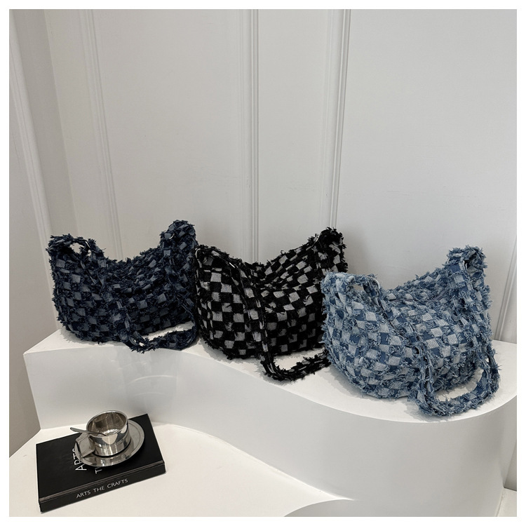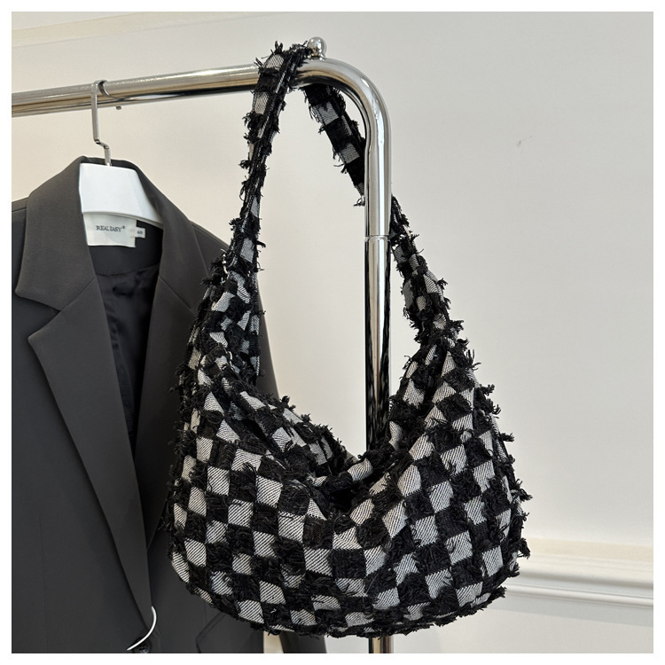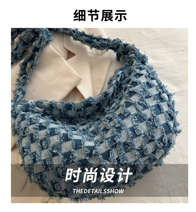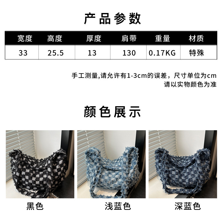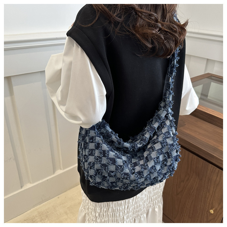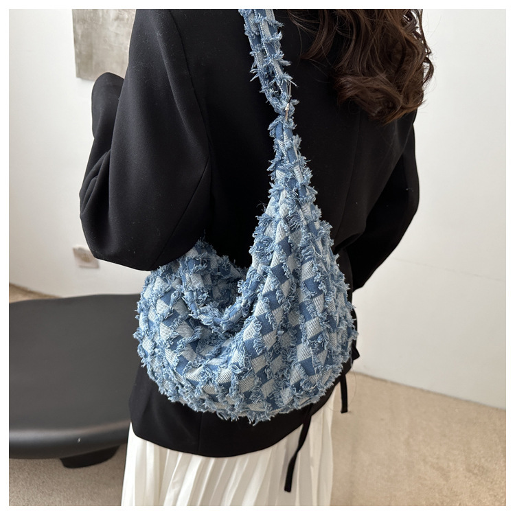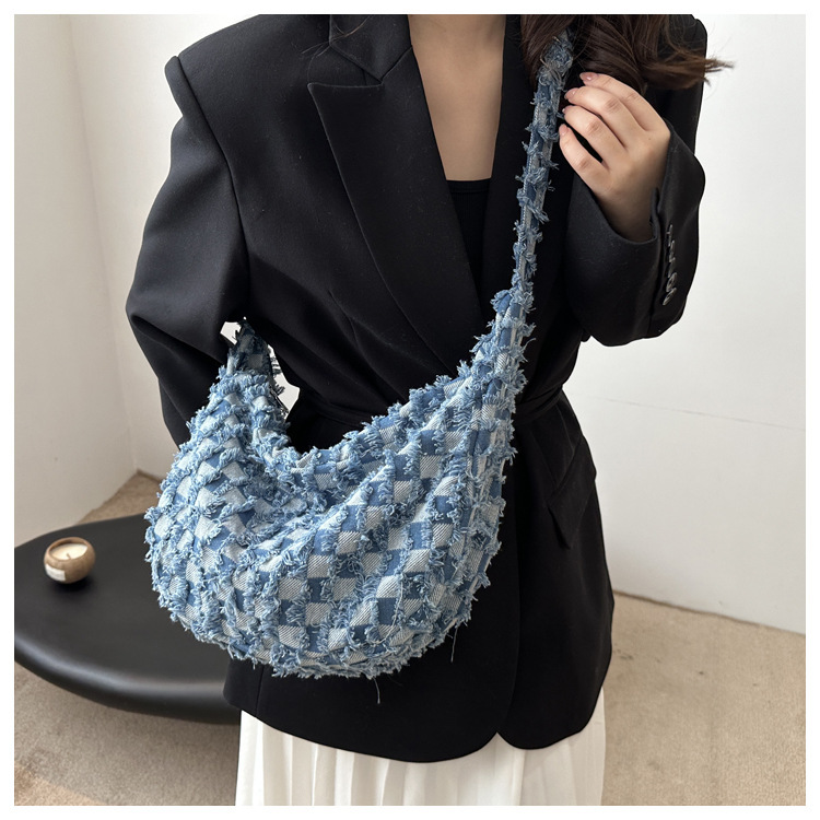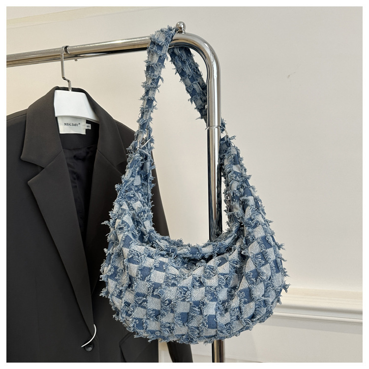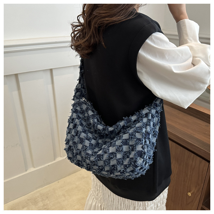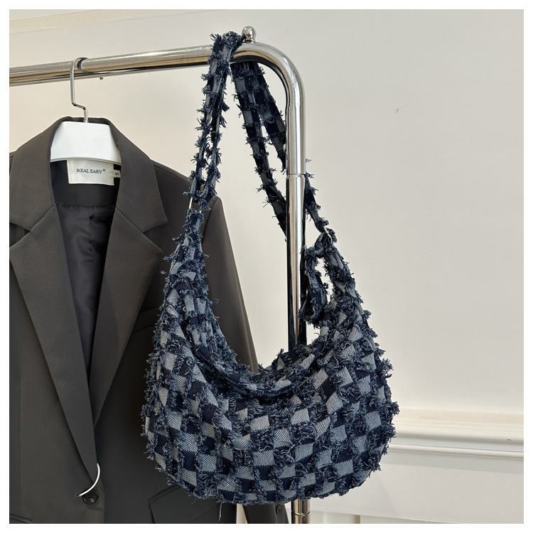2024个性新款休闲时尚大容量牛仔帆布简约格子单肩腋下斜挎腋下包