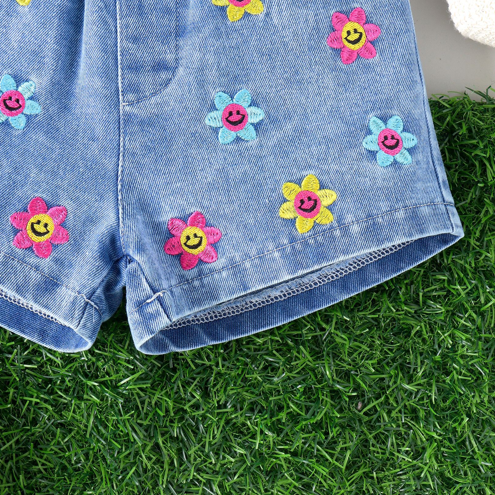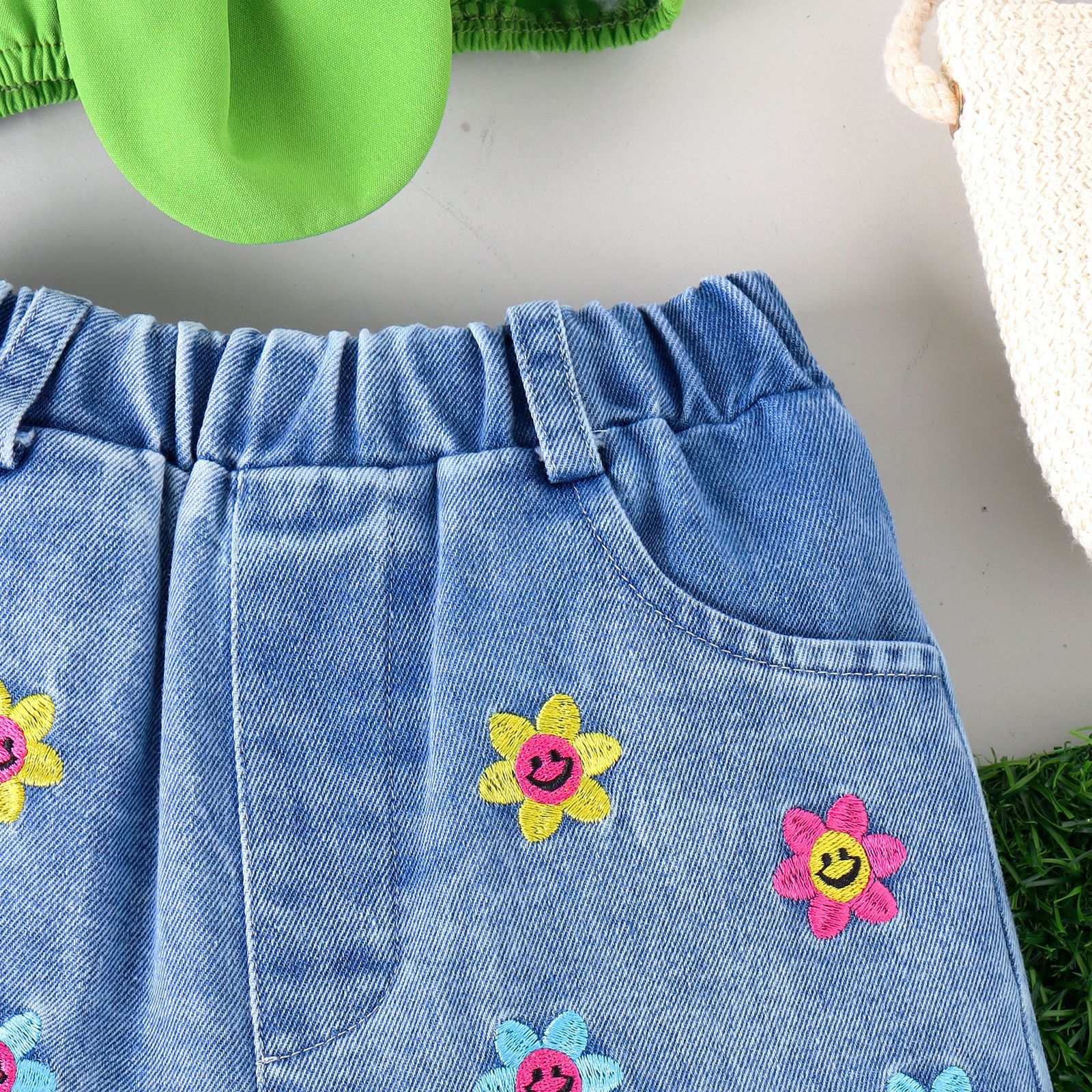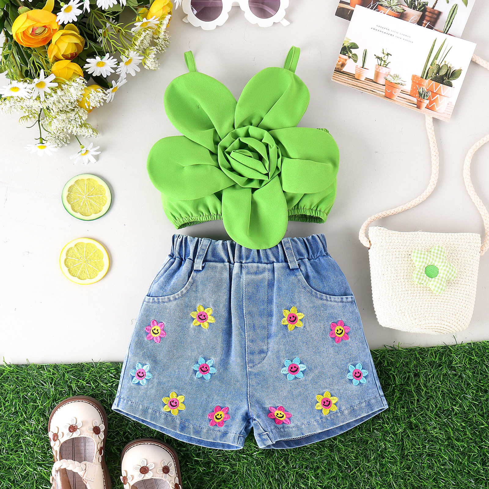 국경 간 대외 무역 아동복 유럽과 미국 여름 소녀 3 차원 큰 꽃 캐미솔 자수 데님 반바지 세트