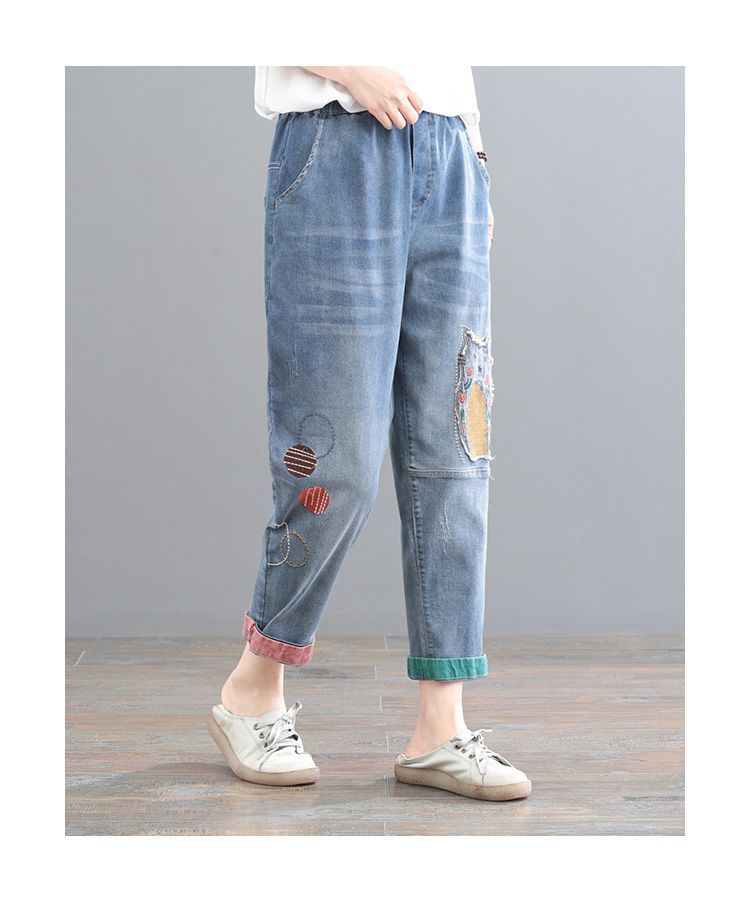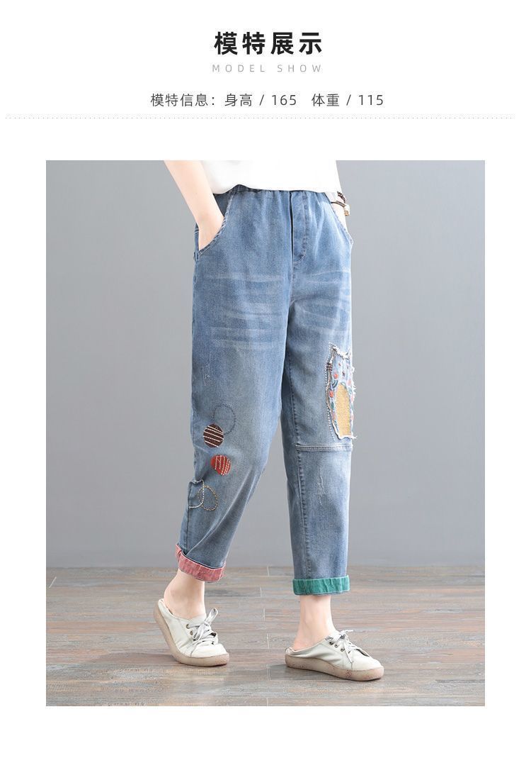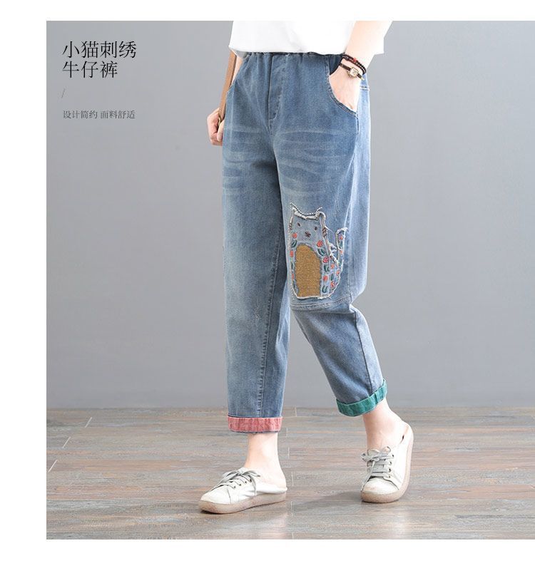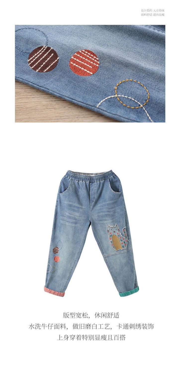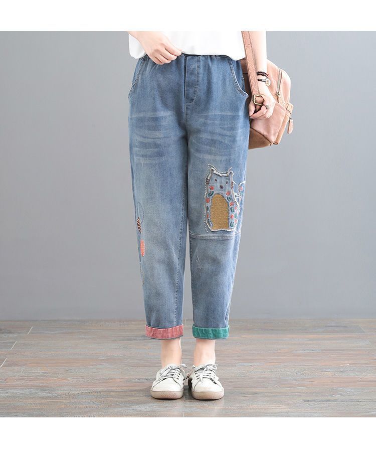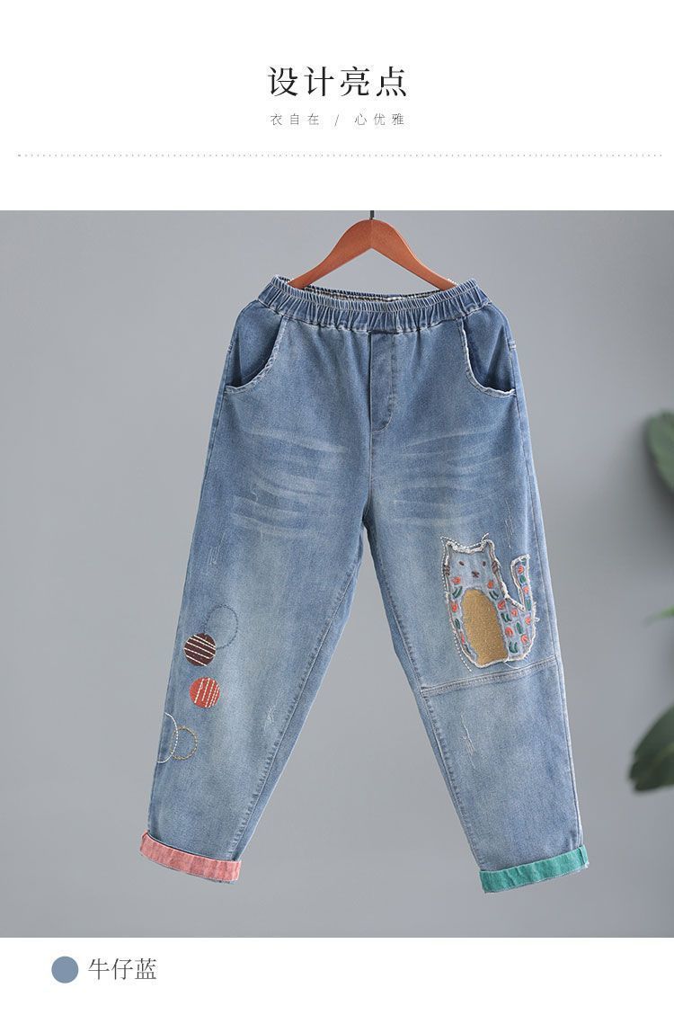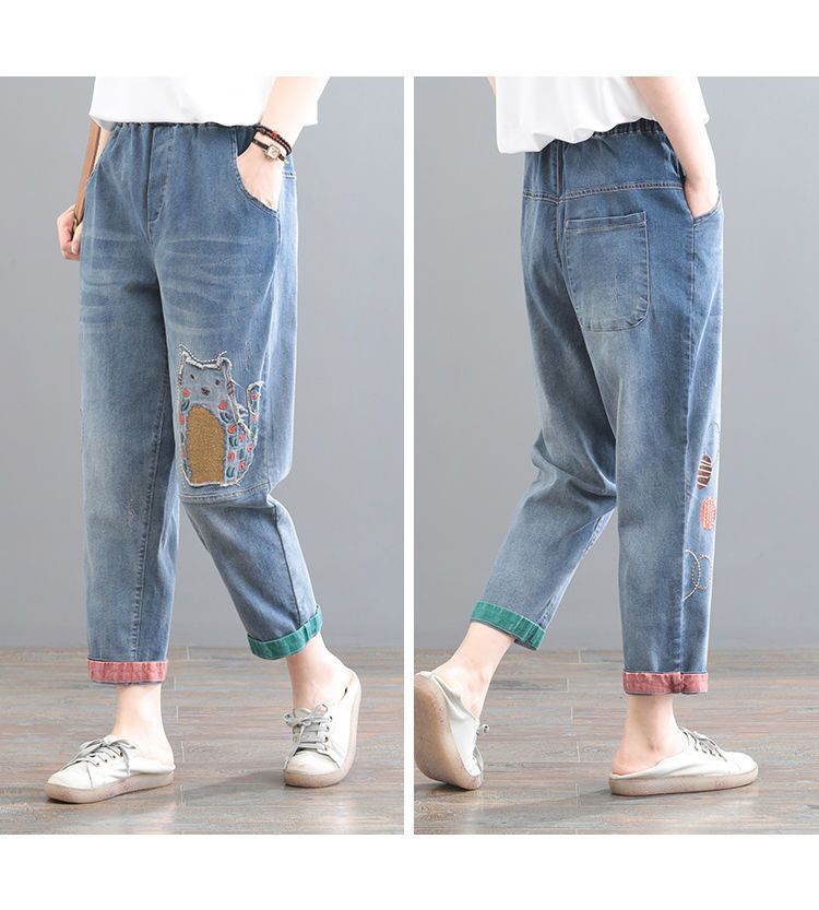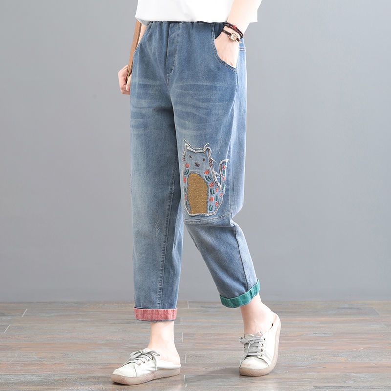 청바지 여성 2025 봄과 여름 새로운 한국 스타일 플러스 사이즈 만화 자수 페이스트 세련된 9 점 하렘 바지