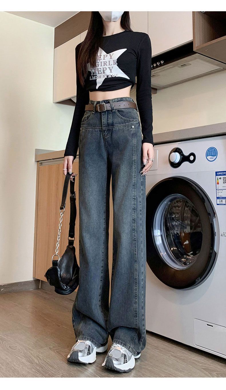 봄과 가을 느슨한 시멘트 회색 높은 허리 스티칭 바지 짧은 넓은 다리 좁은 판 직선 바닥 청바지스토어 가기