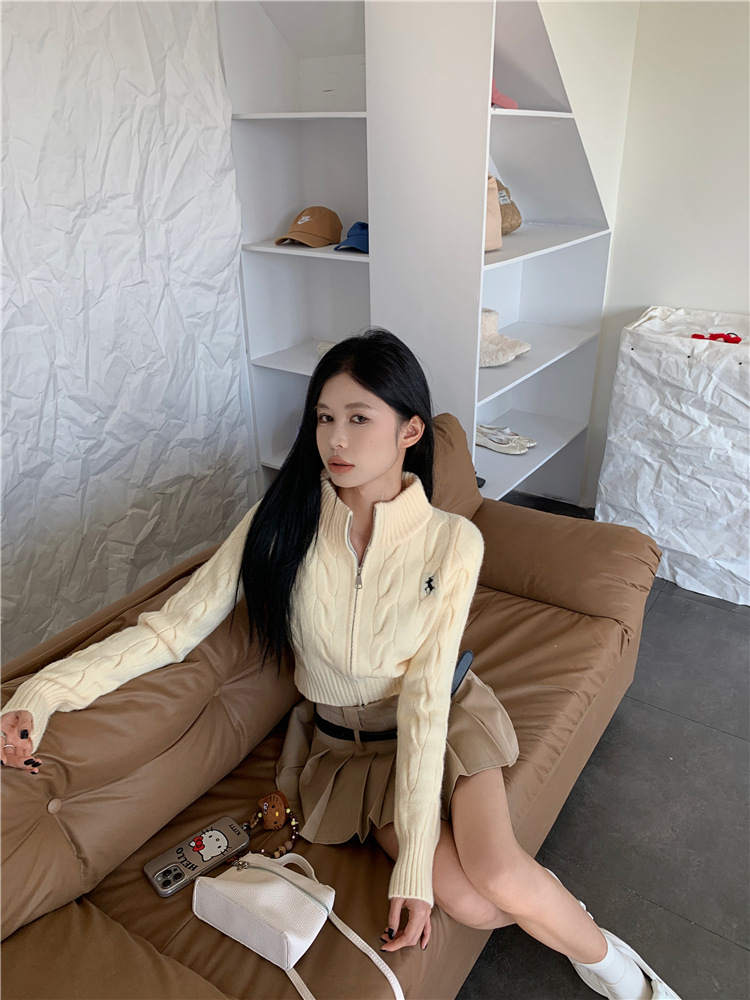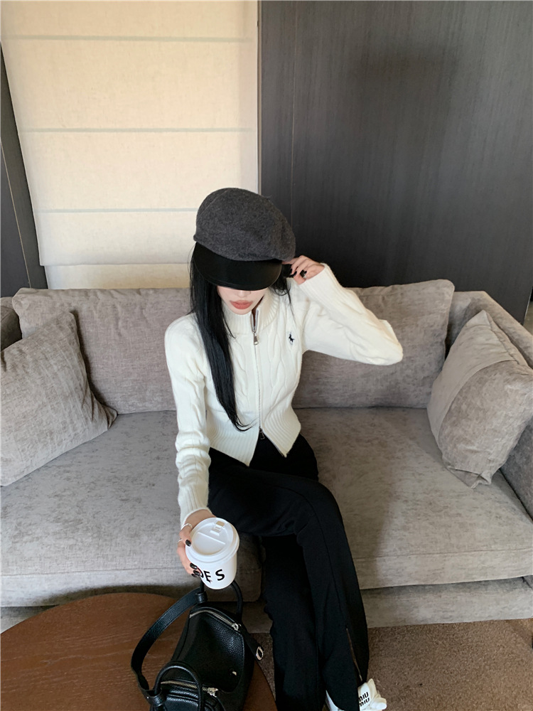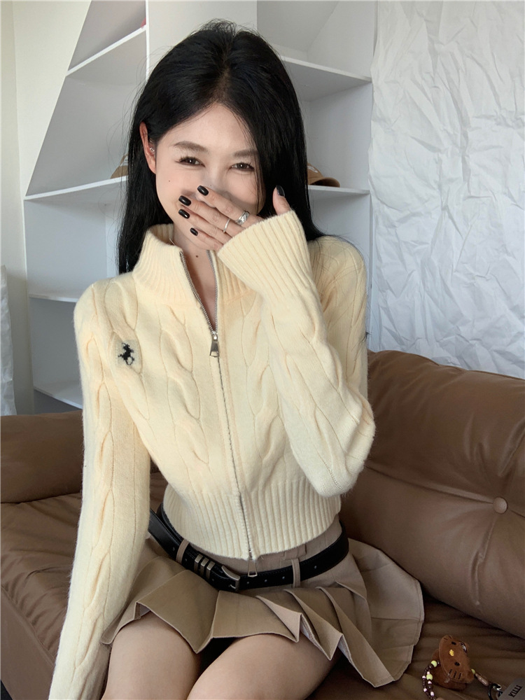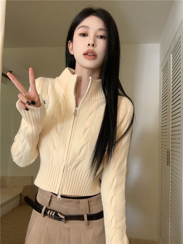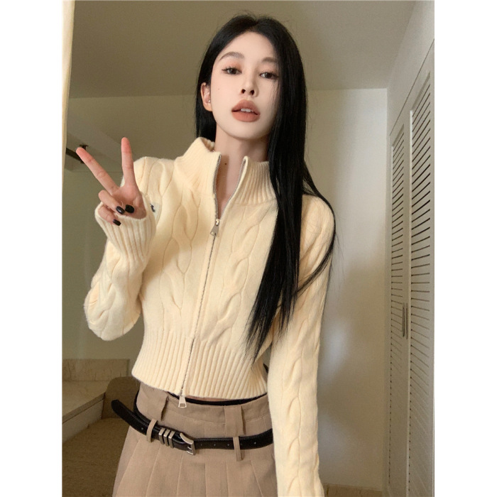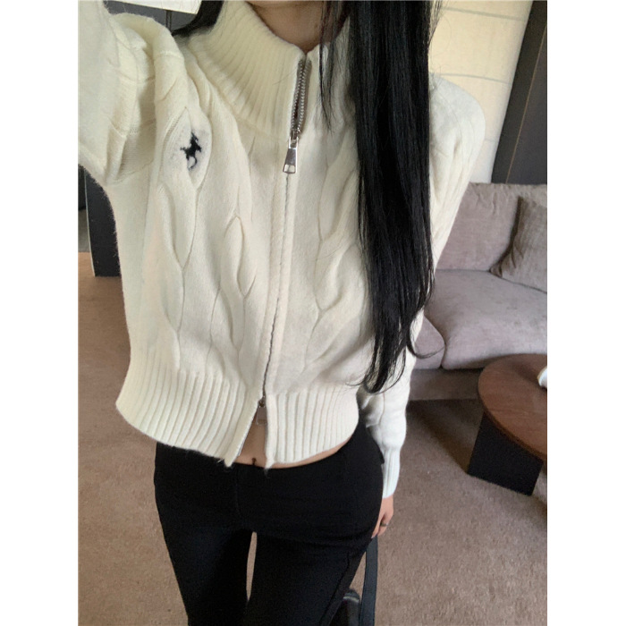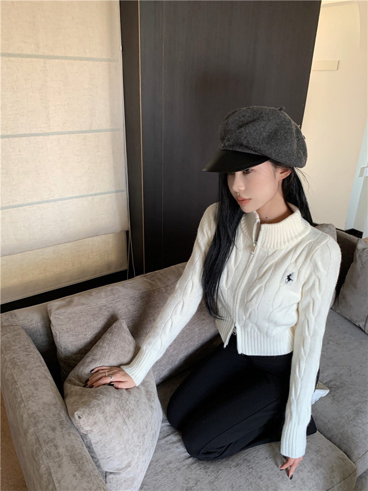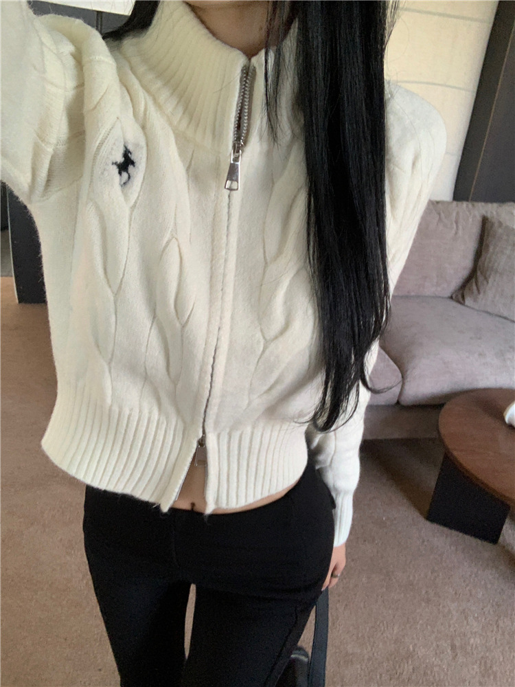 트위스트 자수 스탠드 칼라 스웨터 코트 여자 겨울 더블 Zip 니트 카디건 화이트 슬림 핏 짧은 긴팔 탑