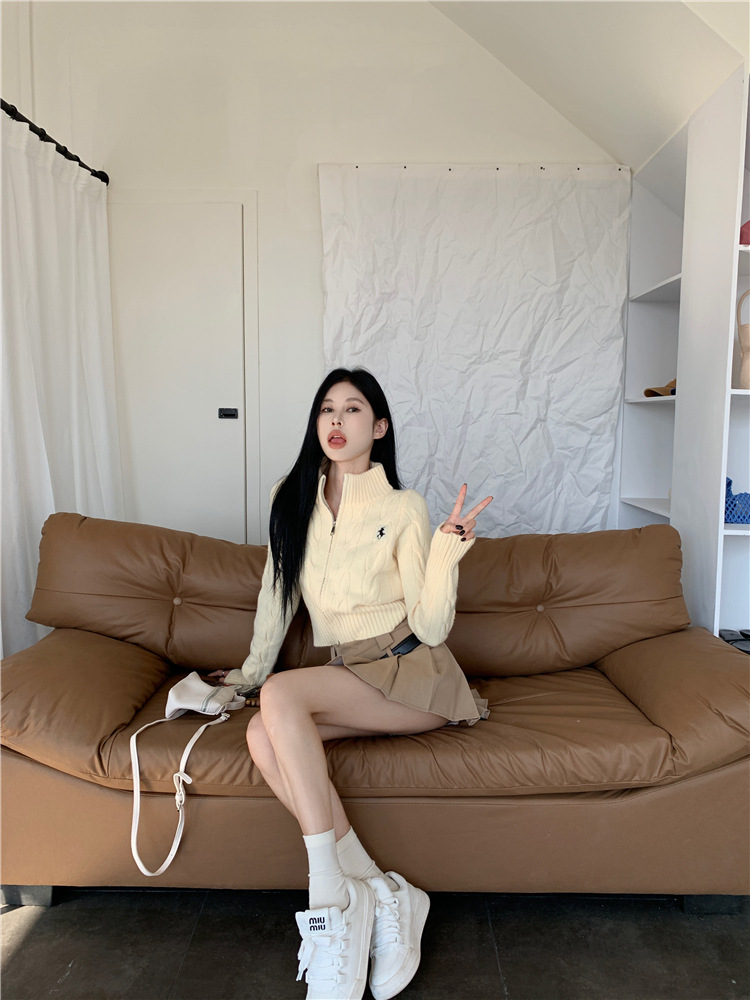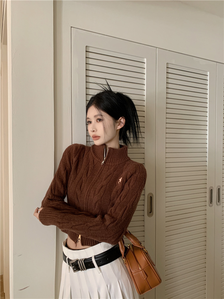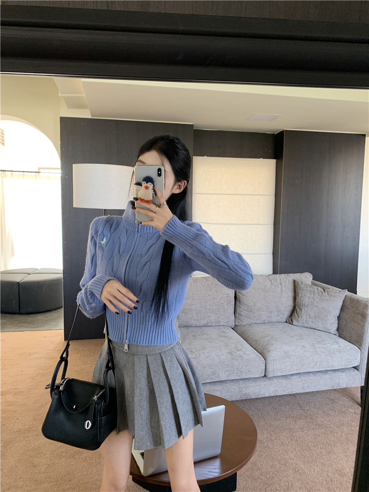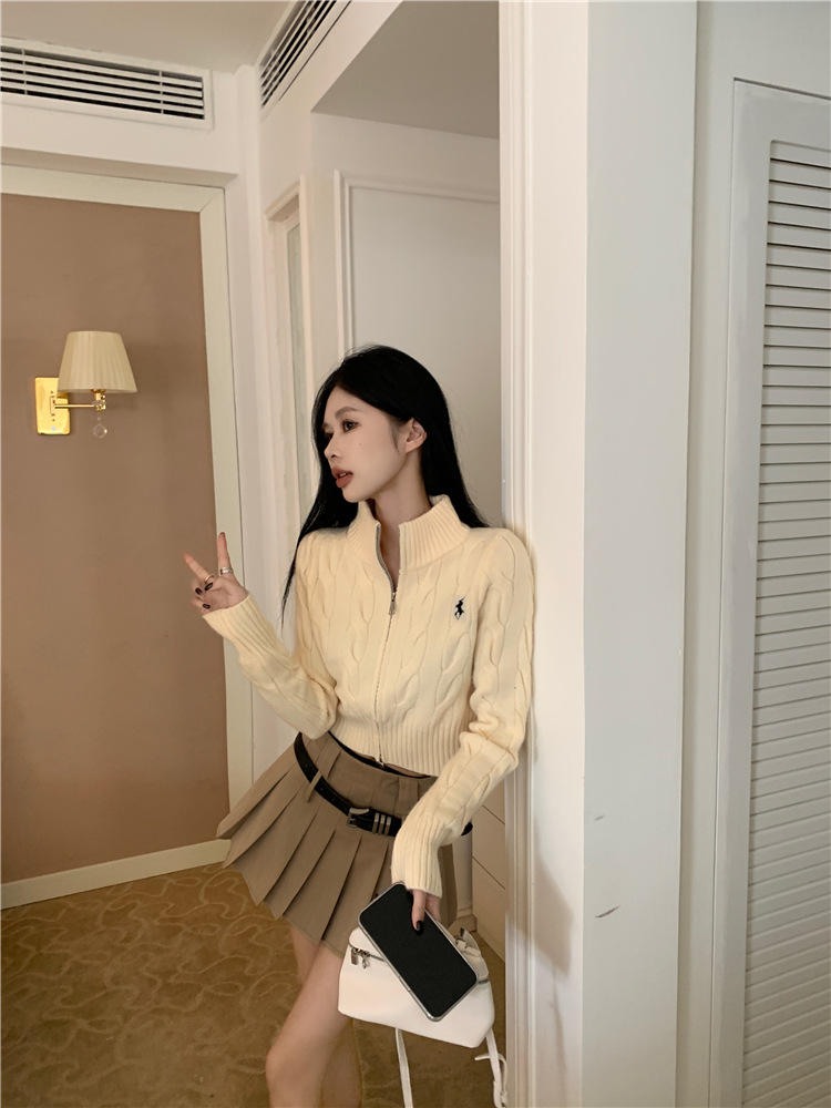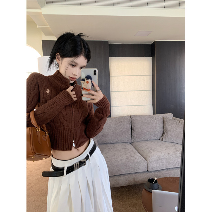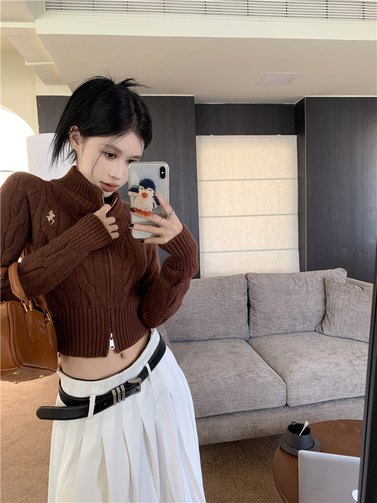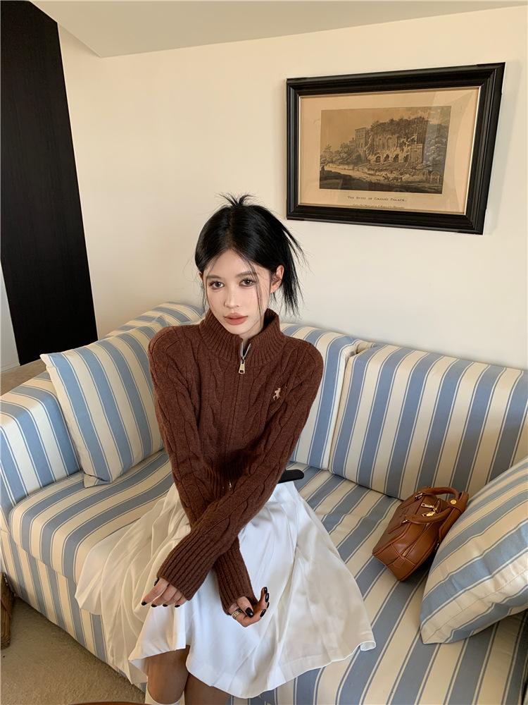 트위스트 자수 스탠드 칼라 스웨터 코트 여자 겨울 더블 Zip 니트 카디건 화이트 슬림 핏 짧은 긴팔 탑