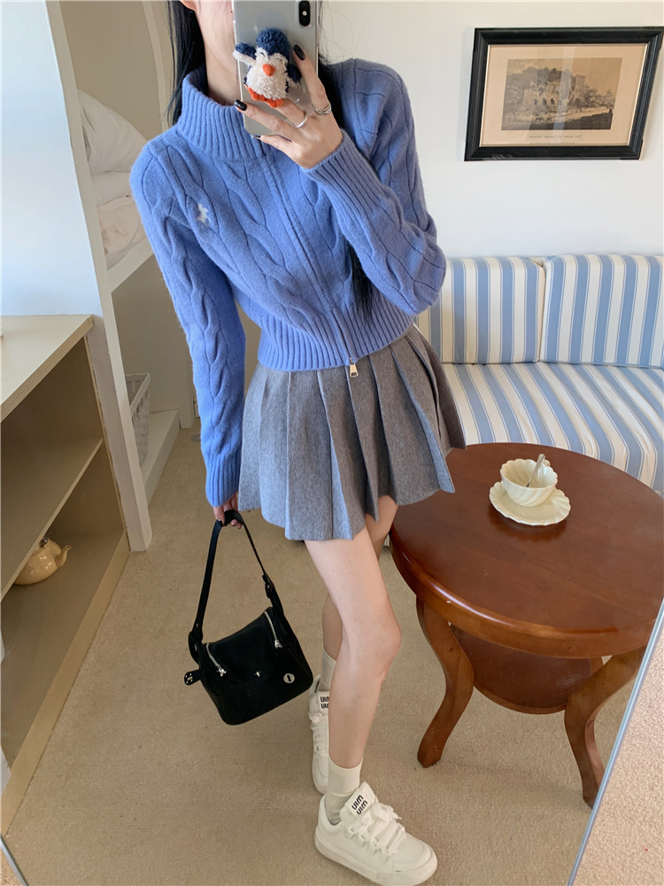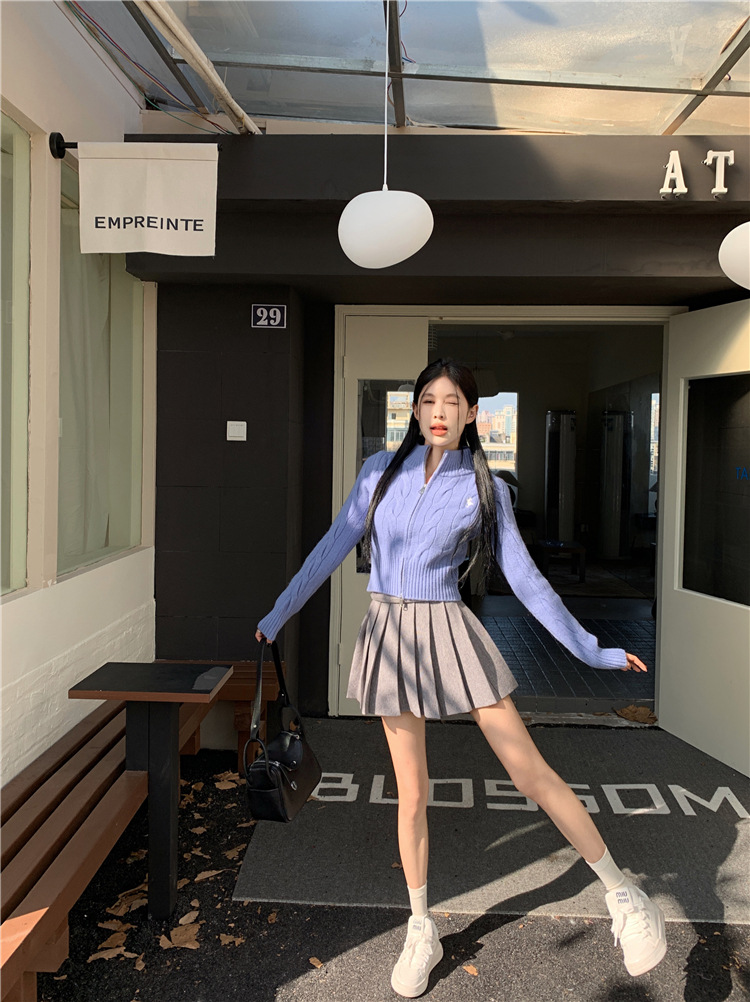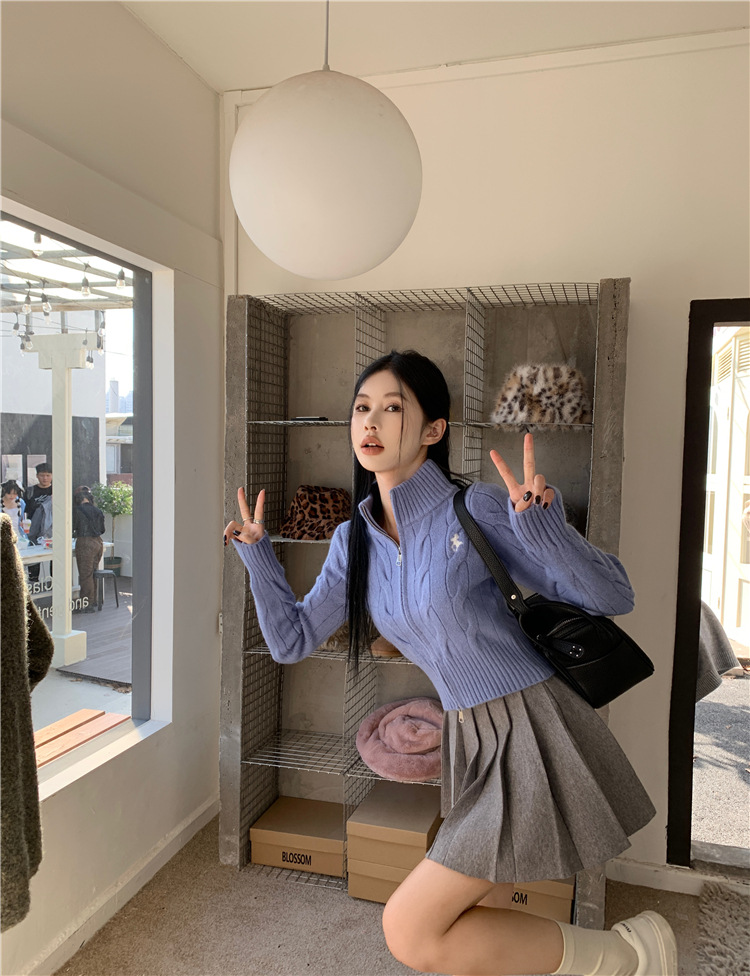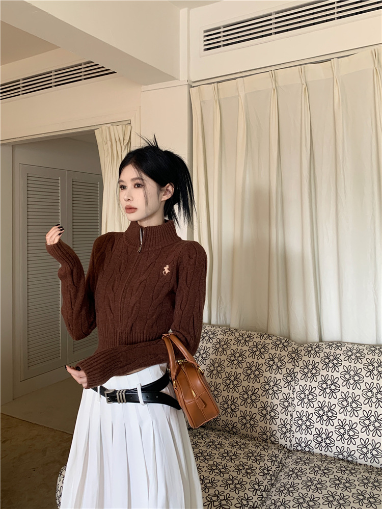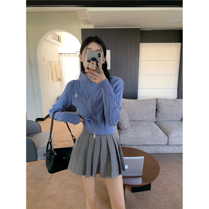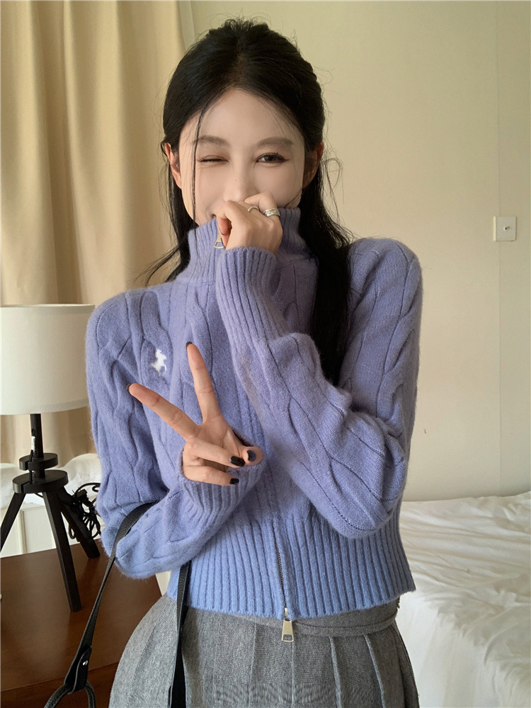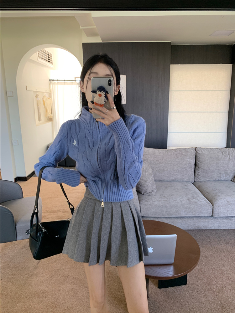 트위스트 자수 스탠드 칼라 스웨터 코트 여자 겨울 더블 Zip 니트 카디건 화이트 슬림 핏 짧은 긴팔 탑