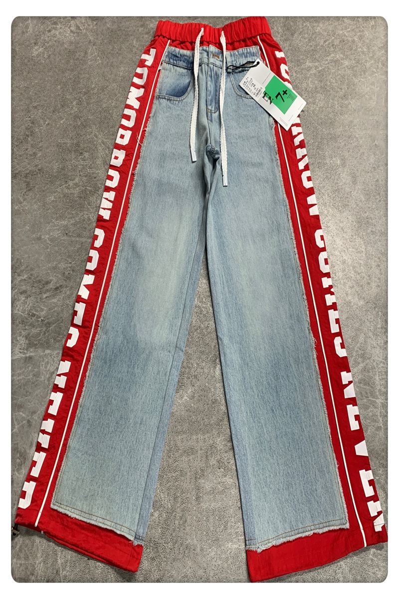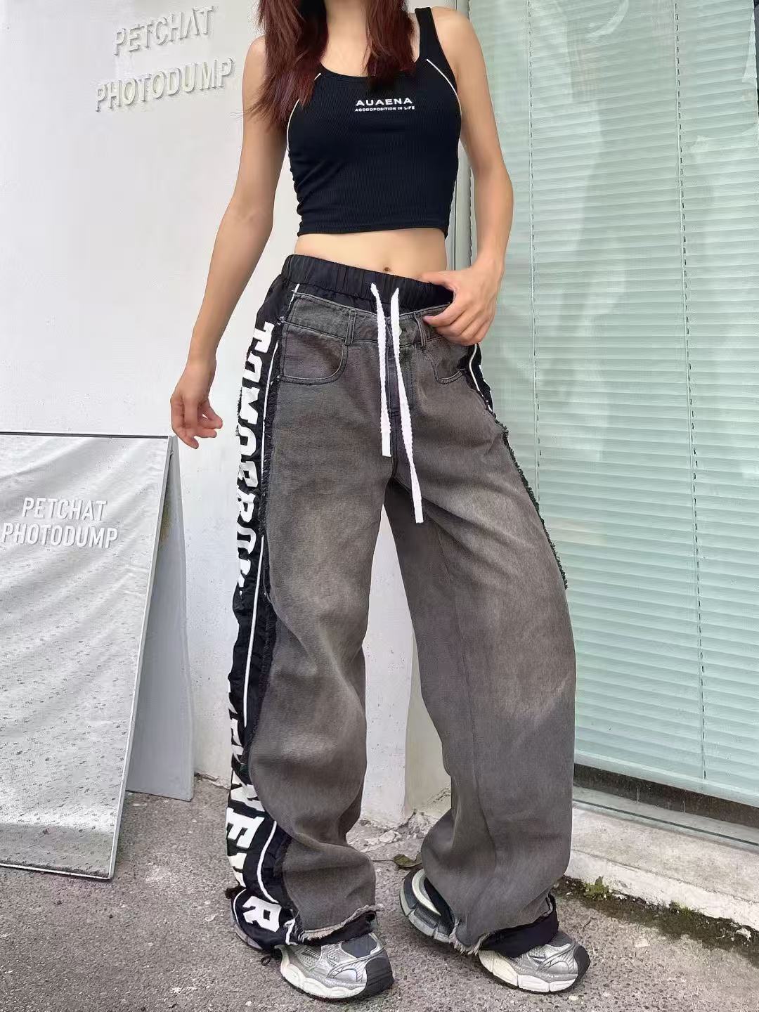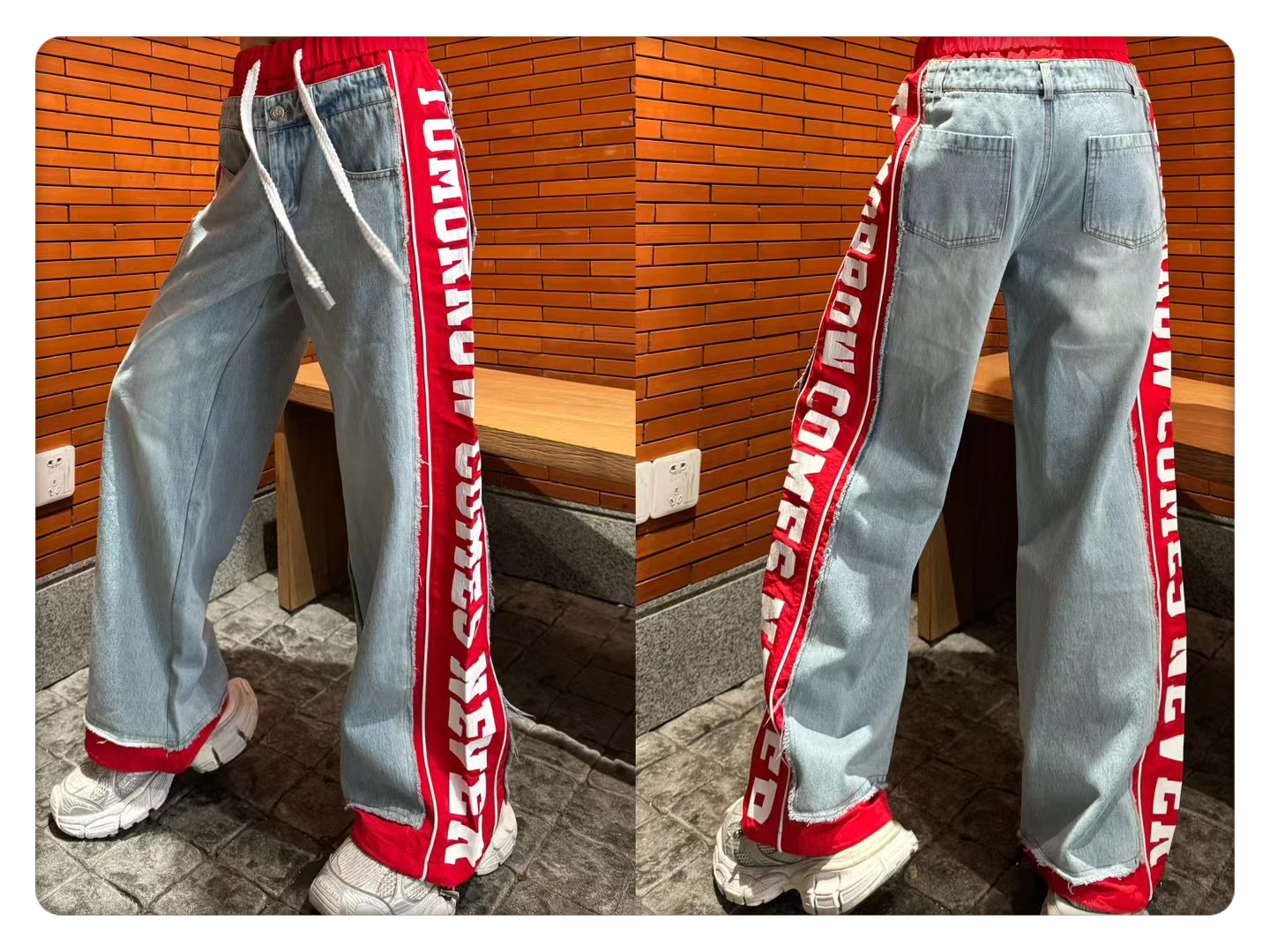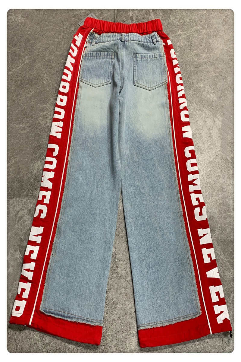 유럽풍 여성용 청바지 2025 가을 신상 레드 배색 레터 프린트 밴딩 밑단 조절끈 롱팬츠 트렌디스토어 가기
