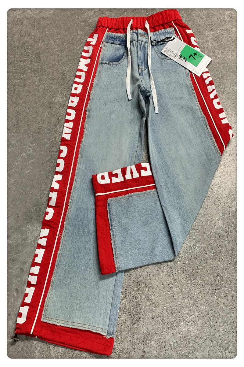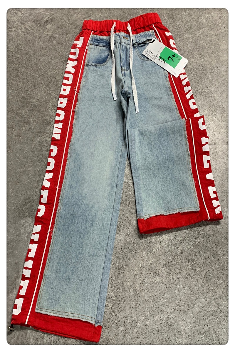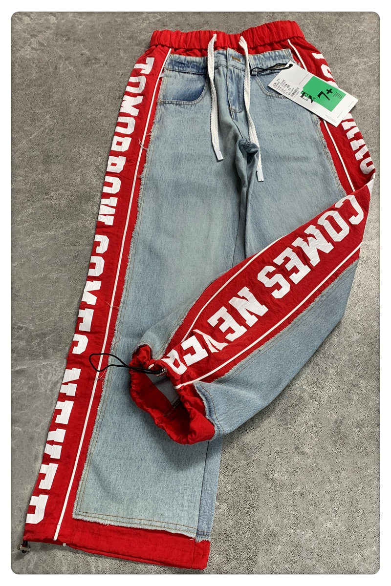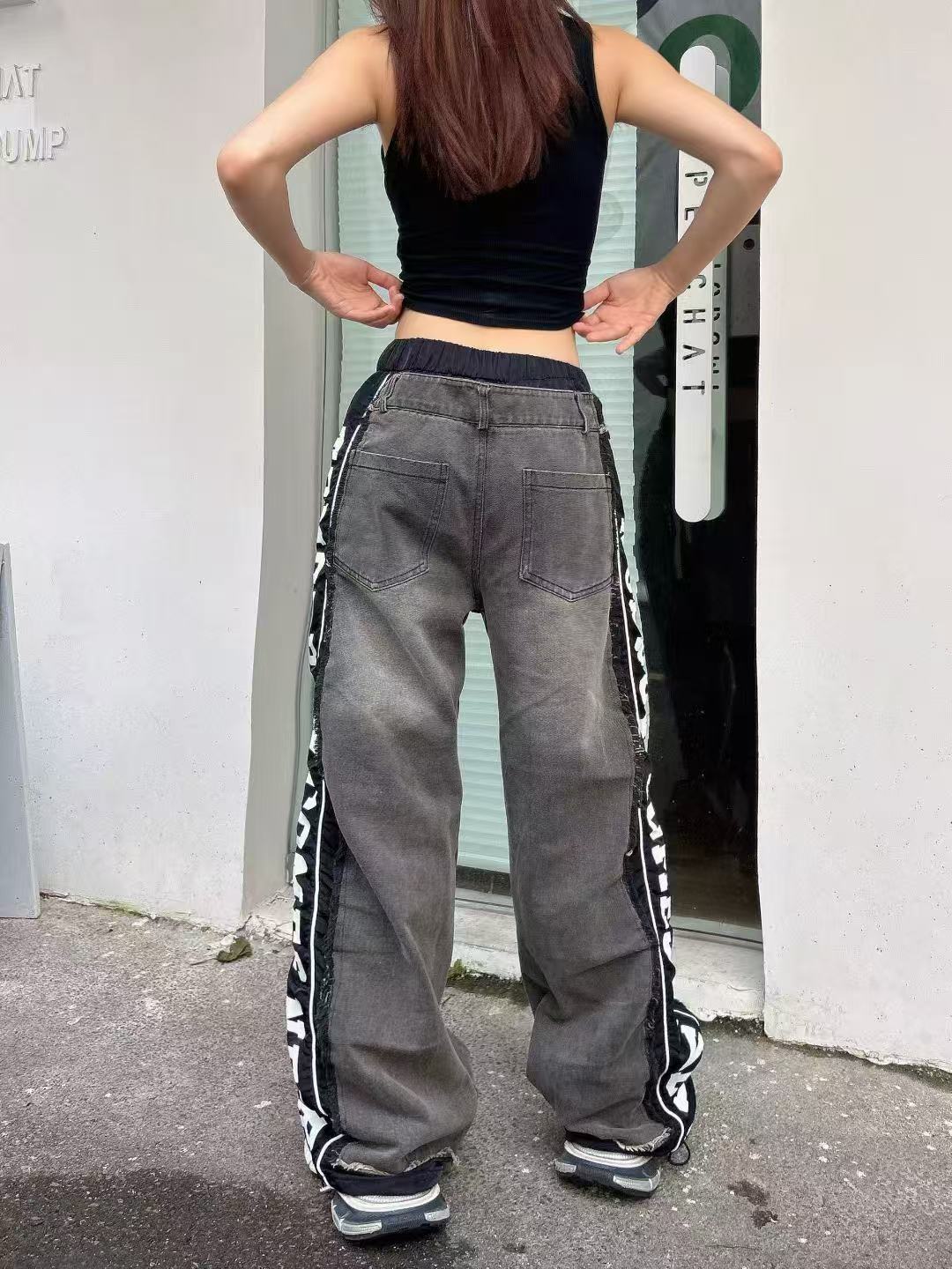 유럽풍 여성용 청바지 2025 가을 신상 레드 배색 레터 프린트 밴딩 밑단 조절끈 롱팬츠 트렌디스토어 가기