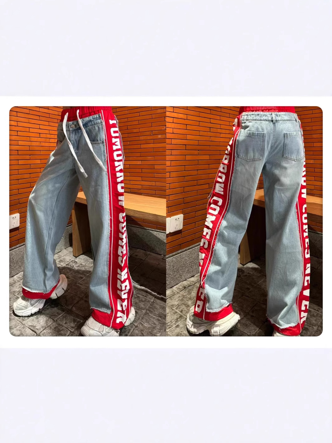 유럽풍 여성용 청바지 2025 가을 신상 레드 배색 레터 프린트 밴딩 밑단 조절끈 롱팬츠 트렌디