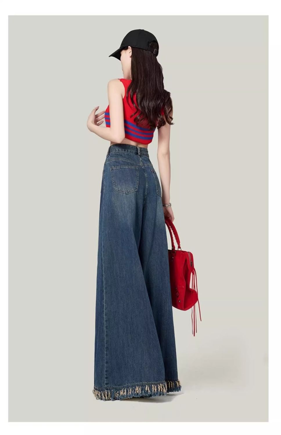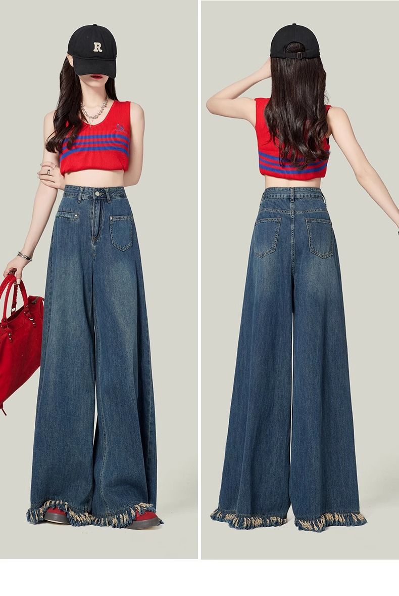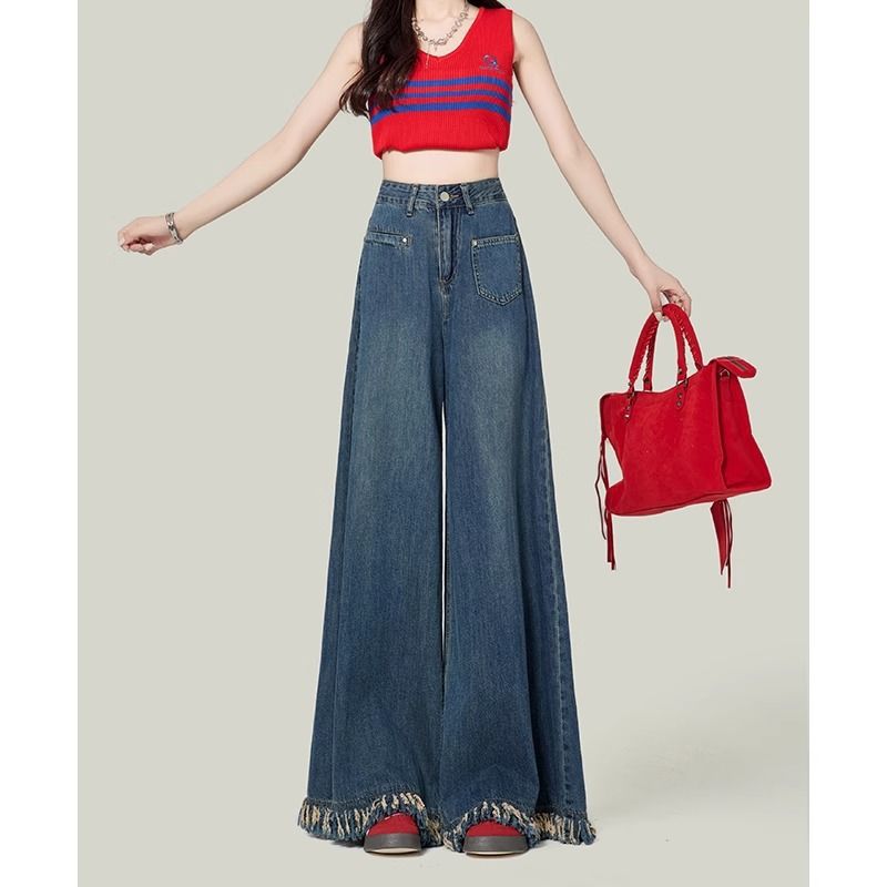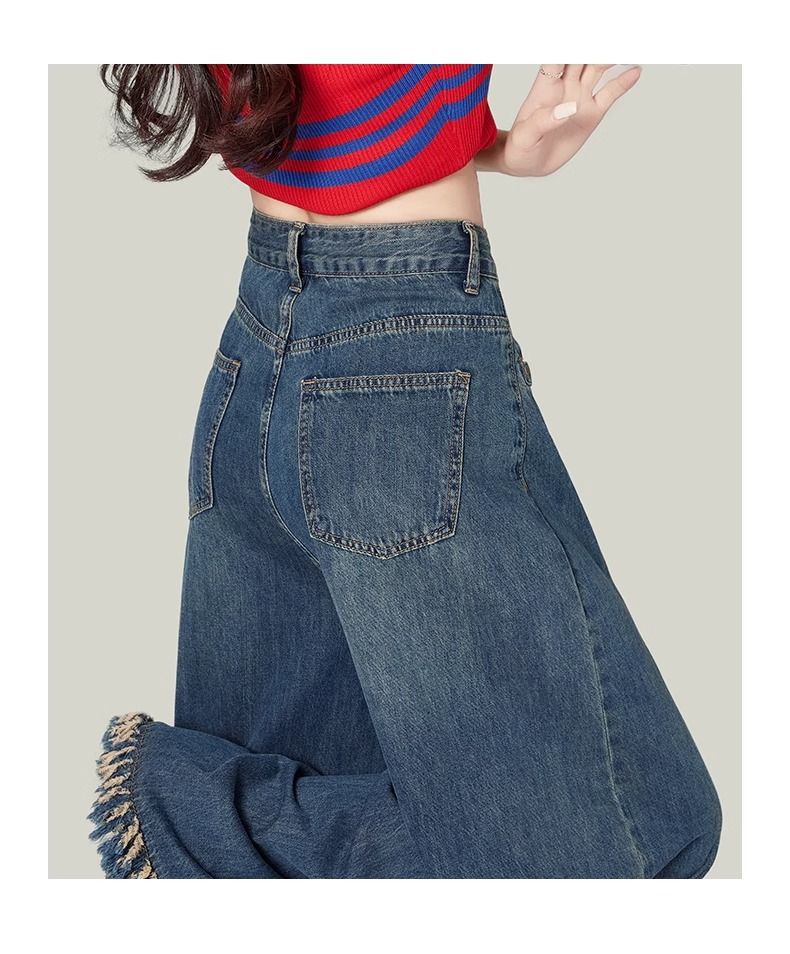 높은 허리 느슨한 모피 가장자리 2025 봄 가을 한국 스타일 우아한 서양식 모든 경기 복고풍 넓은 다리 바지 청바지스토어 가기