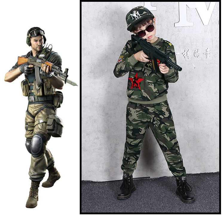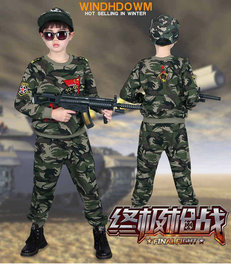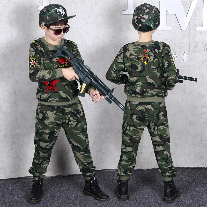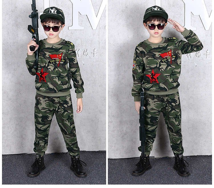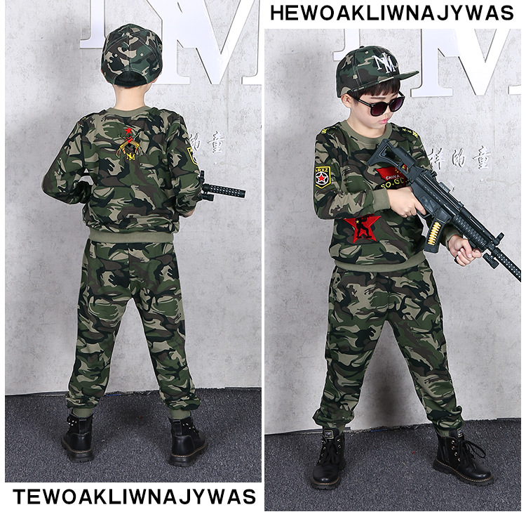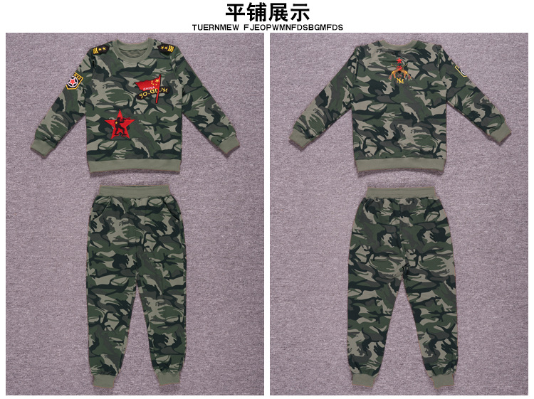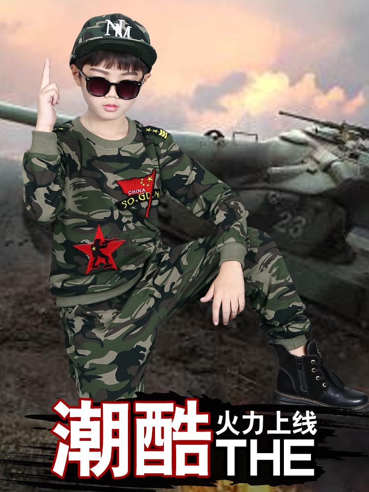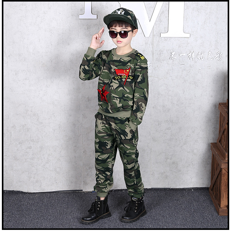 소년의 가을 세트 2024 새로운 소년 캐주얼 위장 대형 어린이를위한 두 조각 유행 군사 훈련 의류스토어 가기