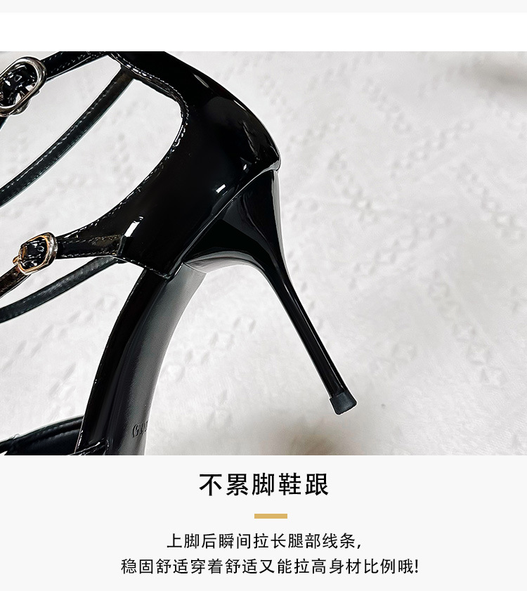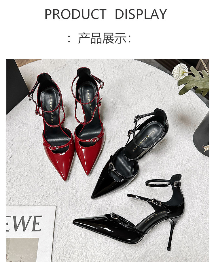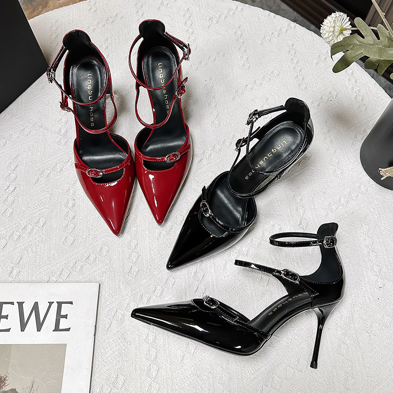529-8 높이 8cm 뾰족한 앞코, 여성 인터넷 연예인 스타일의 얇은 스트랩 3개, 페이턴트 가죽 중공 샌들, 하이힐스토어 가기