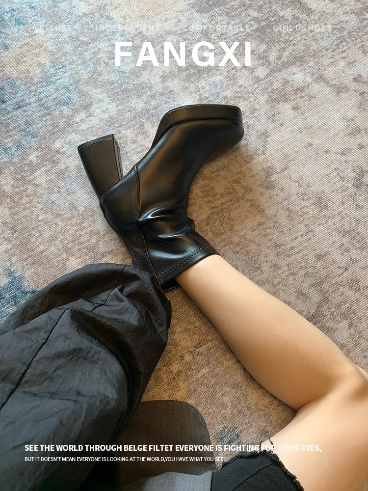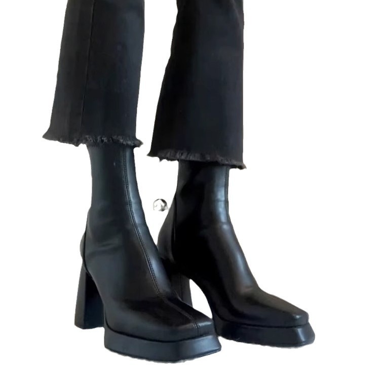 프랑스 하이힐 발목 부츠 여자 2024 새로운 슬림 스퀘어 헤드 스트레치 얇은 부츠 두꺼운 힐 플랫폼 첼시 부츠스토어 가기