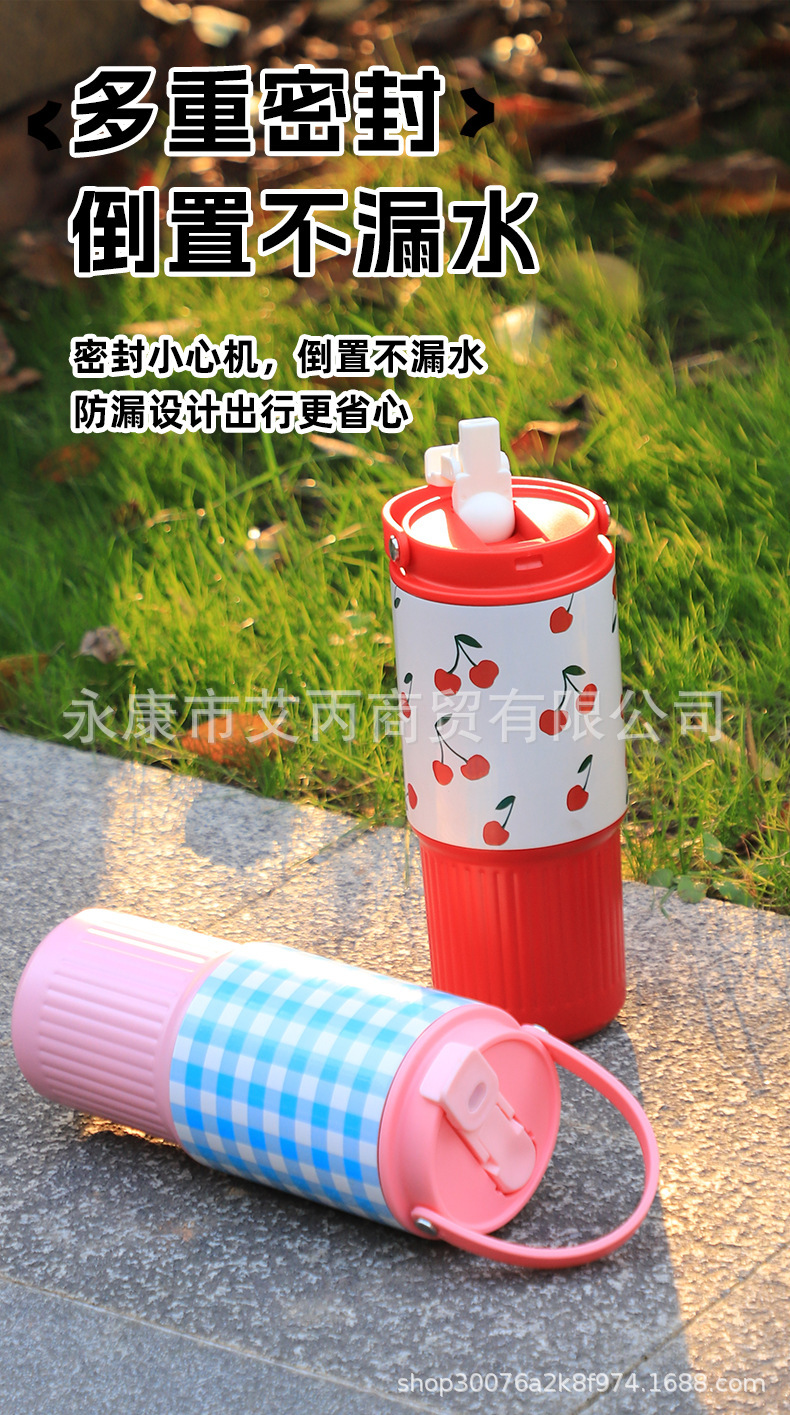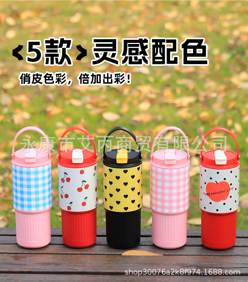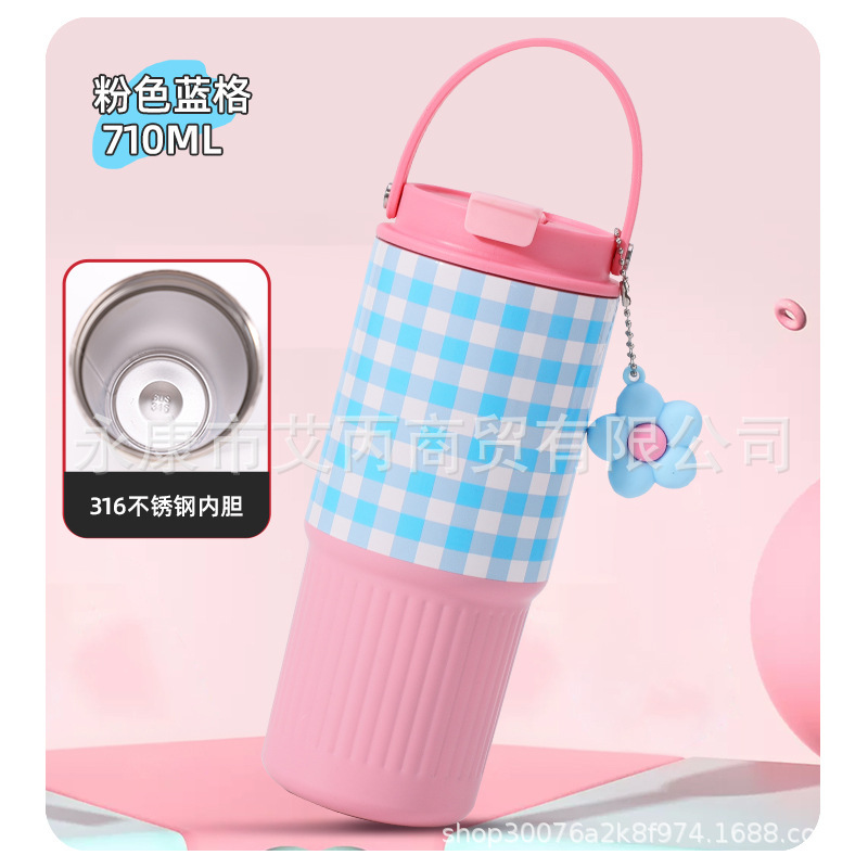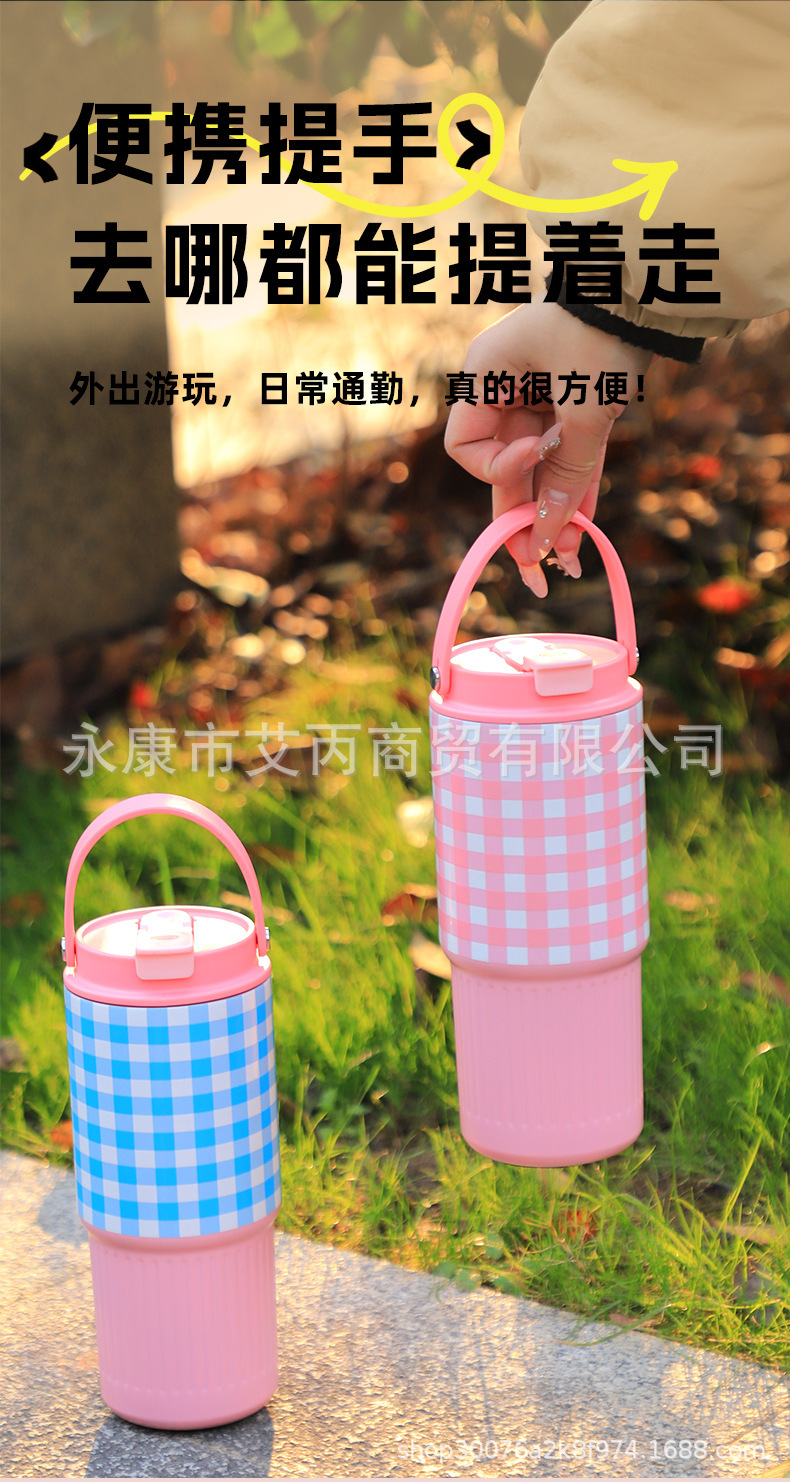 새로운 304 스테인레스 스틸 보온병 컵 독창적 인 격자 무늬 대형 아이스 컵 핸들 밀짚 자동차 컵 도매