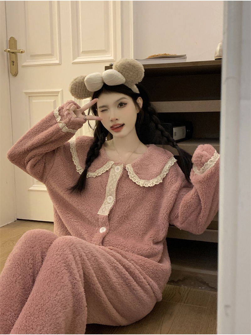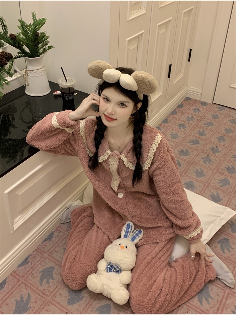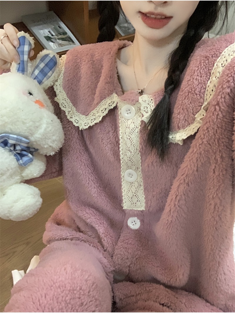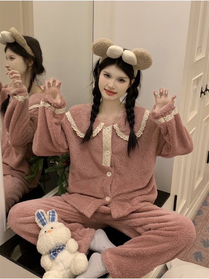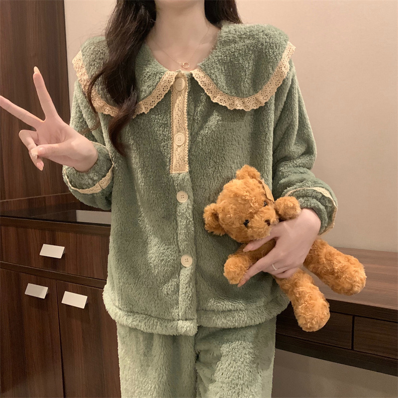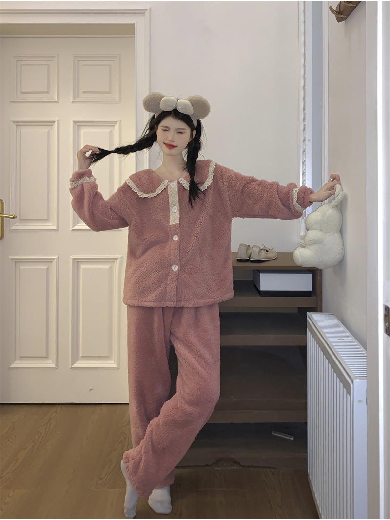 2024 새로운 가을과 겨울 잠옷 여성의 산호 양털 두꺼운 따뜻한 착용 플란넬 홈 의류 세트 여성스토어 가기