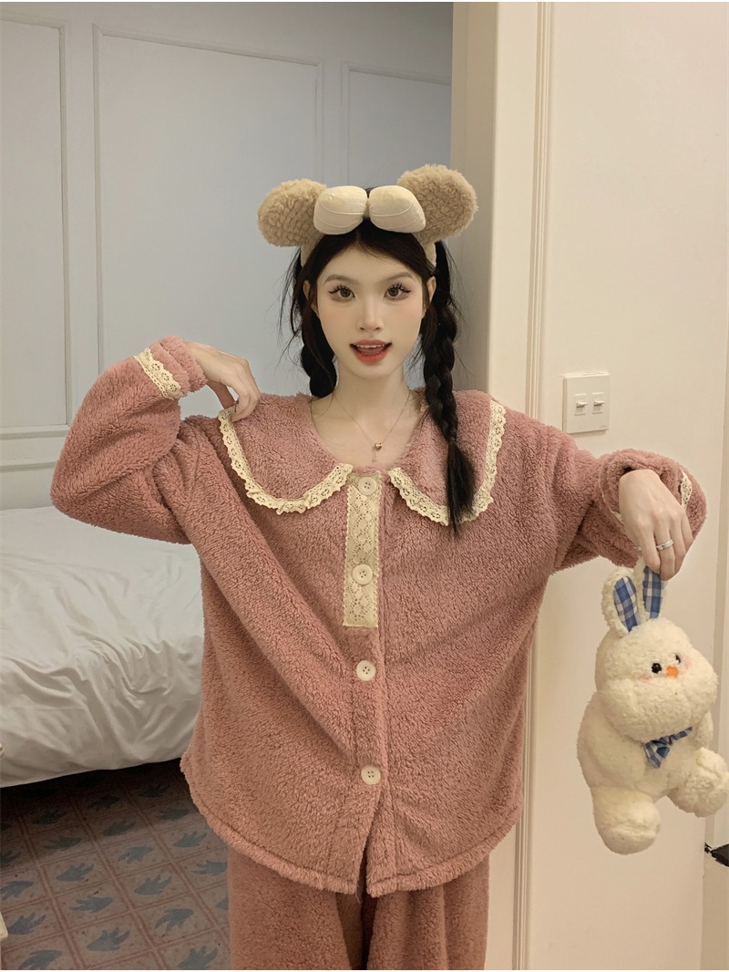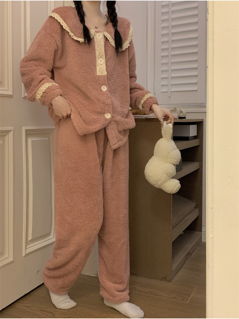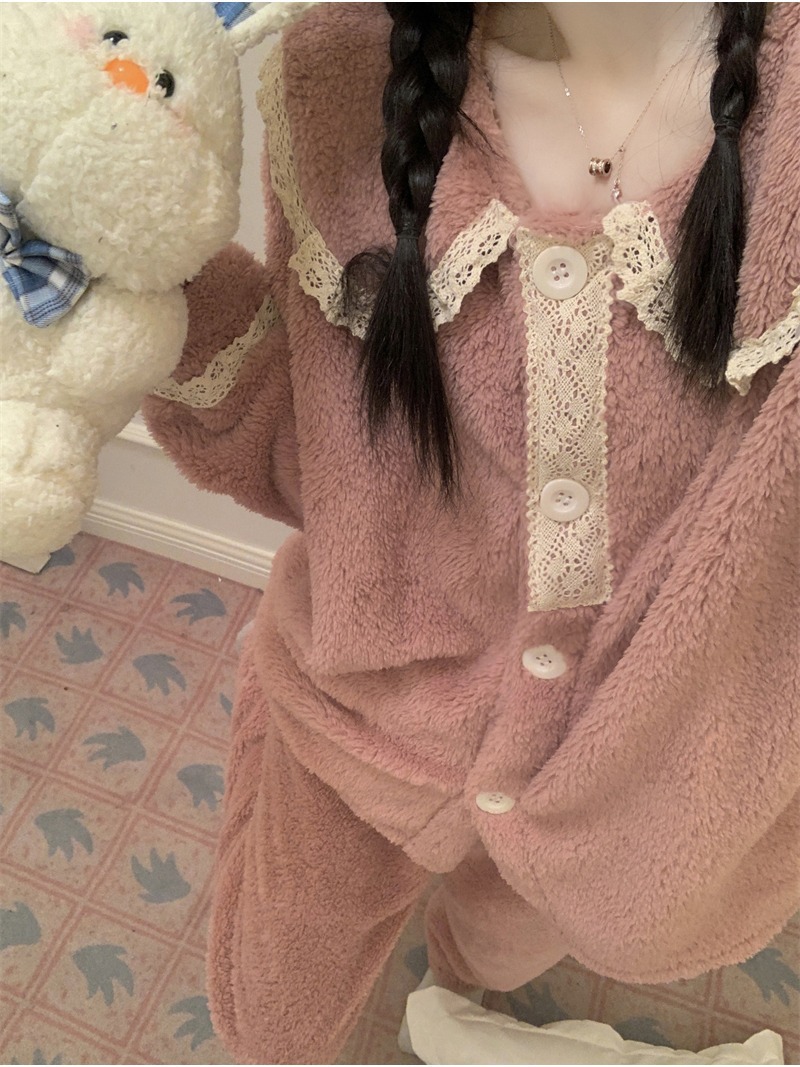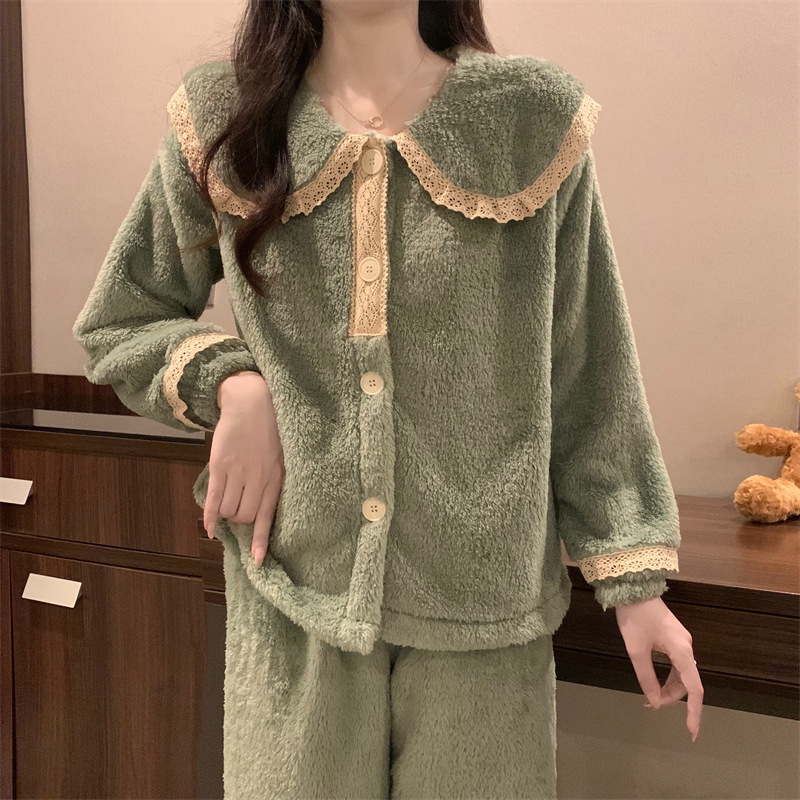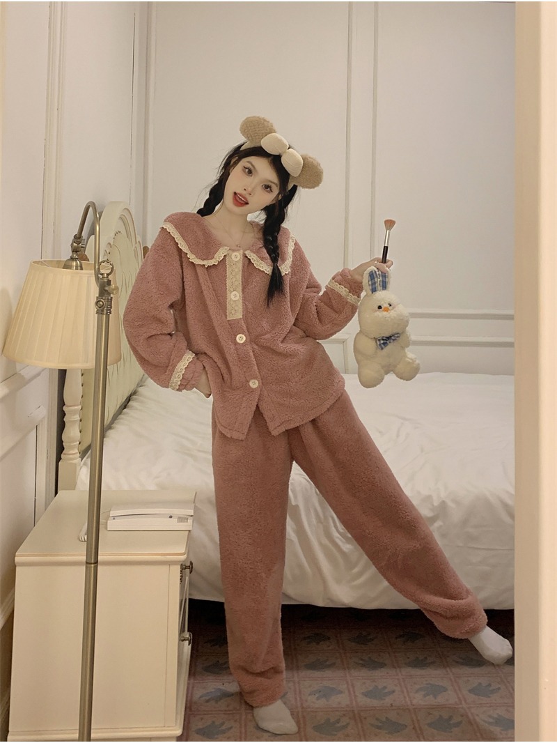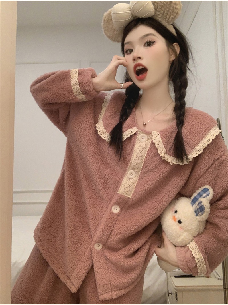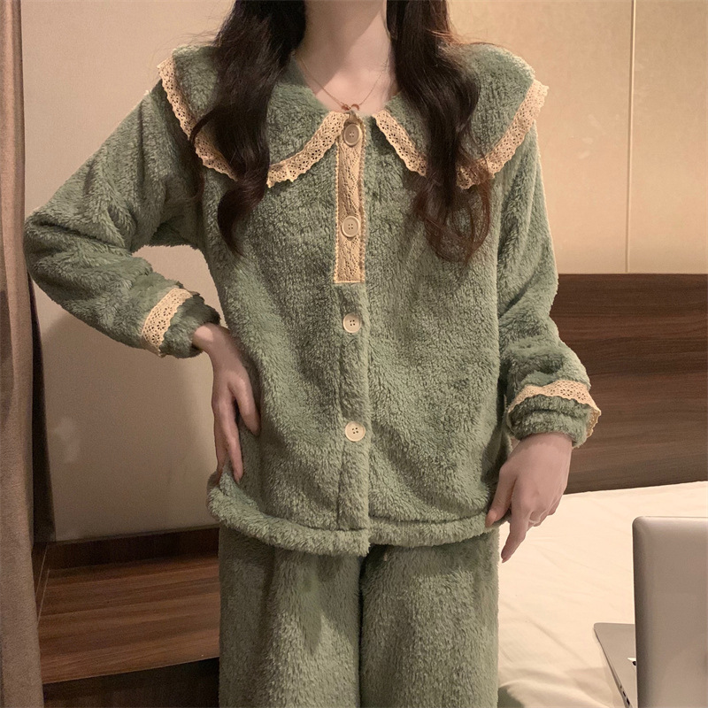 2024 새로운 가을과 겨울 잠옷 여성의 산호 양털 두꺼운 따뜻한 착용 플란넬 홈 의류 세트 여성스토어 가기