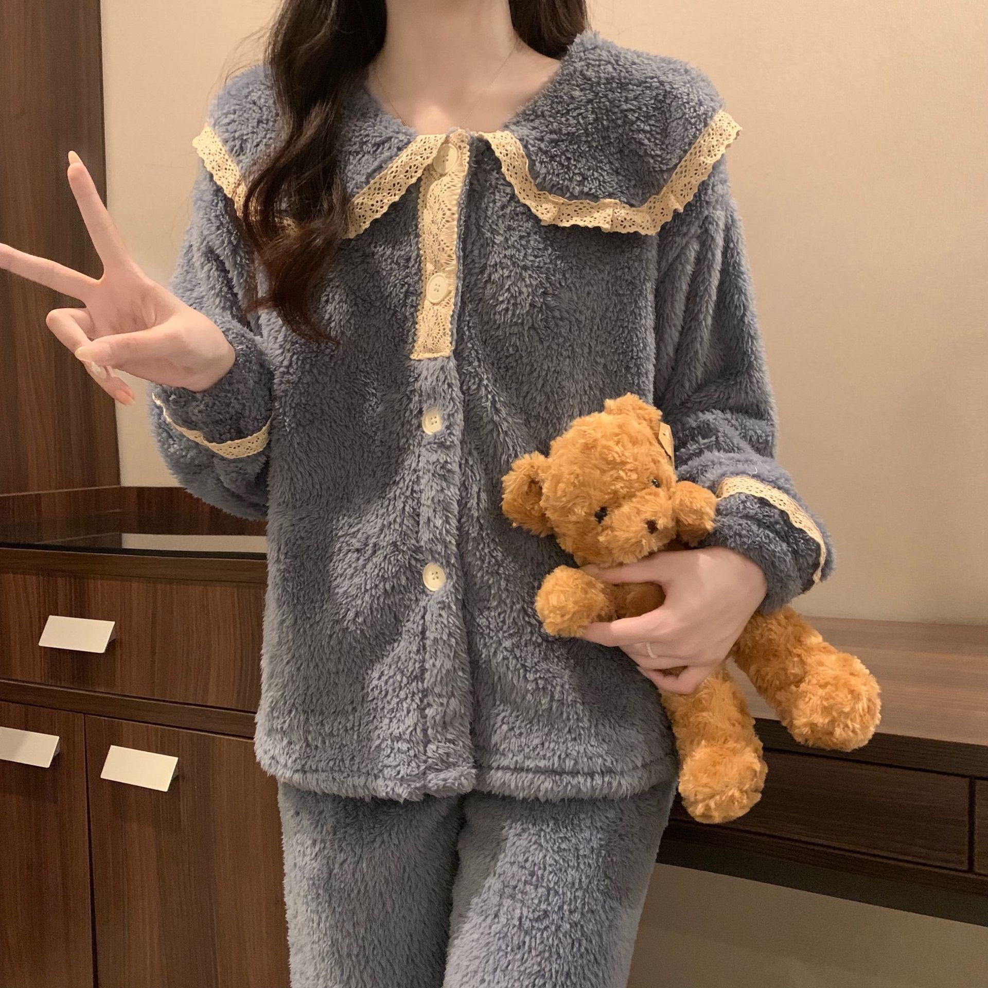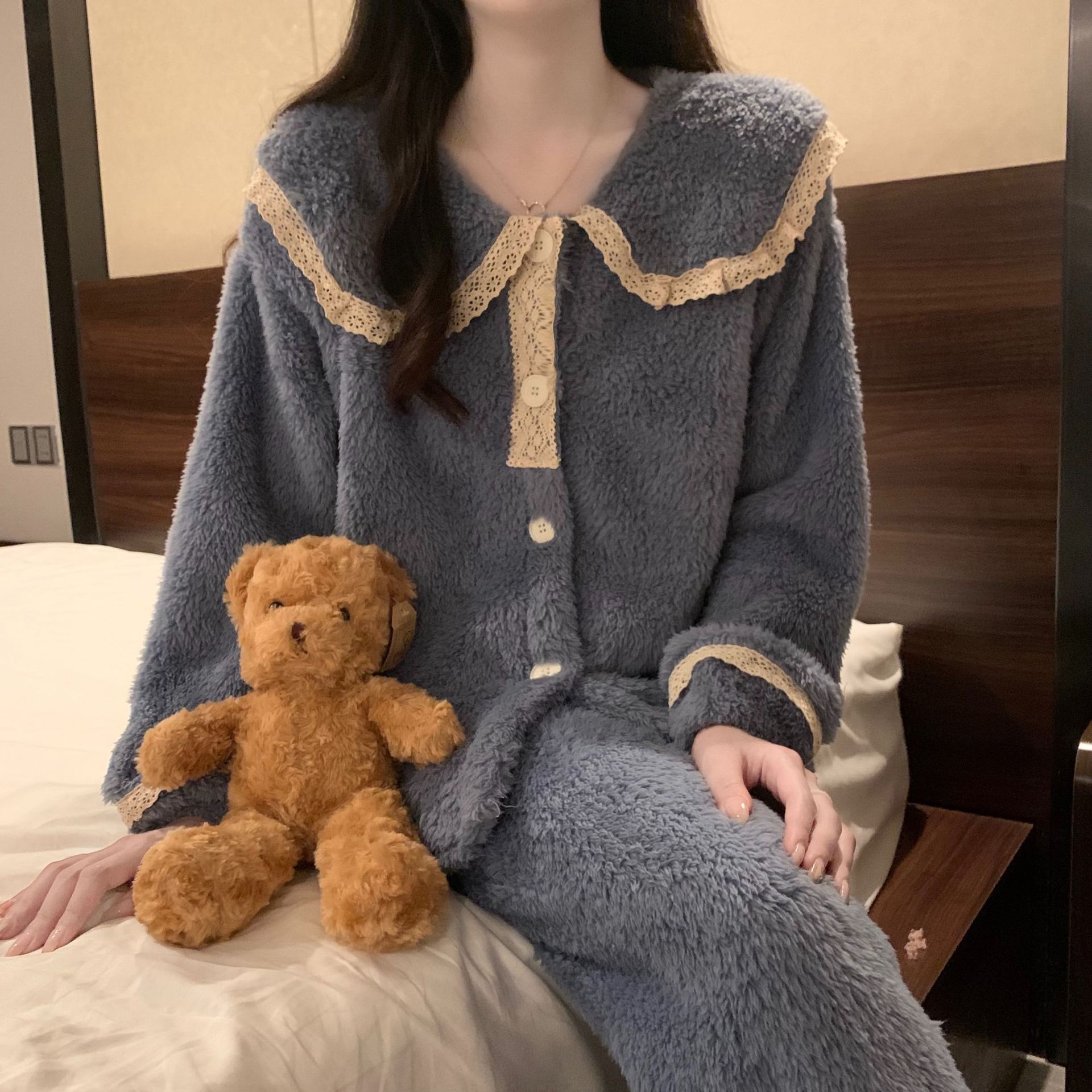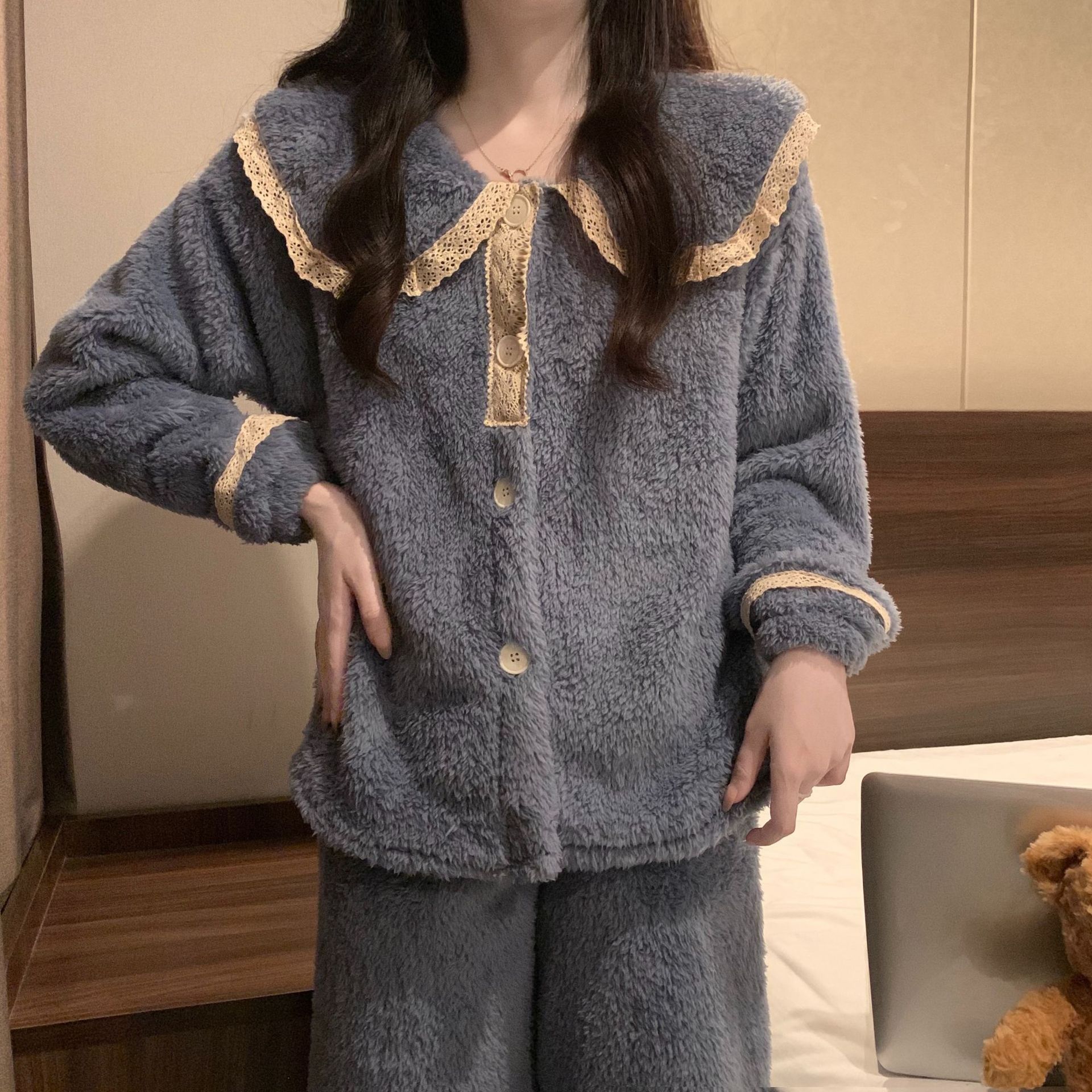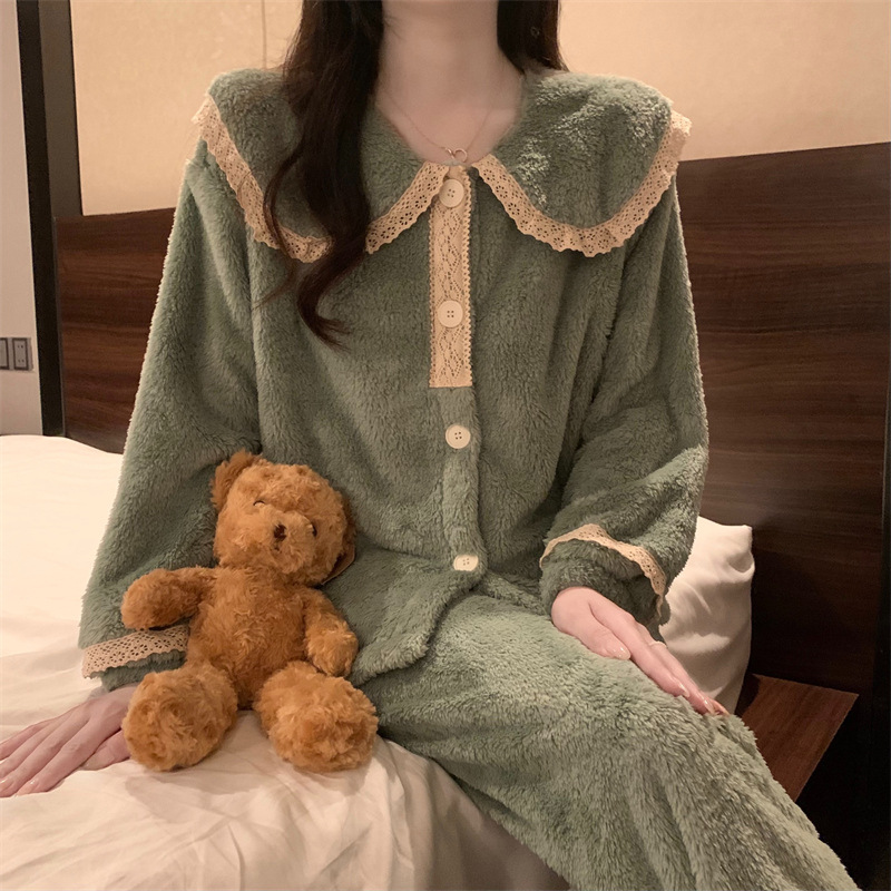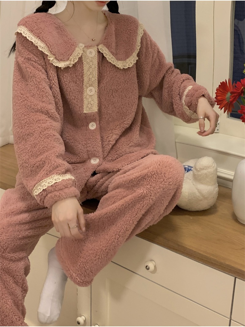 2024 새로운 가을과 겨울 잠옷 여성의 산호 양털 두꺼운 따뜻한 착용 플란넬 홈 의류 세트 여성스토어 가기