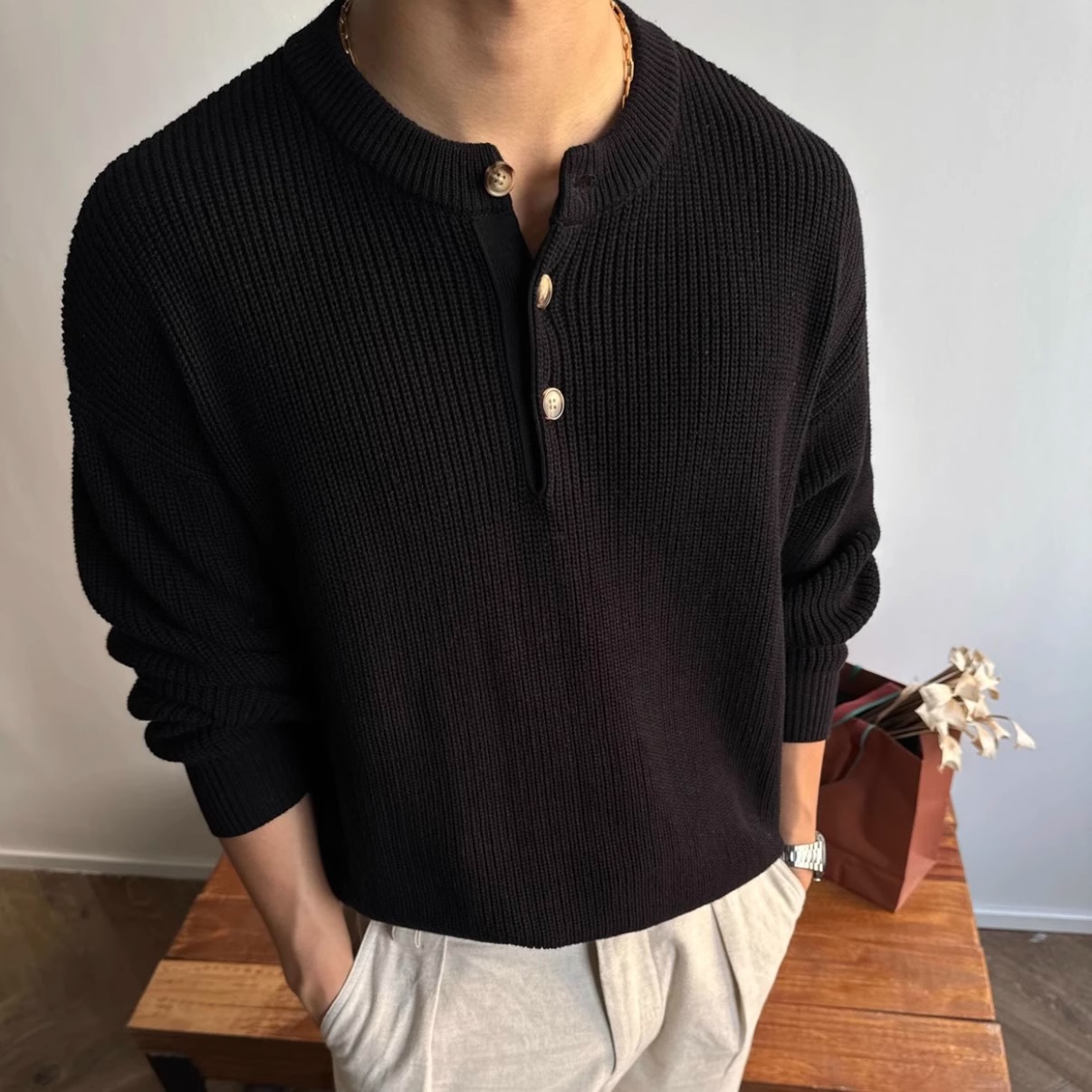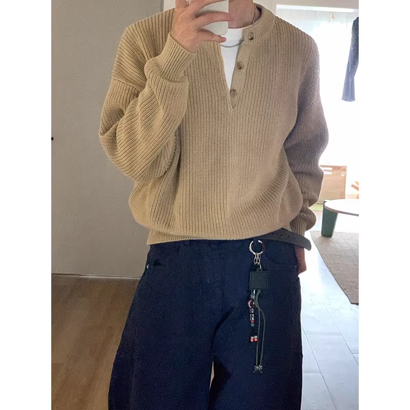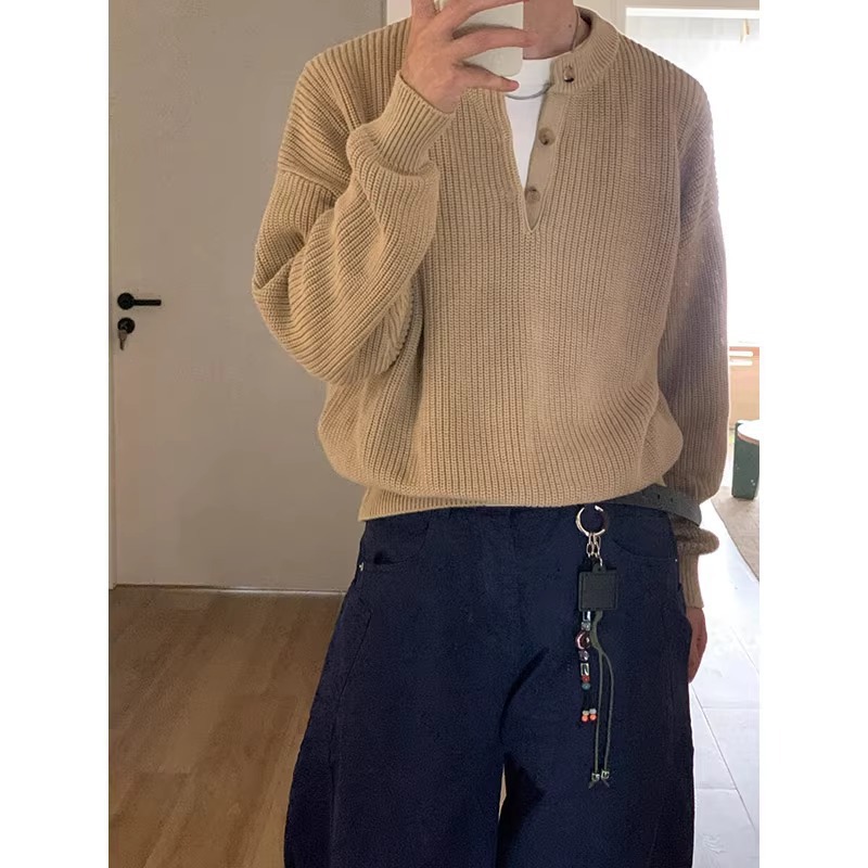올드 Qian Feng 헨리 칼라 스웨터 남자 겨울 클렌핏 아메리칸 스타일 레트로 폴로 니트 셔츠 게으른 베이스 셔츠스토어 가기