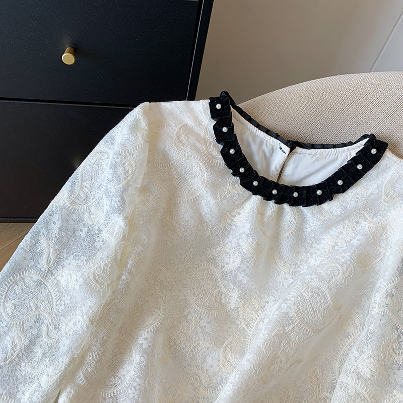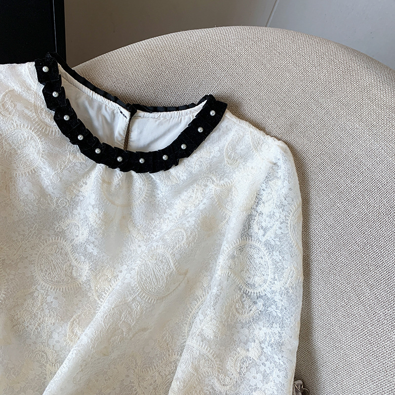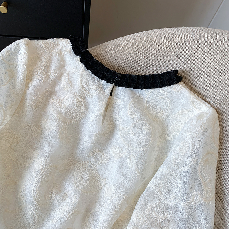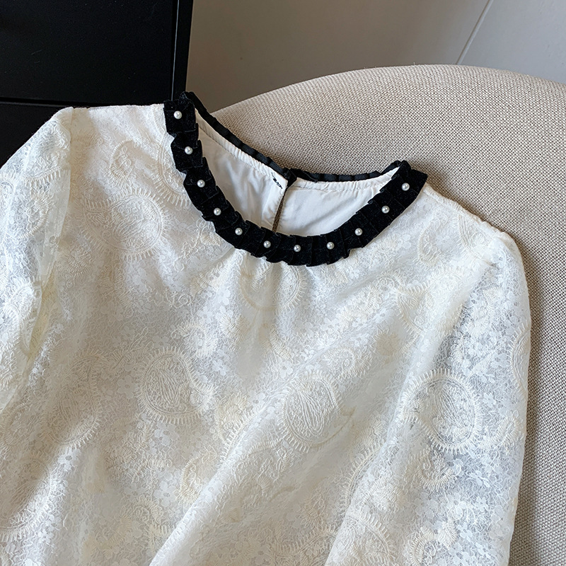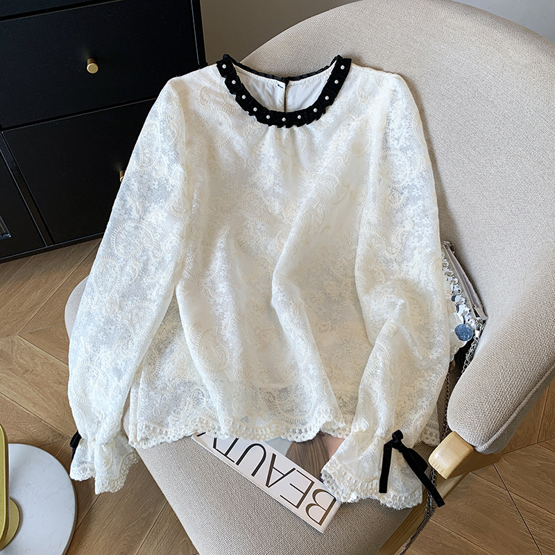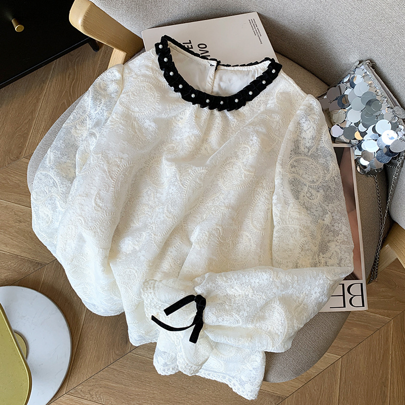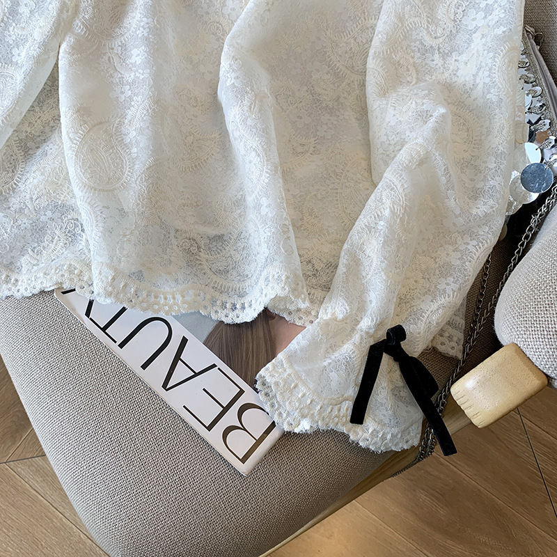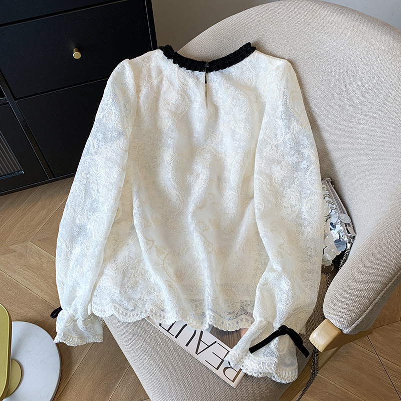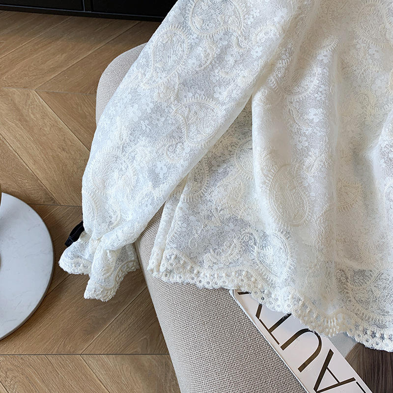 实拍 春季蕾丝花边重工刺绣花纹淑女上衣雪纺蝴蝶结袖口衬衫