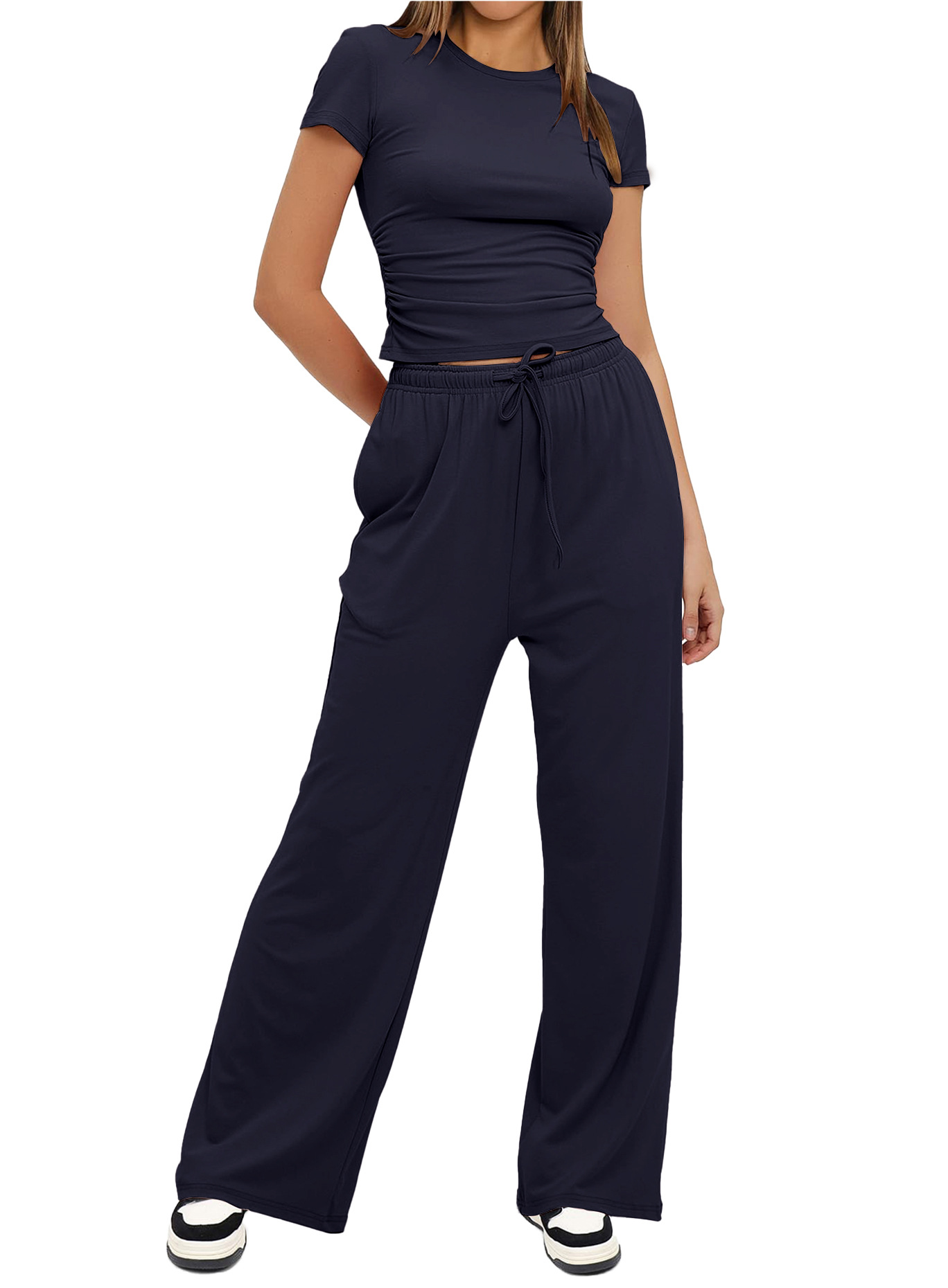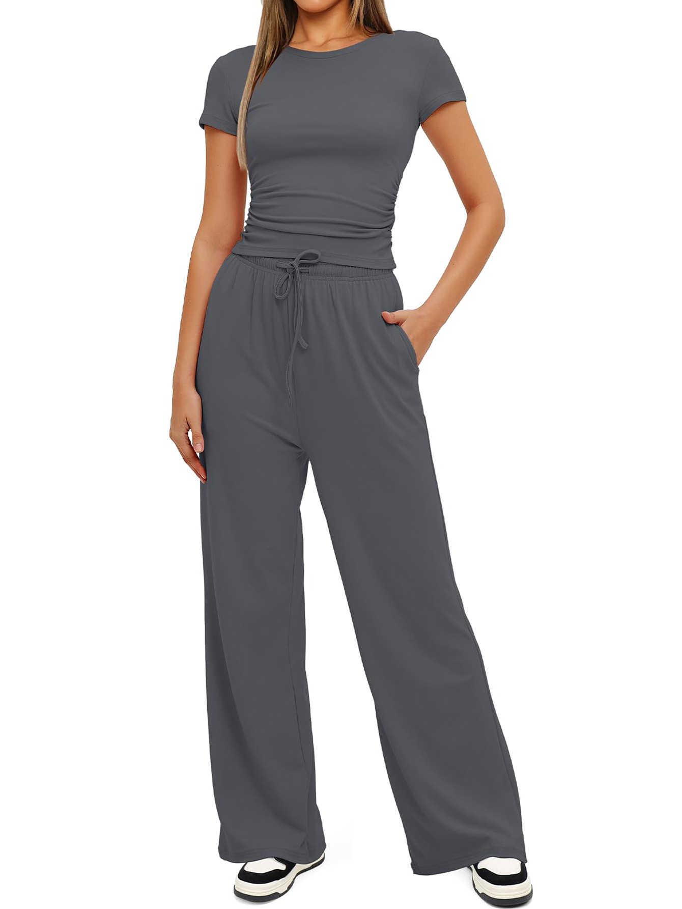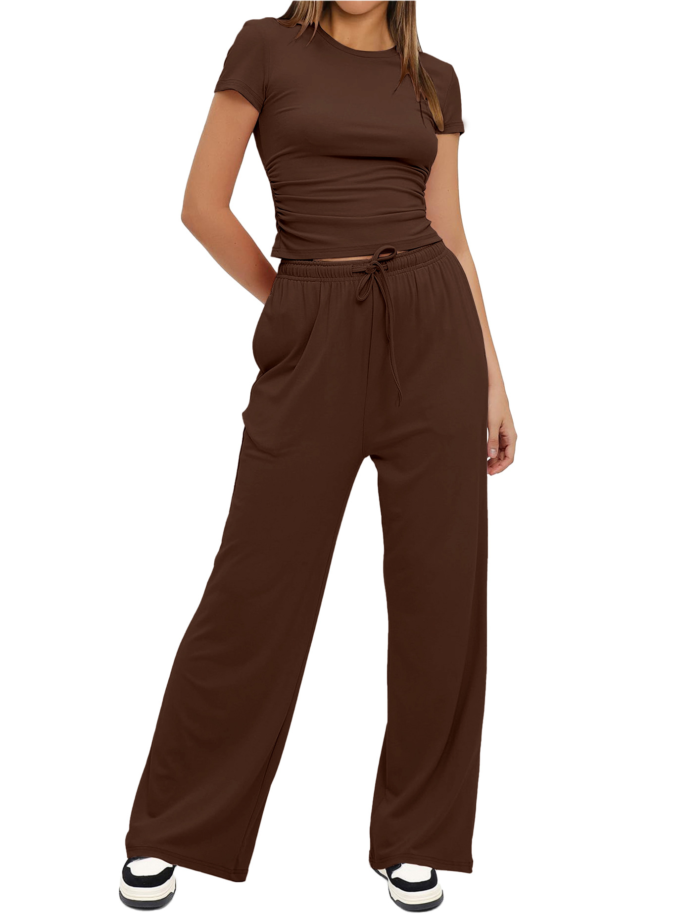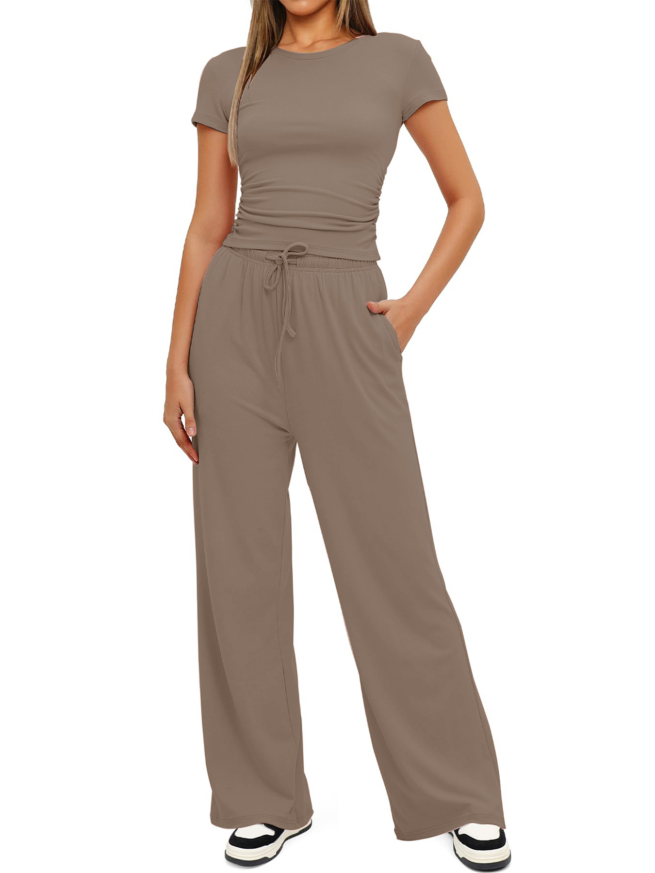 2025년 유럽 및 미국 아마존 신상품 단색 캐주얼 긴팔 세트 상의 하이웨이스트 와이드 팬츠 운동복스토어 가기