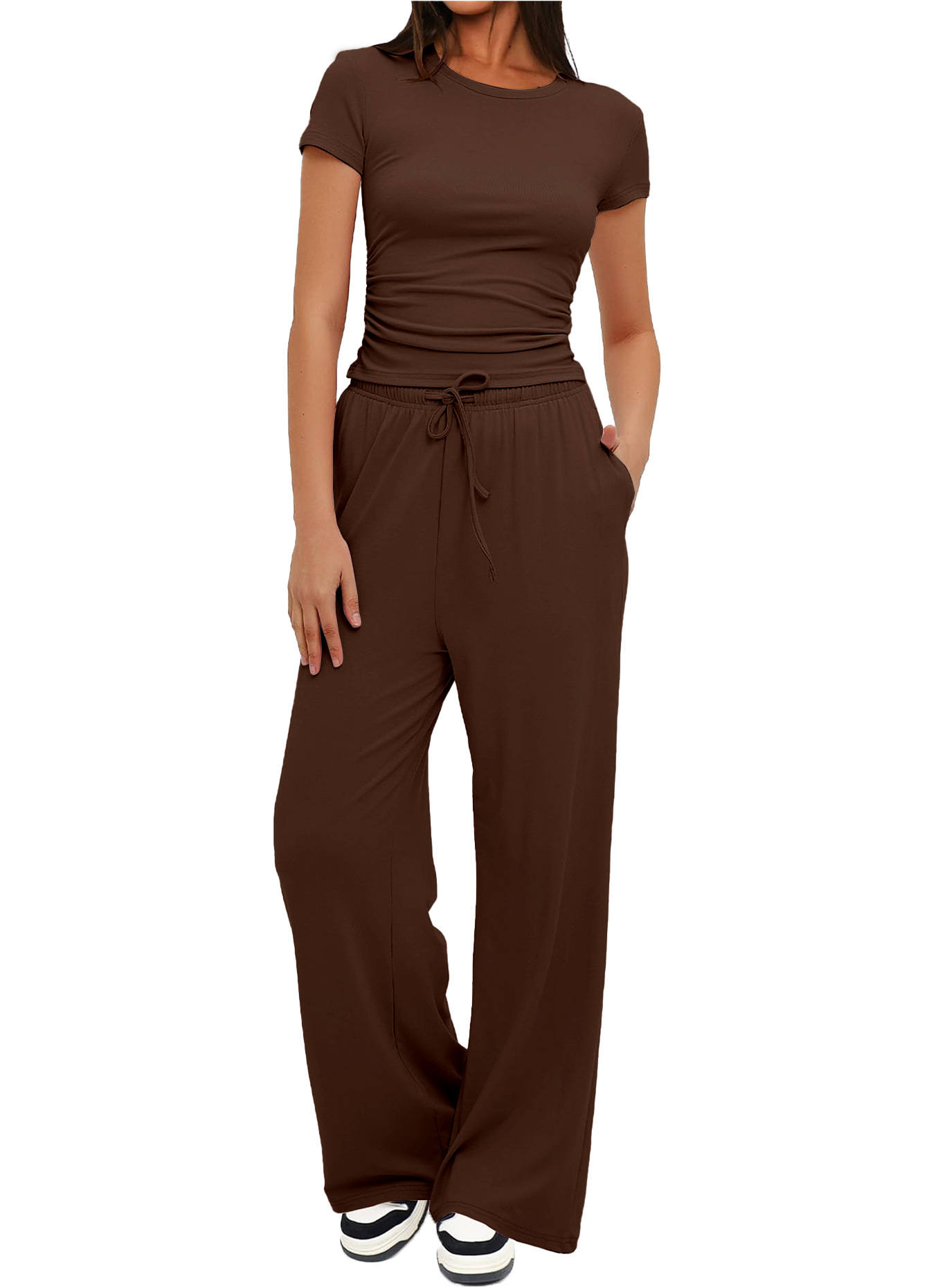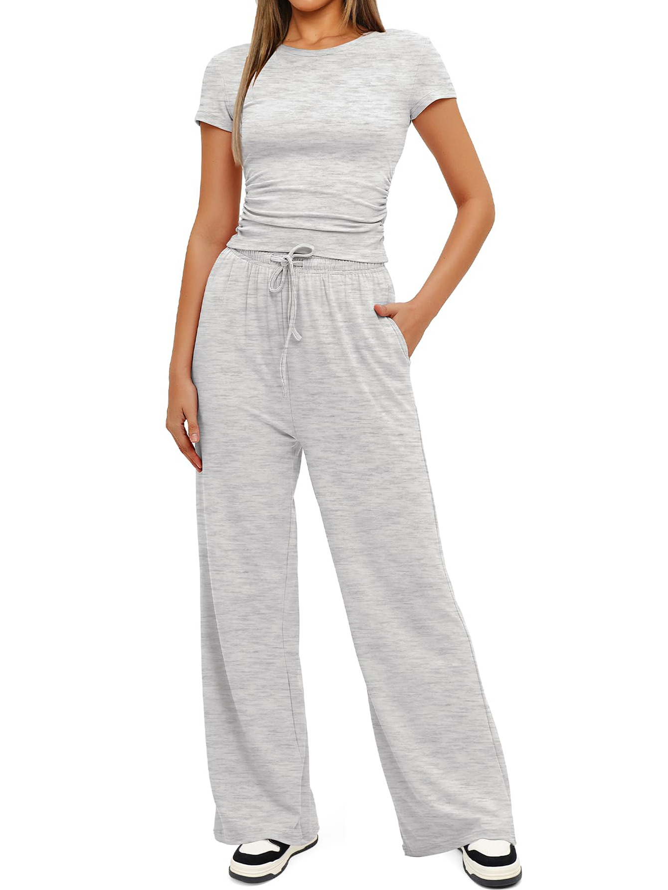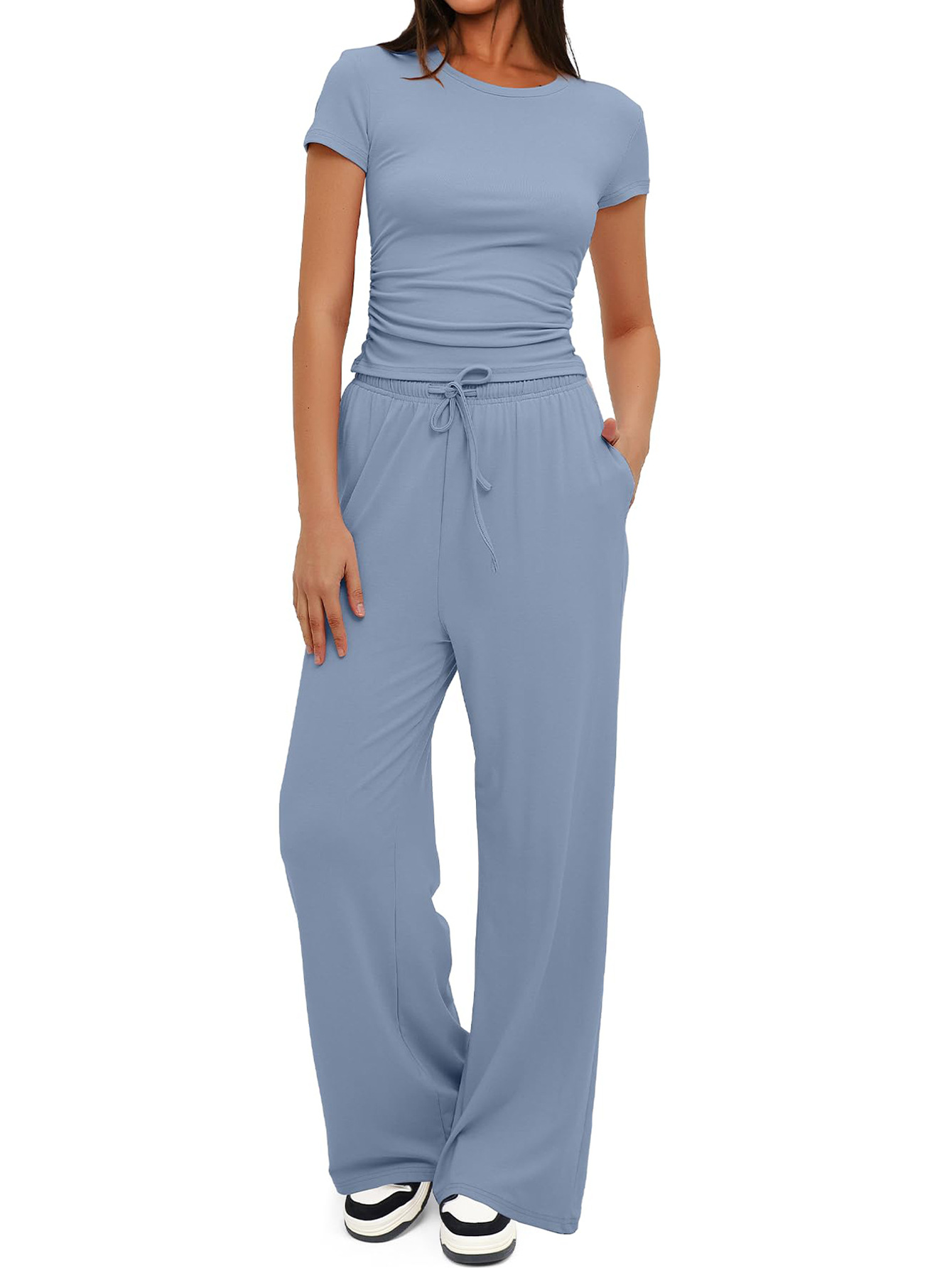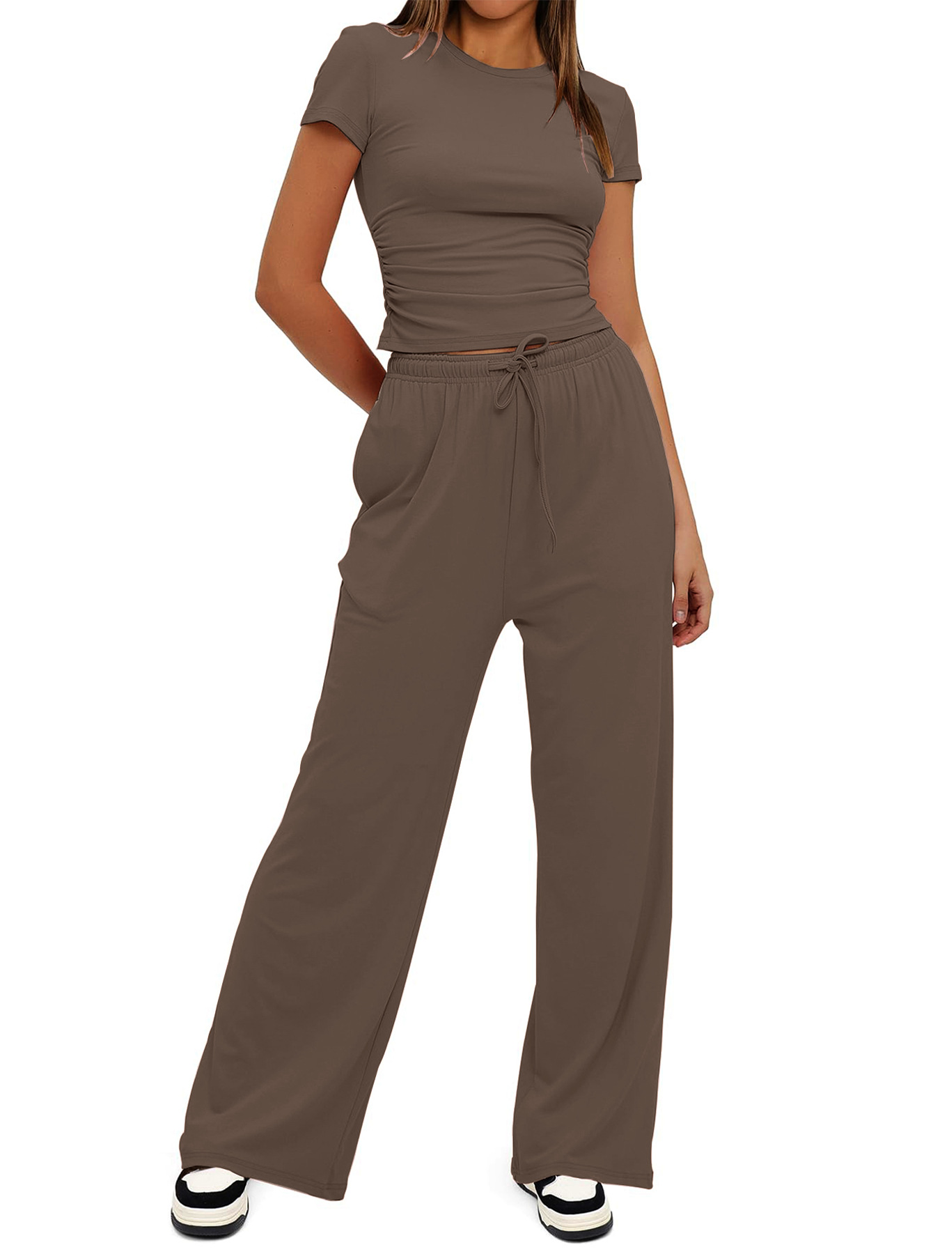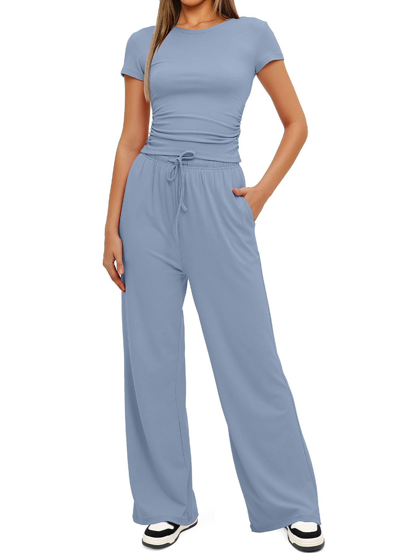 2025년 유럽 및 미국 아마존 신상품 단색 캐주얼 긴팔 세트 상의 하이웨이스트 와이드 팬츠 운동복스토어 가기