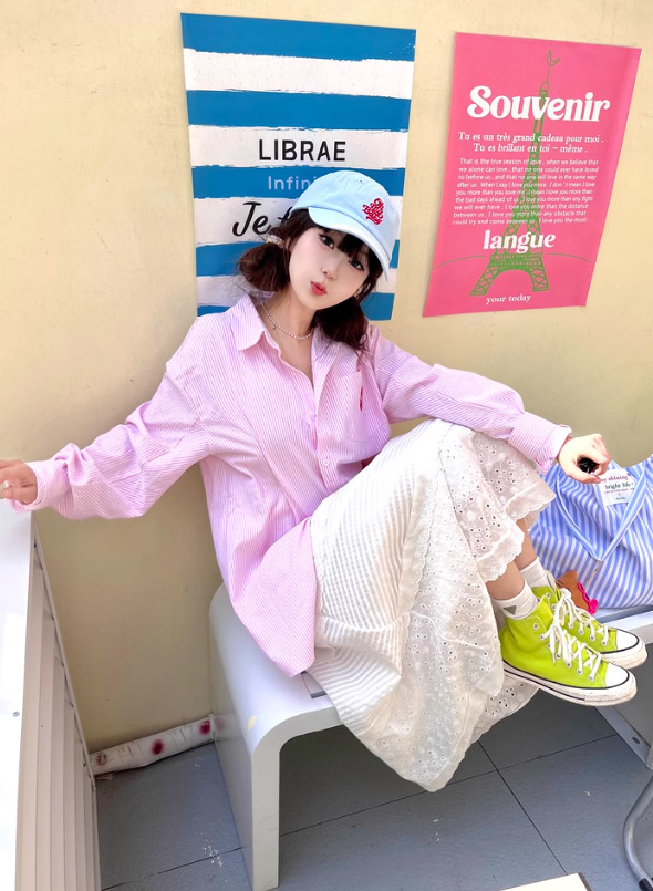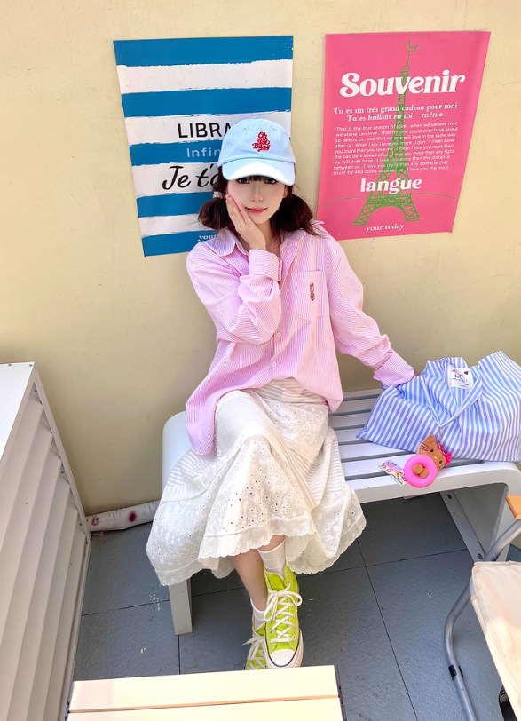일본 스타일 달콤한 토끼 줄무늬 긴팔 셔츠 여성의 봄과 가을 느슨한 프랑스 디자인 틈새 캐주얼 올 매치 탑스토어 가기