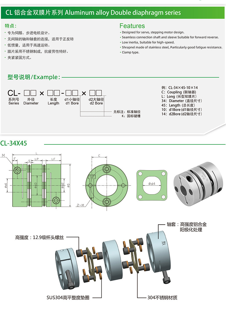 CL 알루미늄 합금 더블 다이어프램 커플링 클램핑 서보 스테핑 모터 모터 탄성 라미네이트 커플링
