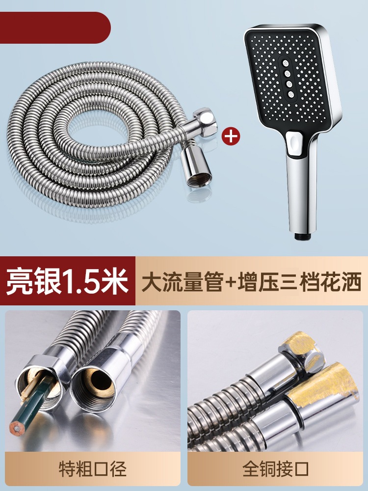 • ✅1.5m 은색 대담한 큰 물 출력 암호화 방폭 파이프 + 3스톱 사각 부스터 샤워 헤드