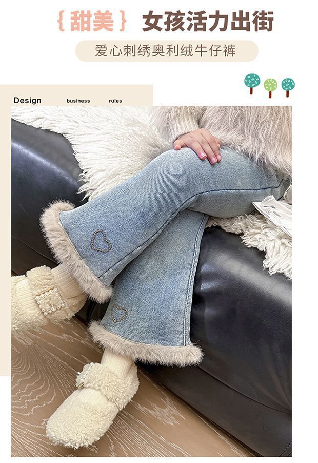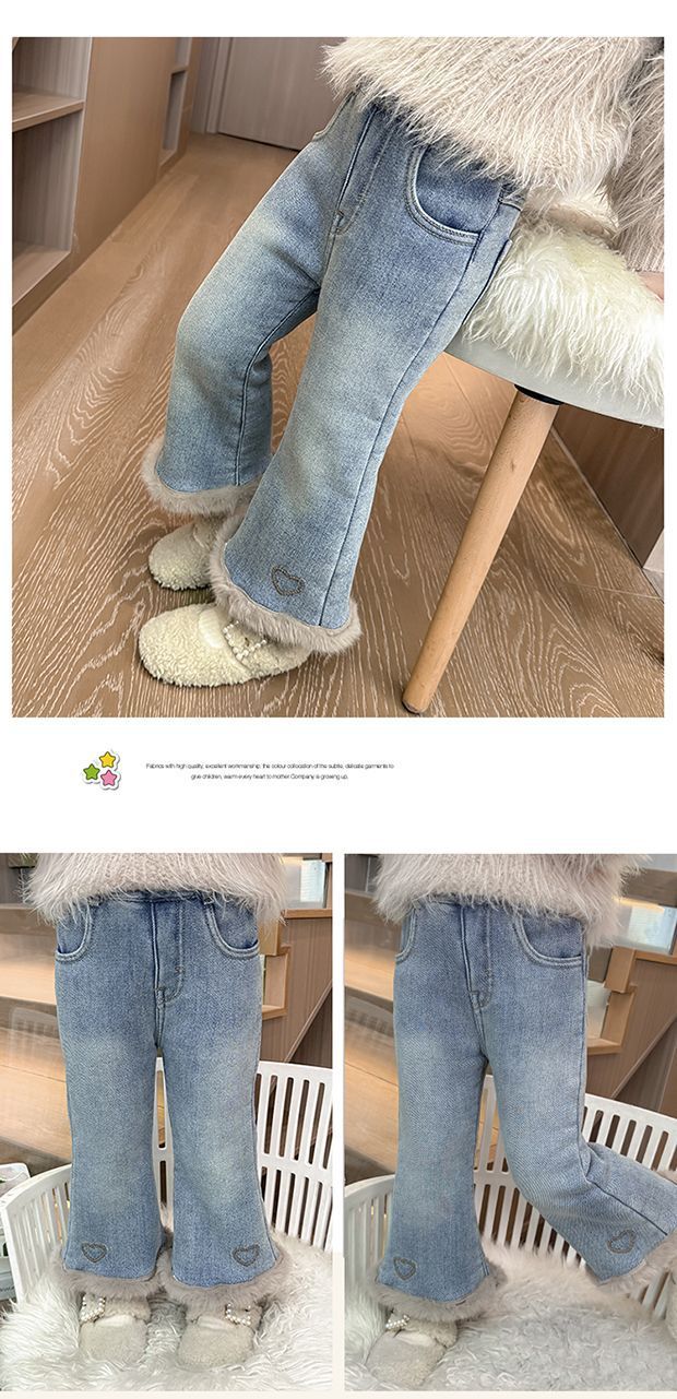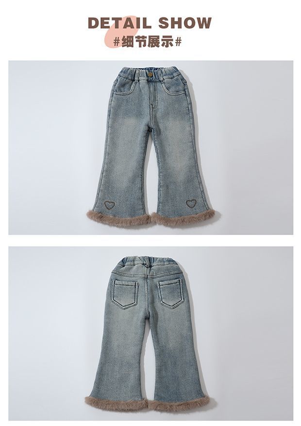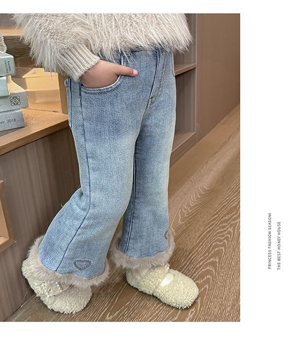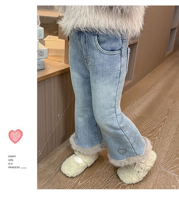 아동복 여아용 플리스 데님 나팔바지 아동 겨울 바지 여아용 한국 스타일 긴바지 두꺼운 보온성