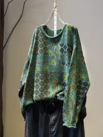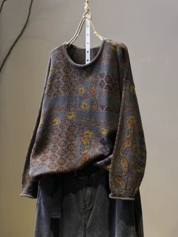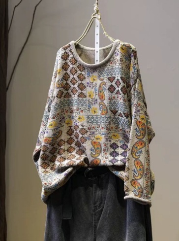 가을과 겨울 새로운 빈티지 인쇄 코튼 니트 스웨터 여성의 느슨한 캐주얼 라운드 넥 긴 소매 풀오버 탑