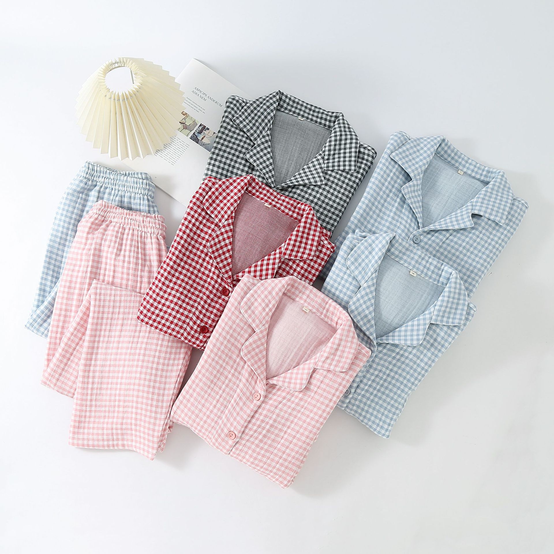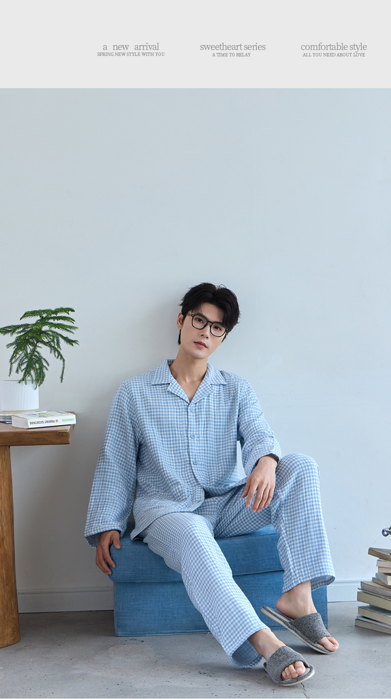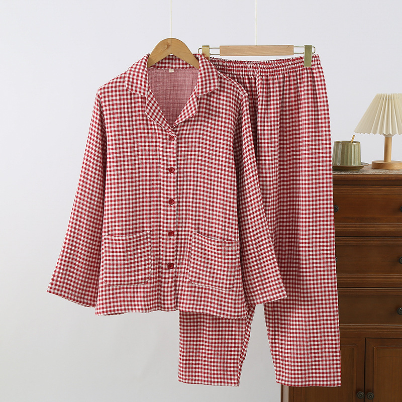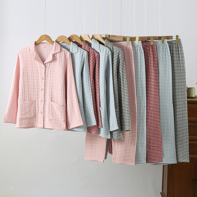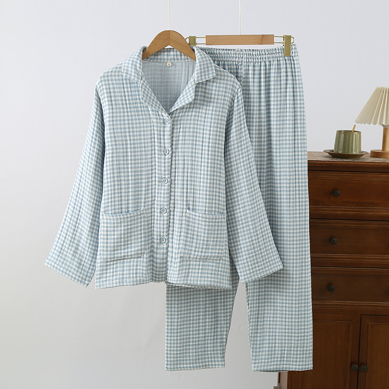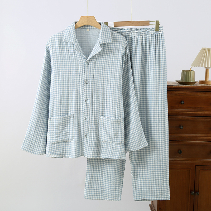 새로운 커플 격자 무늬 헤지 코튼 4 층 원사 홈 옷 가을과 겨울 두꺼운 면 남자와 여자 잠옷 세트스토어 가기