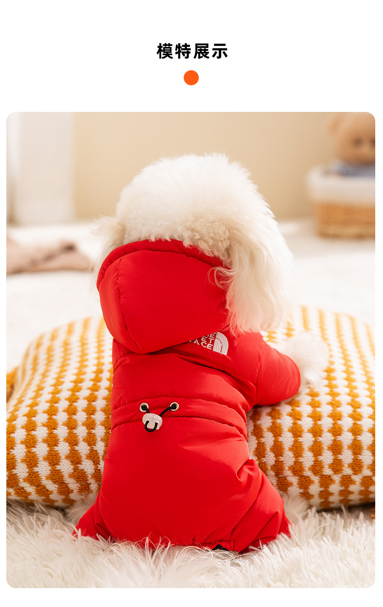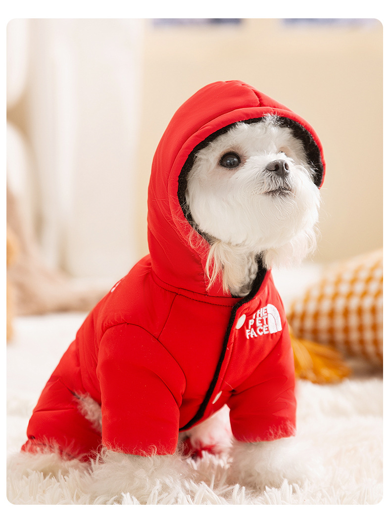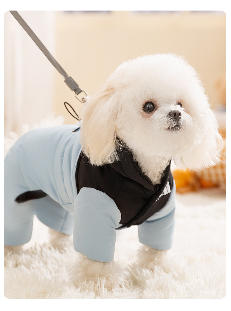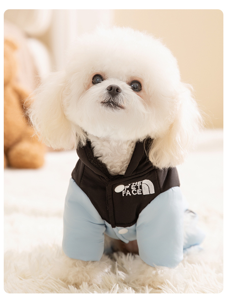 가을과 겨울 개 네 다리면 패딩 따뜻한 대비 컬러 바느질 후드 옷 테디 베어 작은 개 애완 동물 옷스토어 가기