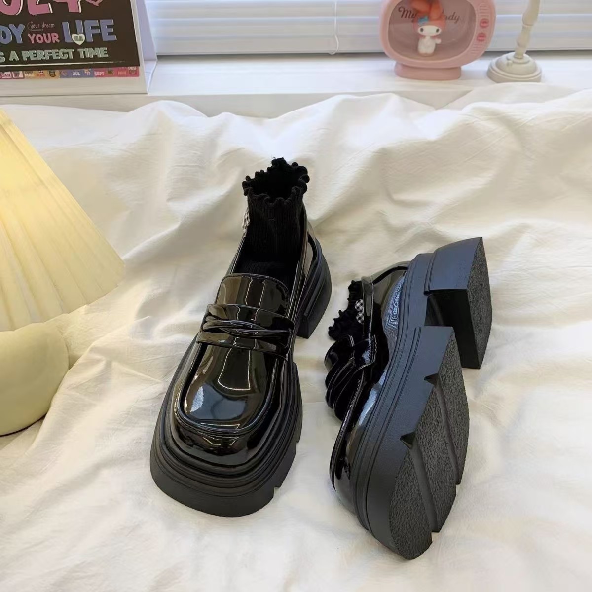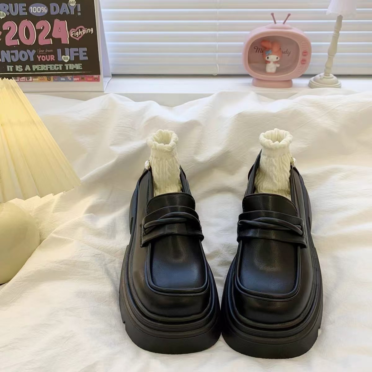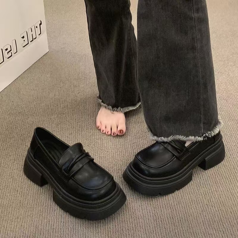 두꺼운 밑창 청키 힐 영국 스타일 가죽 신발 여성의 2025 년 새 봄과 가을 슬립 온 여성 신발 싱글 레이어 신발 블랙 로퍼스토어 가기