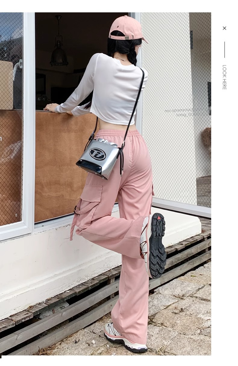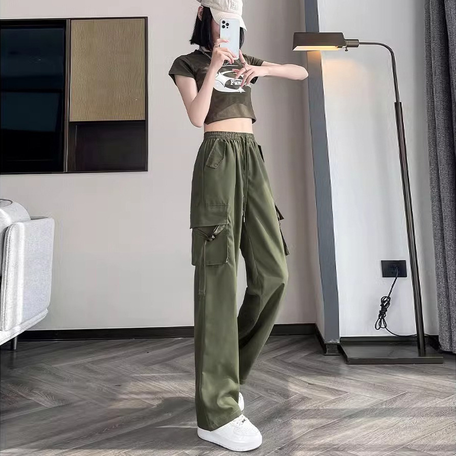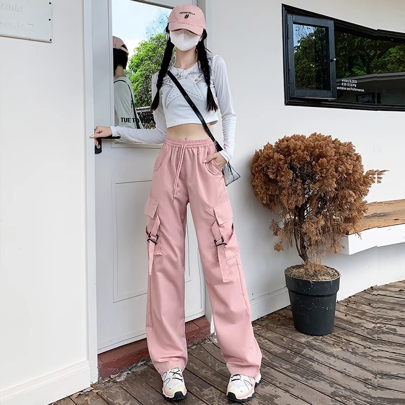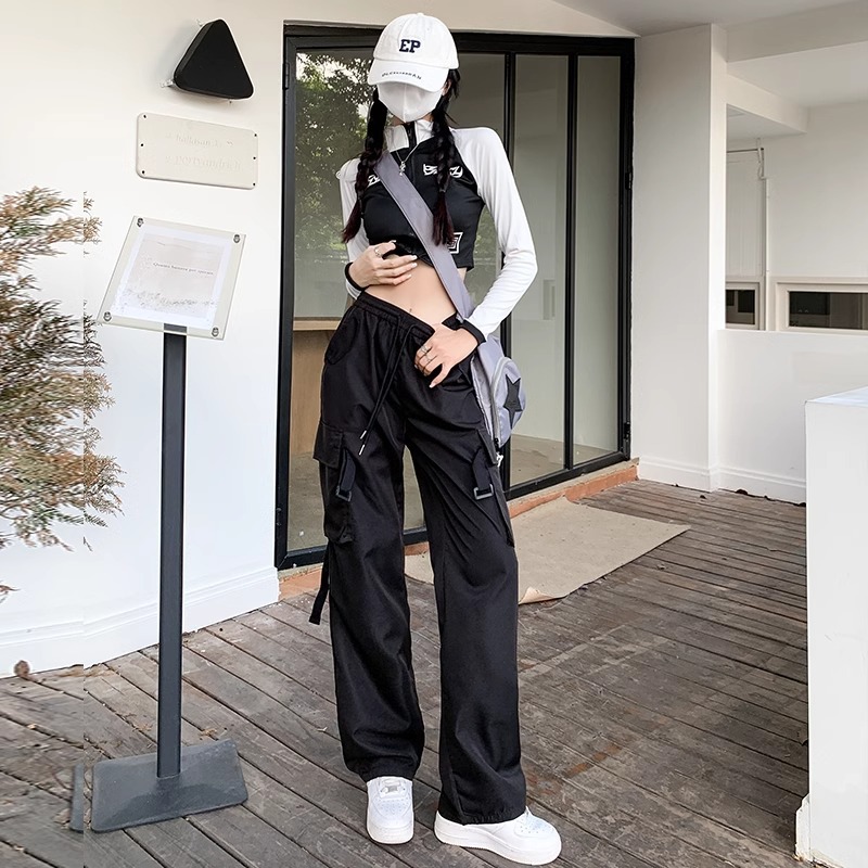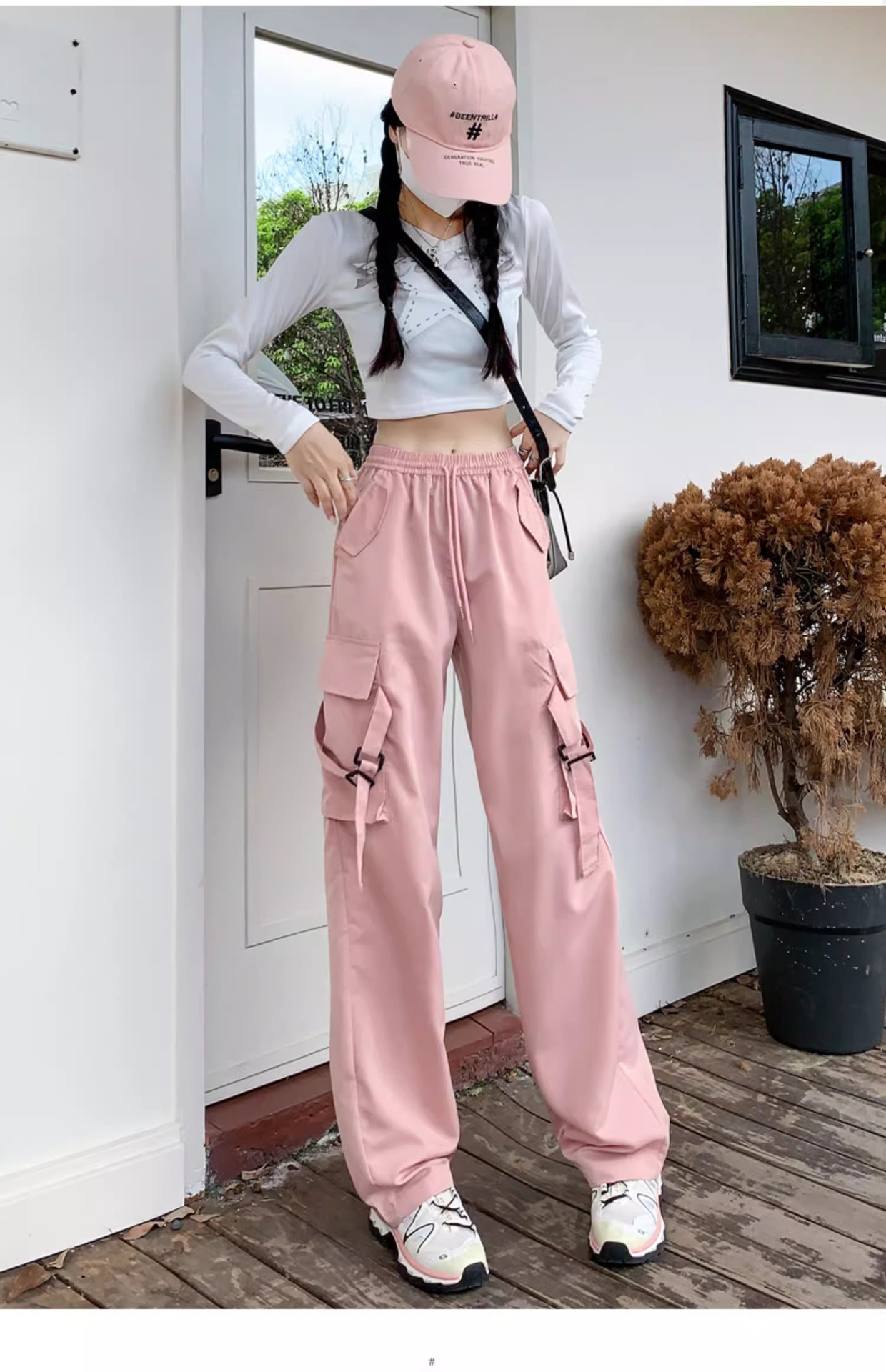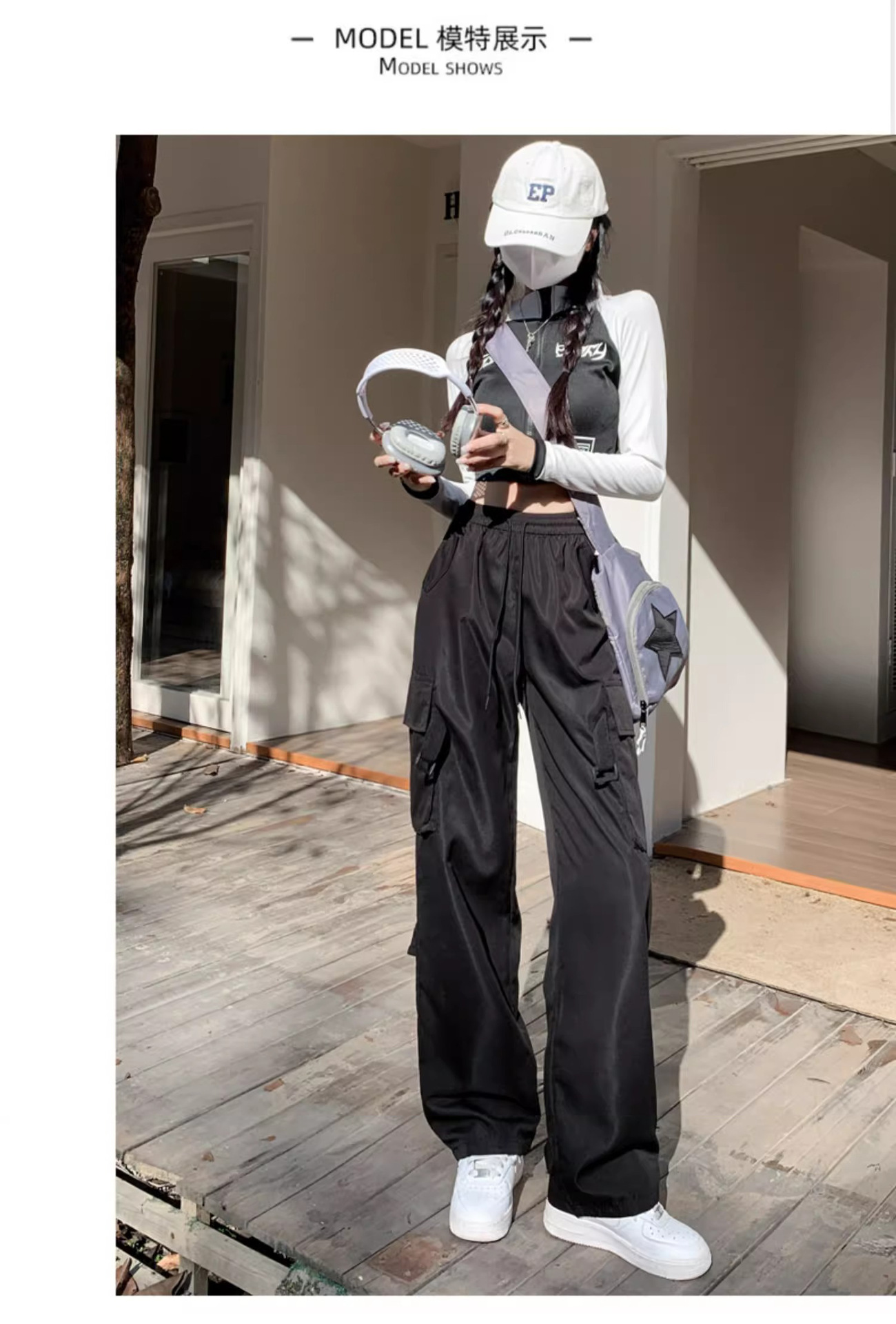 아메리칸 스타일 하이 스트리트 멀티 포켓 스포츠 작업복 바지 여성 봄과 가을 새로운 도착 탄성 허리 플러스 사이즈 드로스트링 등반 바지 캐주얼 바지스토어 가기