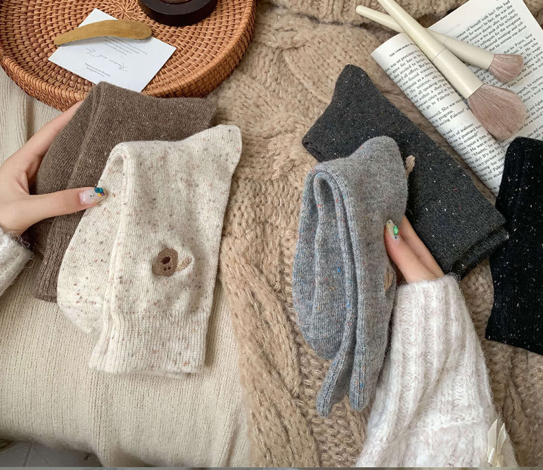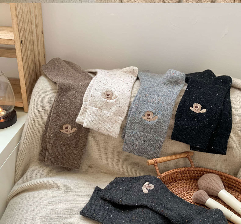 가을과 겨울 다크 브라운 스타일 포인트 원사 양모 양말 여성의 겨울 두꺼운 따뜻한 한국 스타일 귀여운 강아지 자수 중간 길이 양말