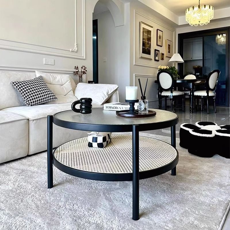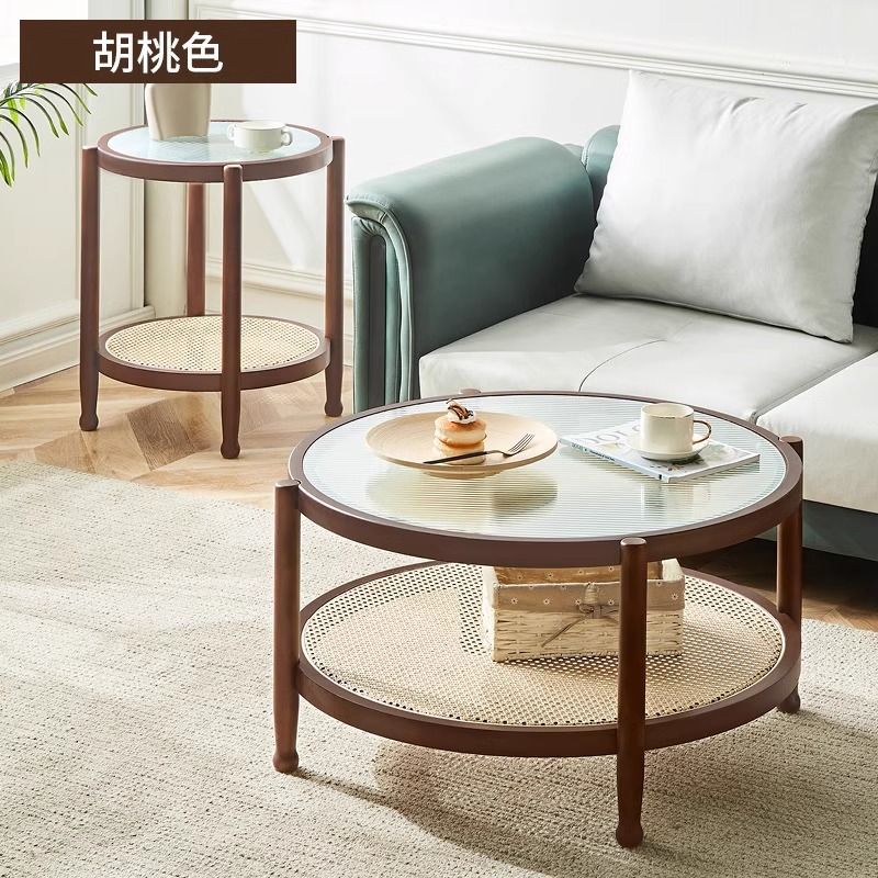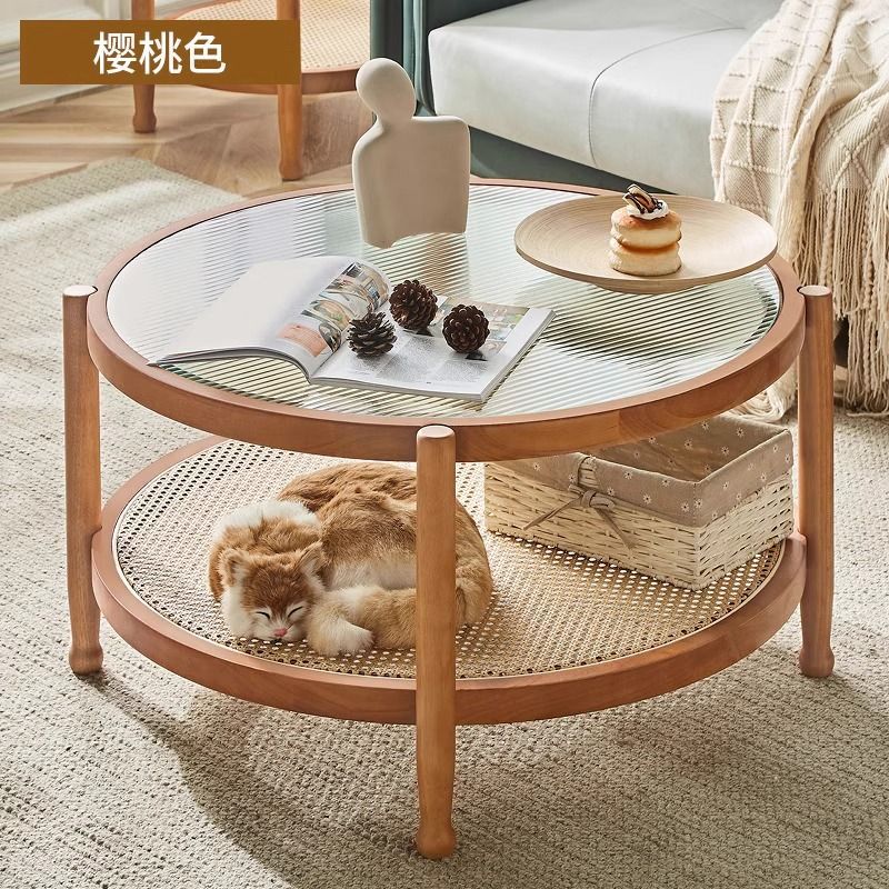 일본식 커피 테이블 거실 가정용 솔리드 우드 등나무 창 홍 유리 더블 레이어 라운드 간단한 현대 작은 아파트스토어 가기