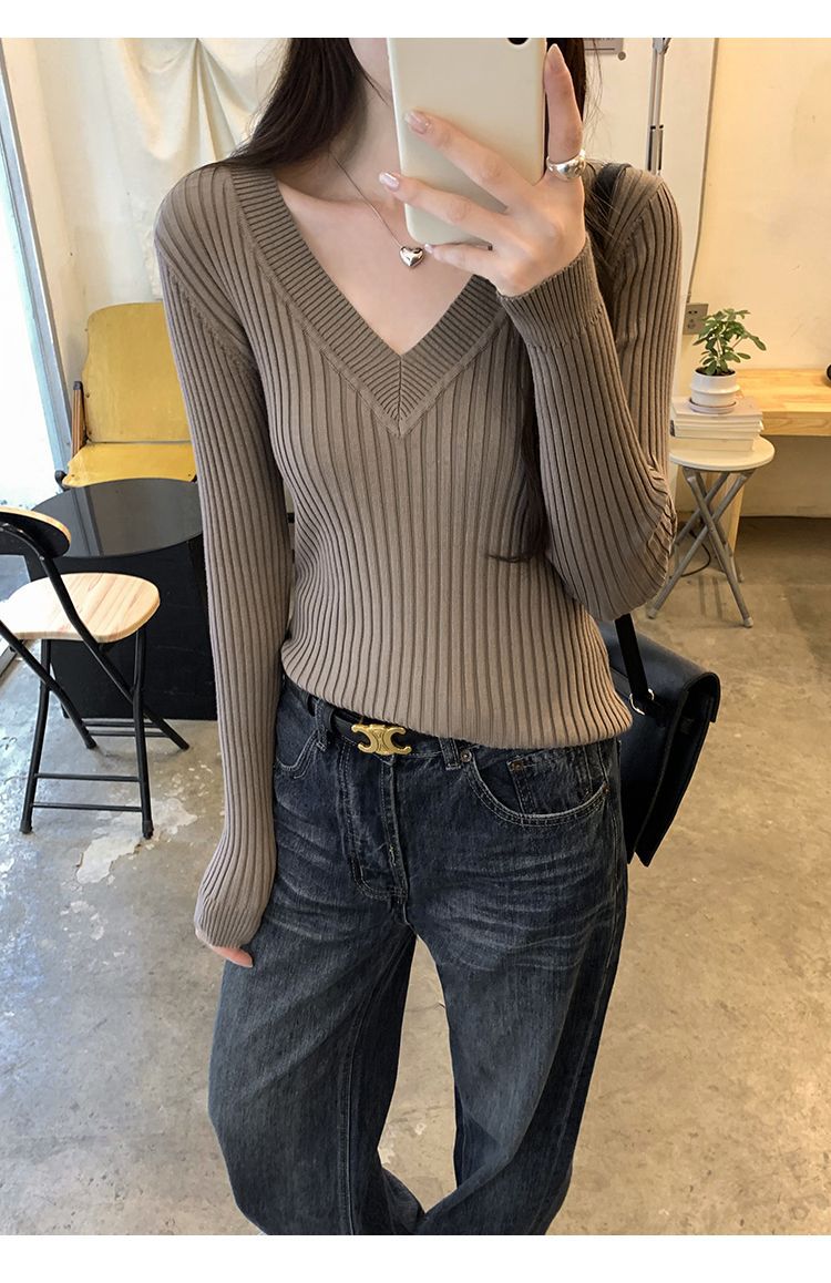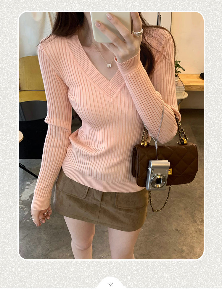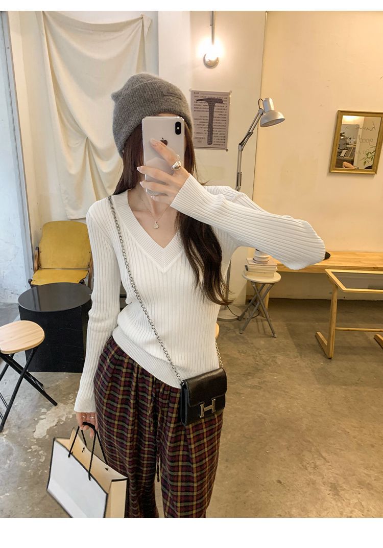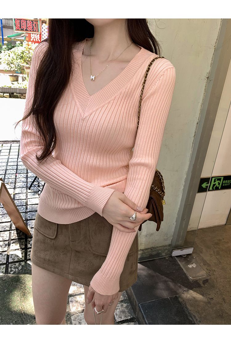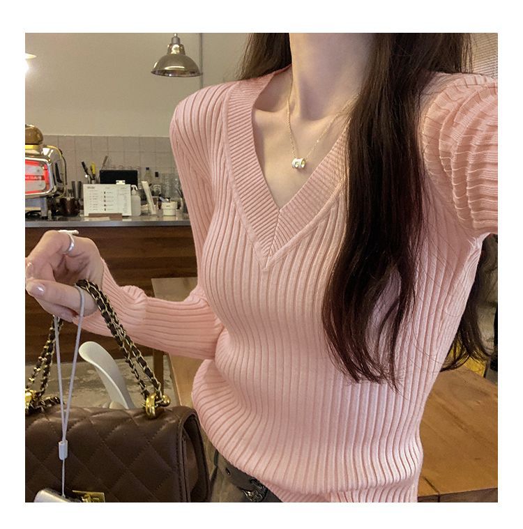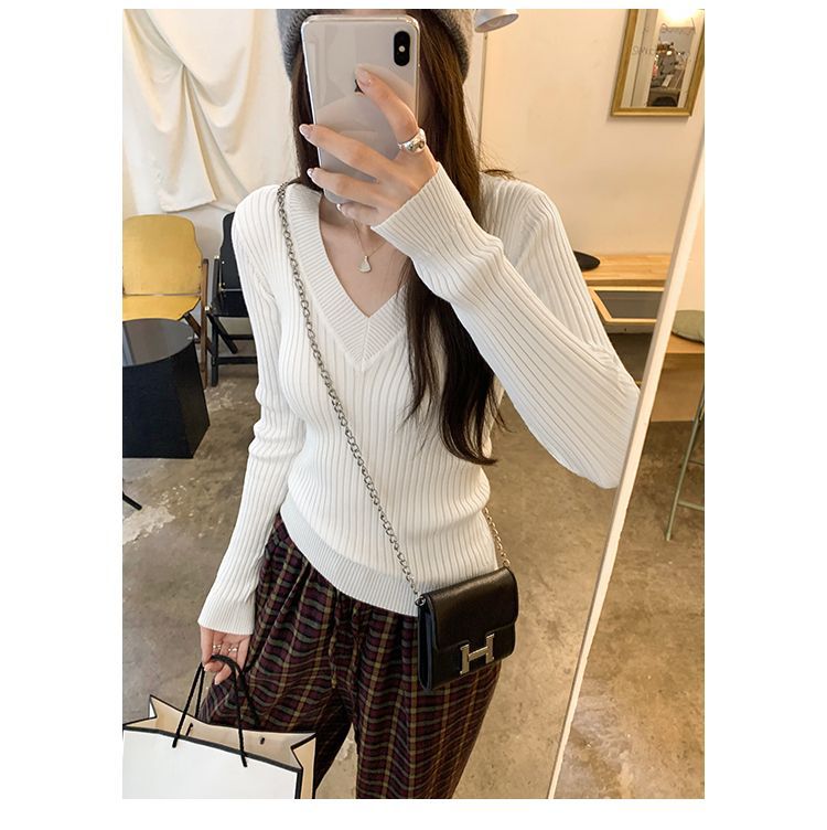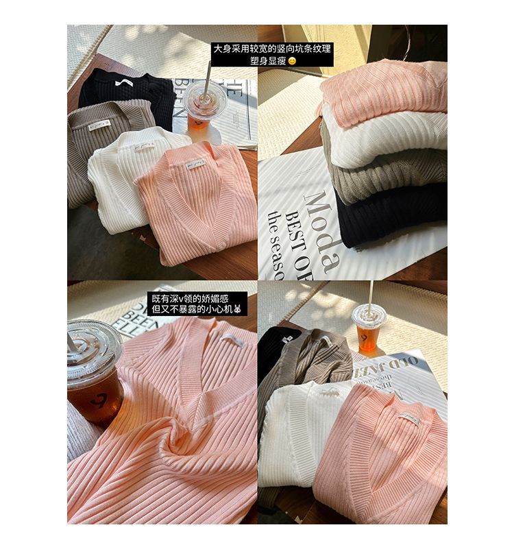 부드러운 스타일 슈퍼 잘 생긴 V 넥 안티 스트립 긴 소매 내베이스 니트 스웨터 여성의 가을과 겨울 새로운 슬림 핏 탑스토어 가기