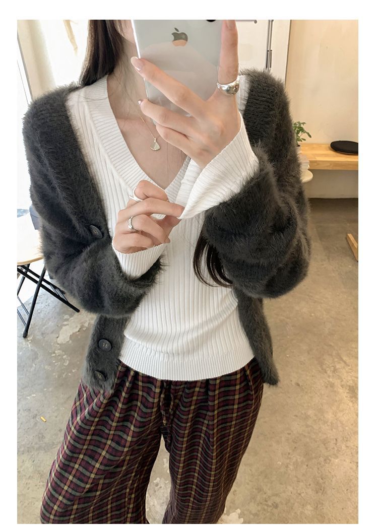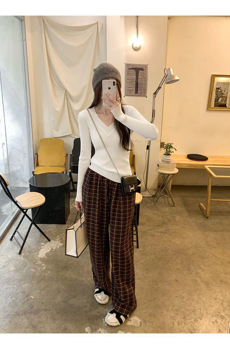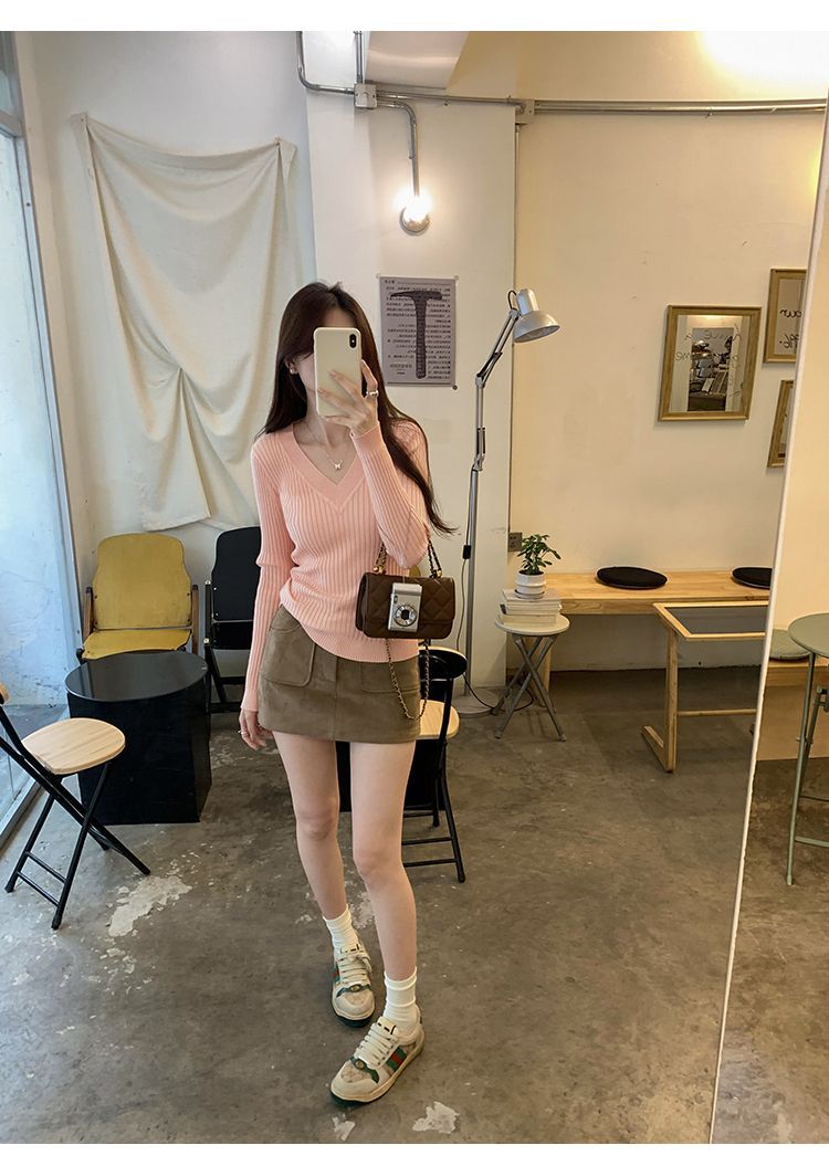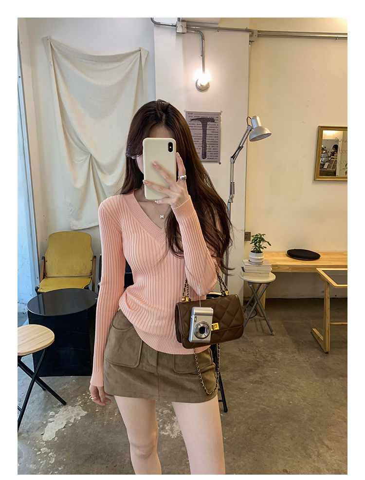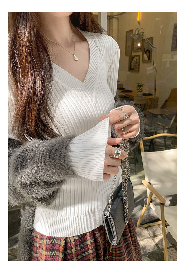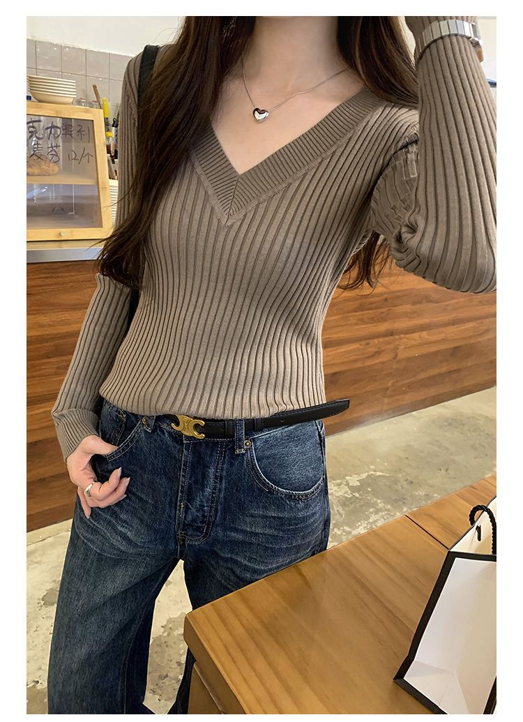 부드러운 스타일 슈퍼 잘 생긴 V 넥 안티 스트립 긴 소매 내베이스 니트 스웨터 여성의 가을과 겨울 새로운 슬림 핏 탑스토어 가기