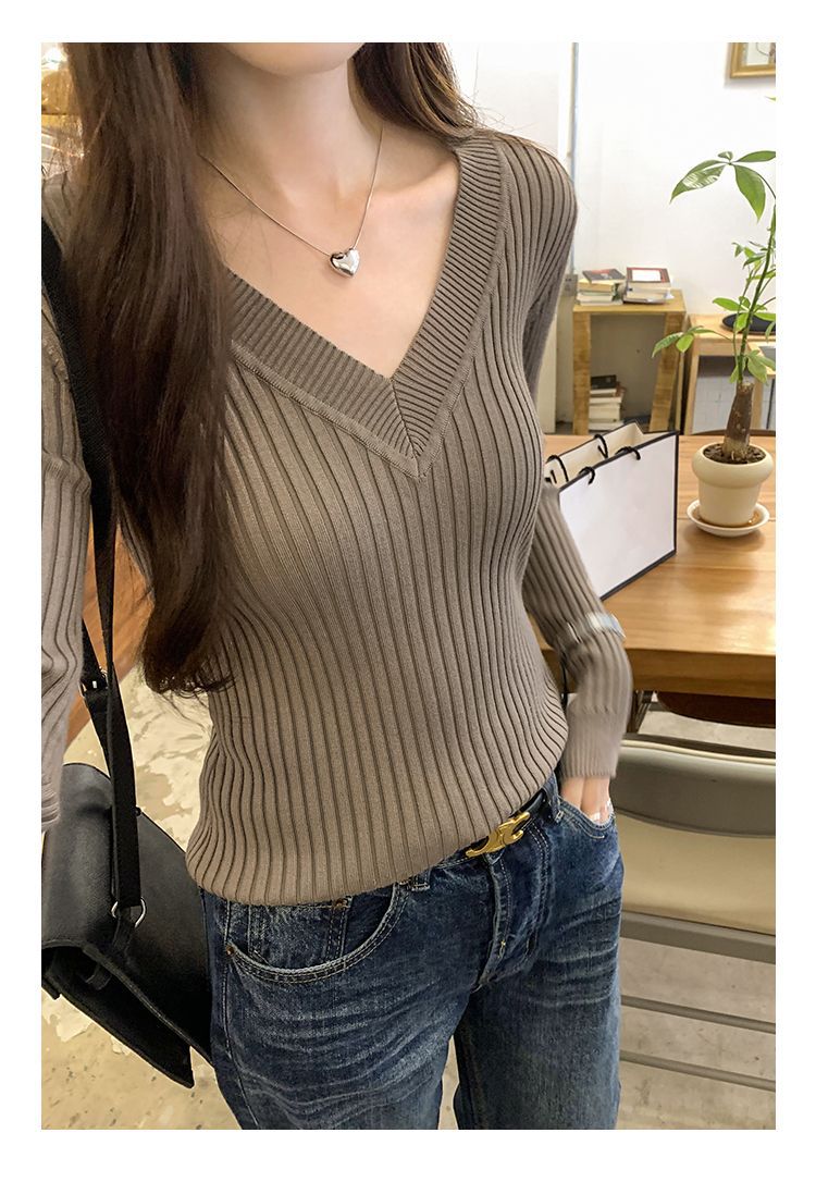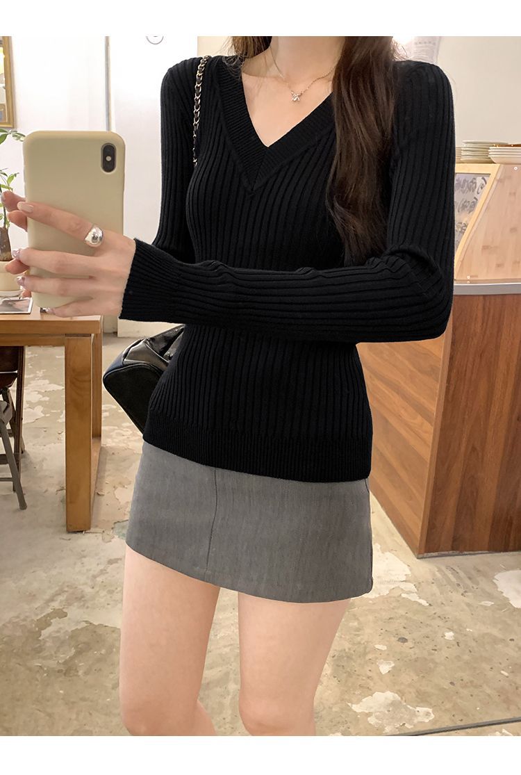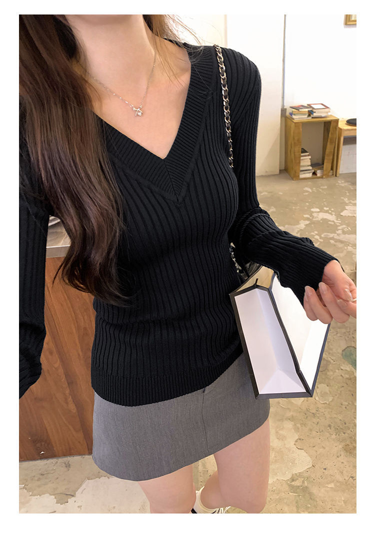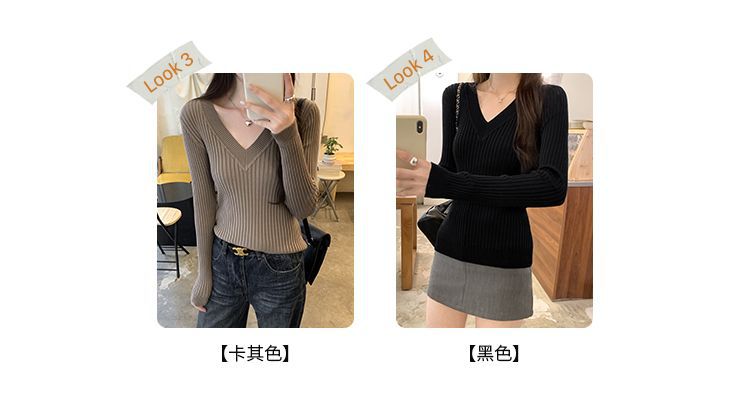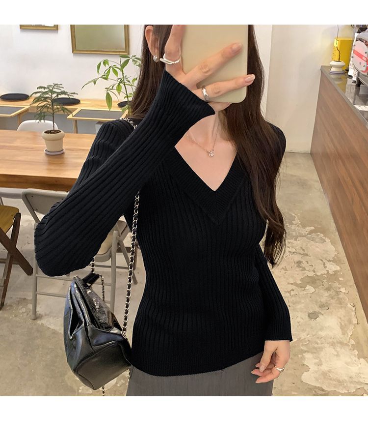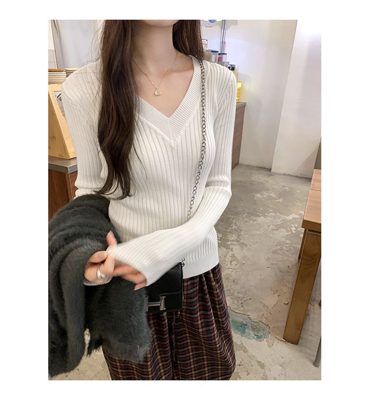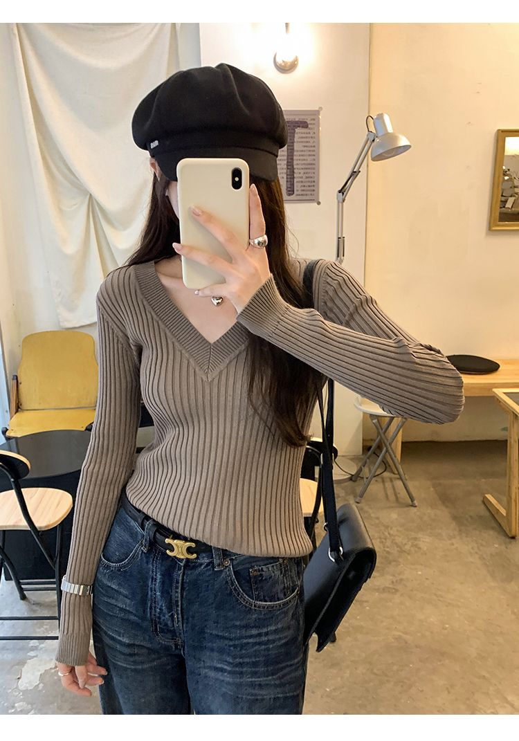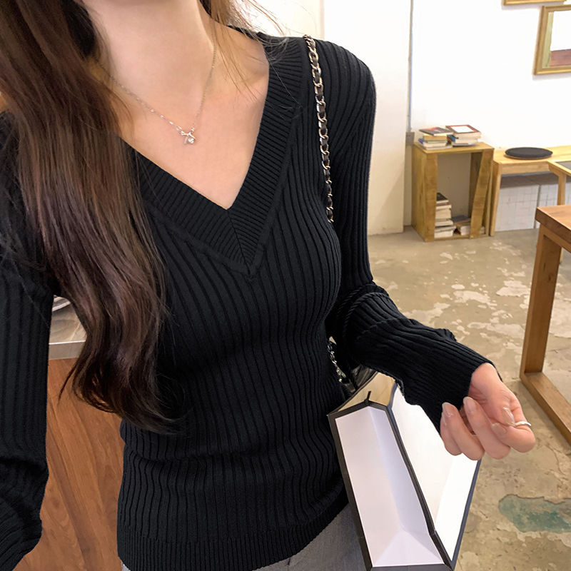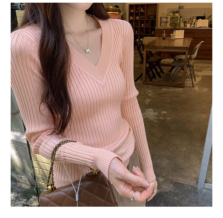 부드러운 스타일 슈퍼 잘 생긴 V 넥 안티 스트립 긴 소매 내베이스 니트 스웨터 여성의 가을과 겨울 새로운 슬림 핏 탑
