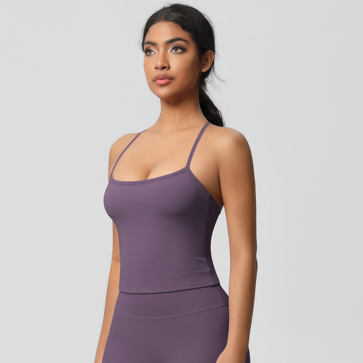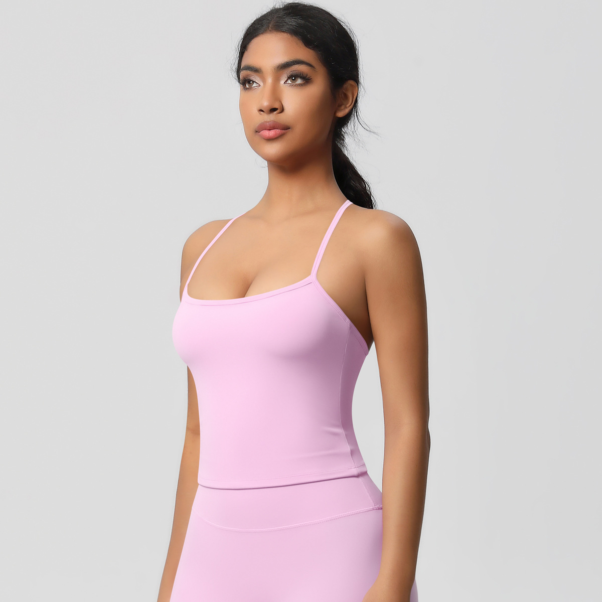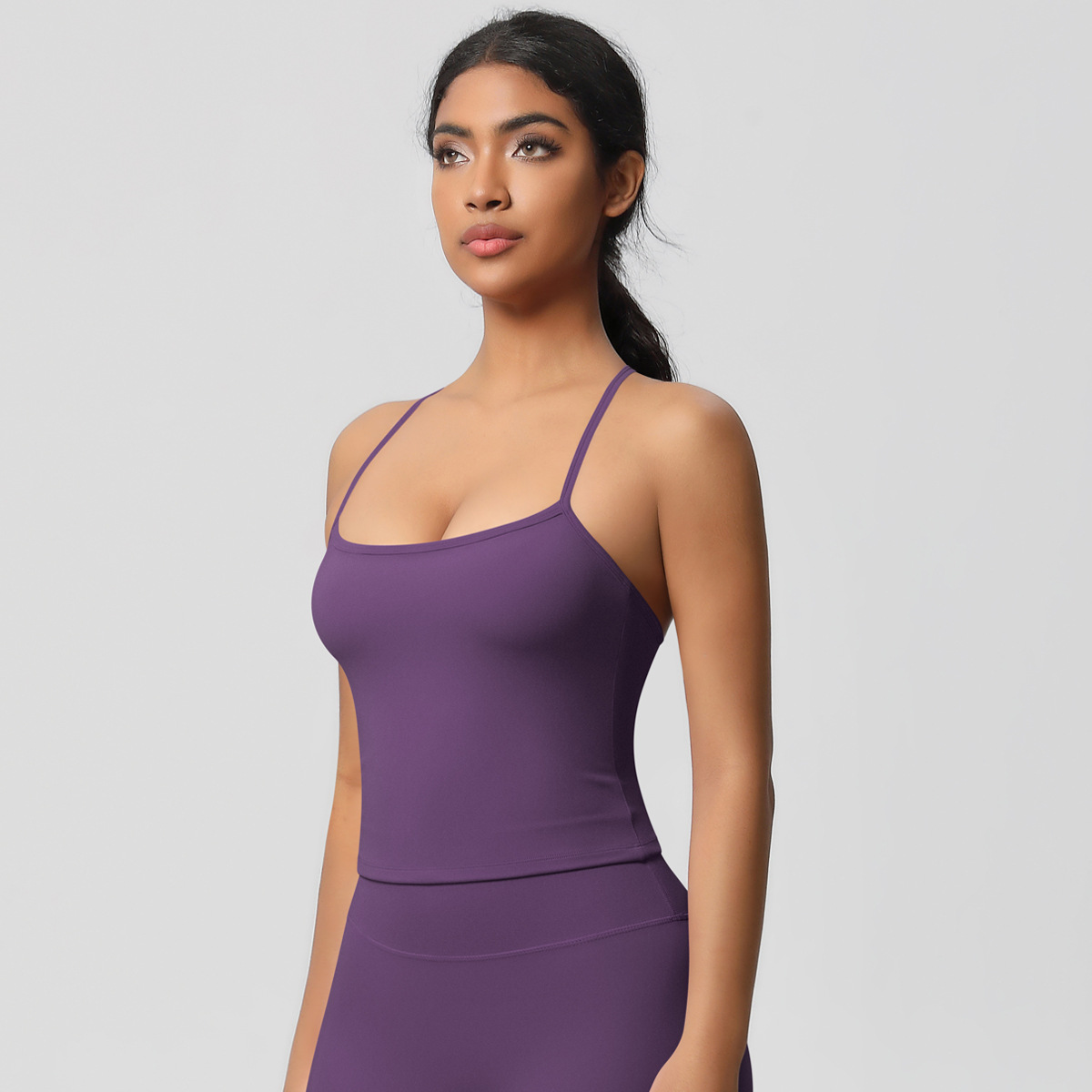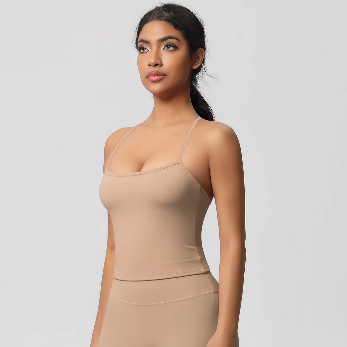 알몸 피부 친화적 인 목 스포츠 속옷 중간 강도 섹시한 얇은 어깨 스트랩 아름다운 뒤로 이동식 가슴 패드 요가 조끼스토어 가기