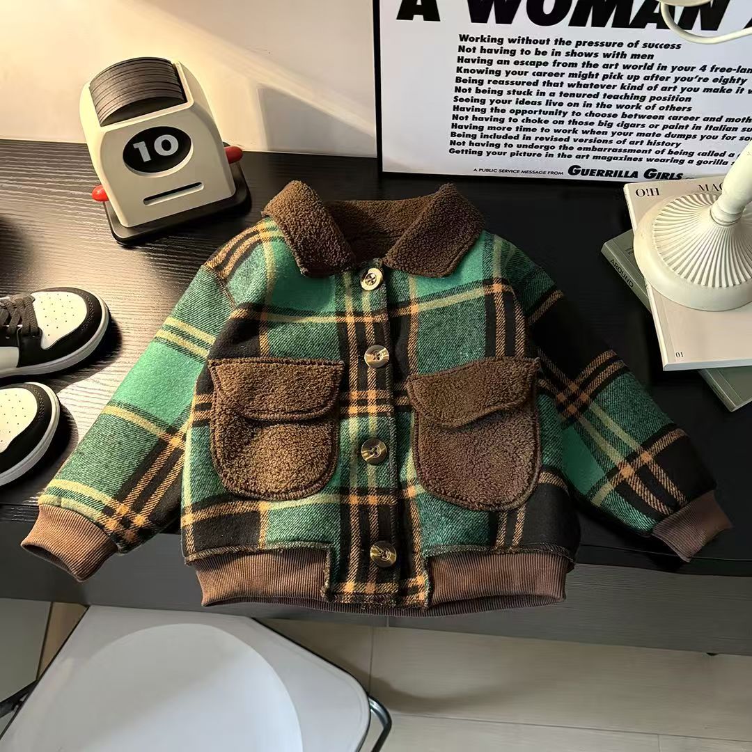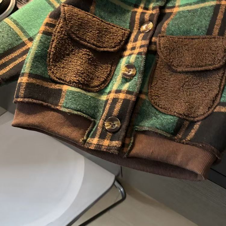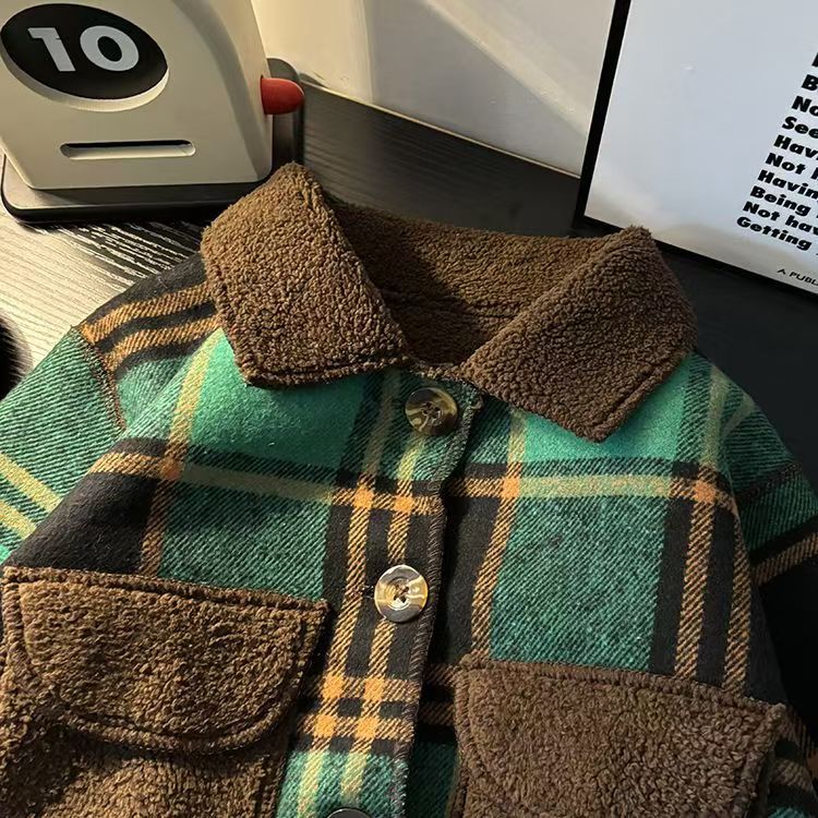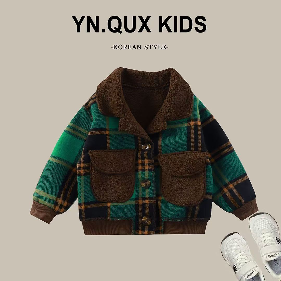 어린이 벨벳 재킷 가을과 겨울 새로운 녹색 격자 벨벳 재킷 소년 및 소녀 한국 스타일 유행 유행 외투스토어 가기