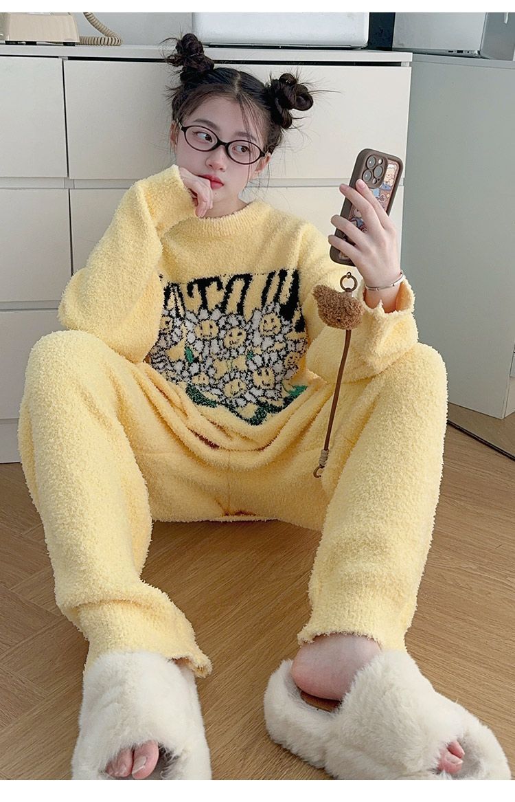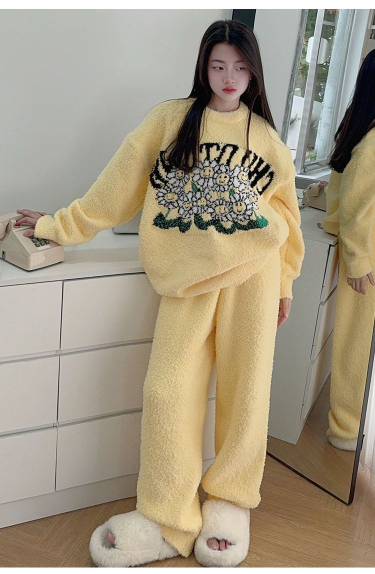 인터넷 레드 스타일 의상 데이지 파자마 여성 가을과 겨울 반쪽 벨벳 기모 두꺼운 겨울 산호 벨벳 홈 옷