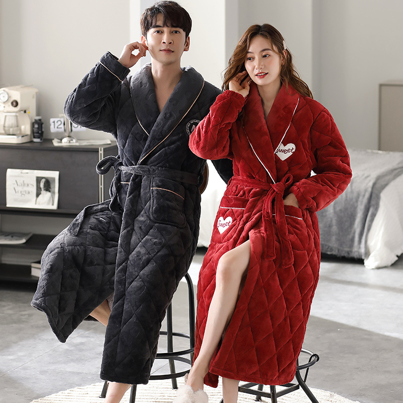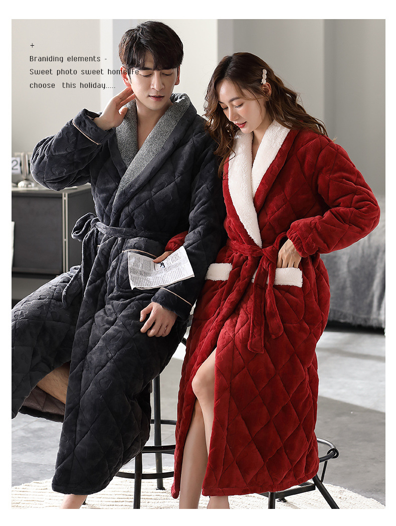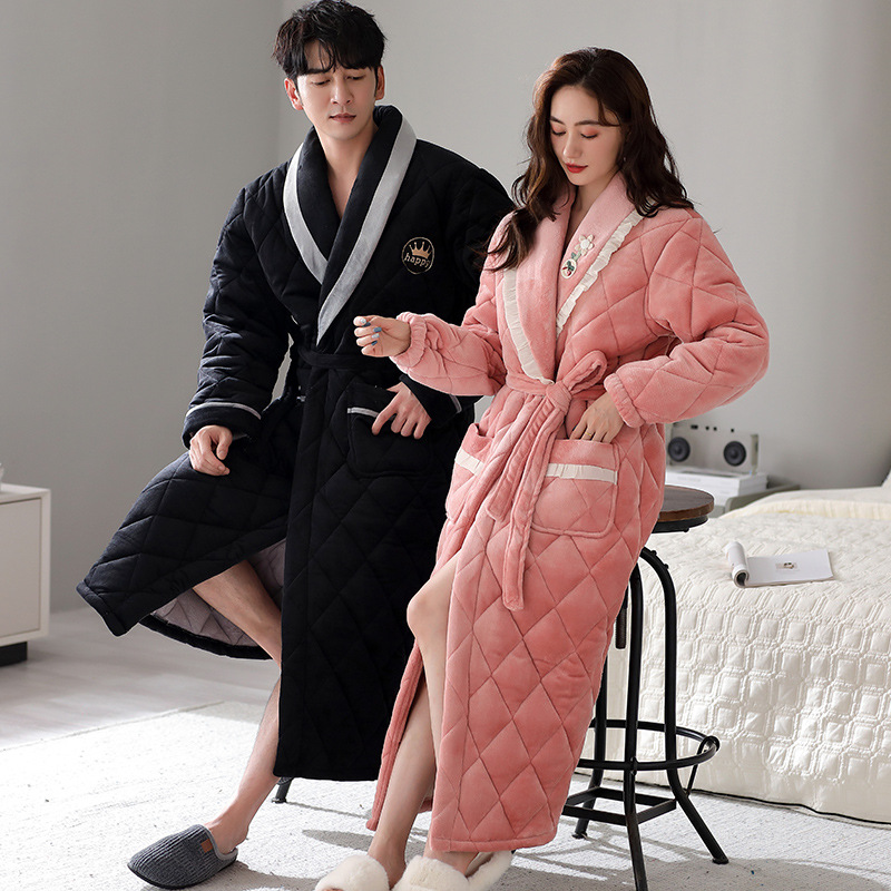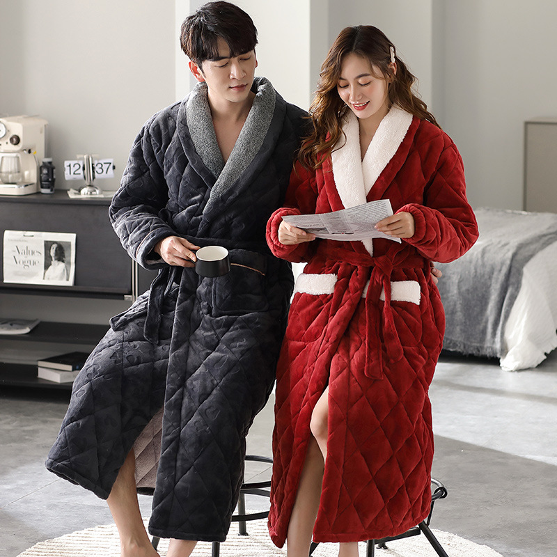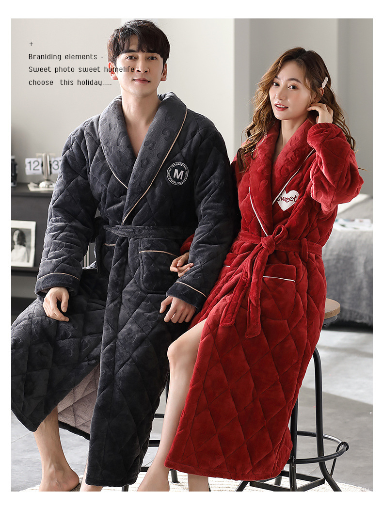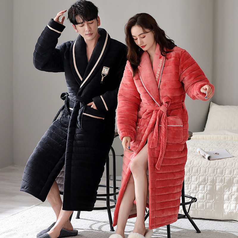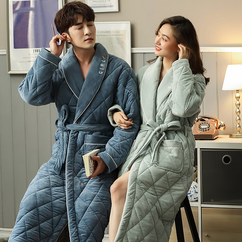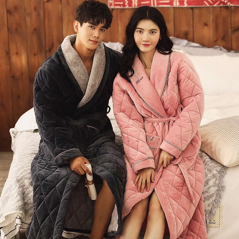 새로운 커플의 잠옷 여성의 겨울 두꺼운 긴 산호 양털 3 층 퀼트 파자마 남자 기모 따뜻한 두꺼운 목욕 가운스토어 가기