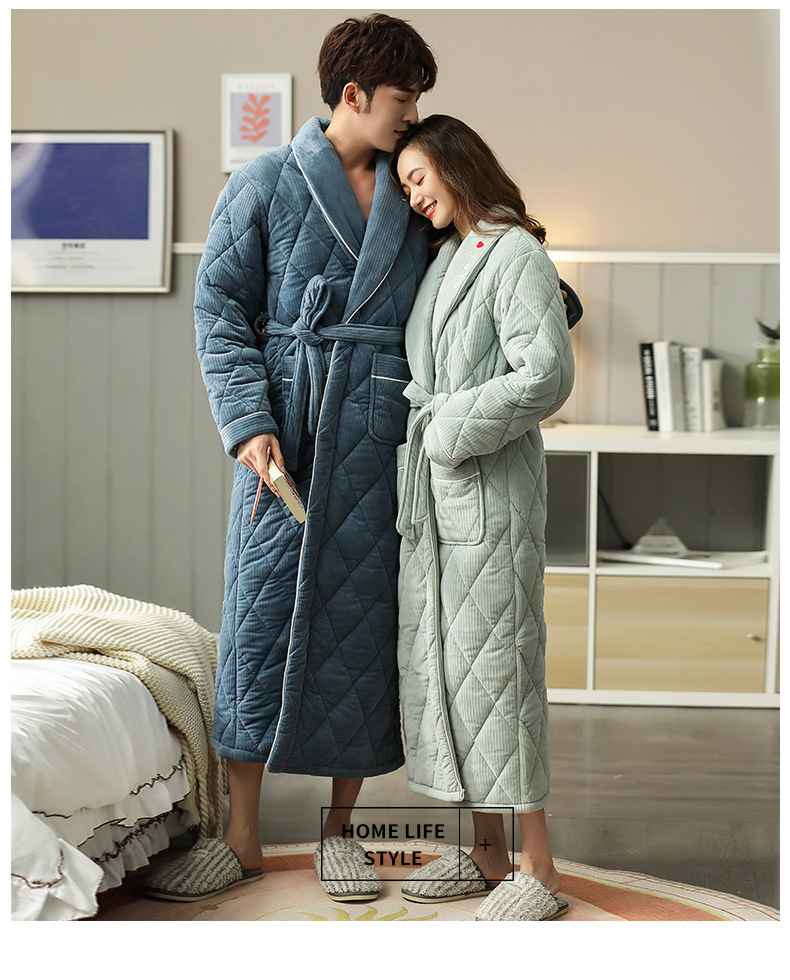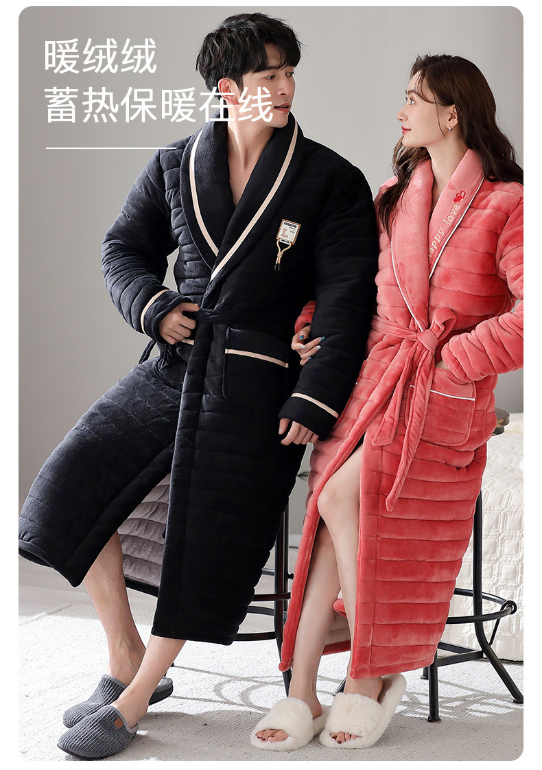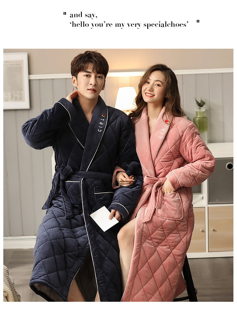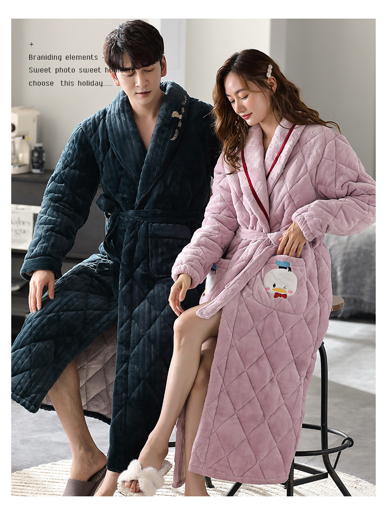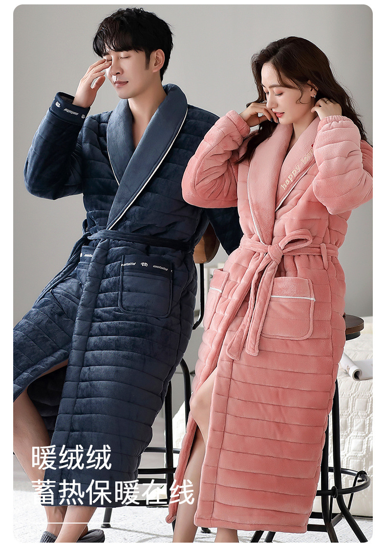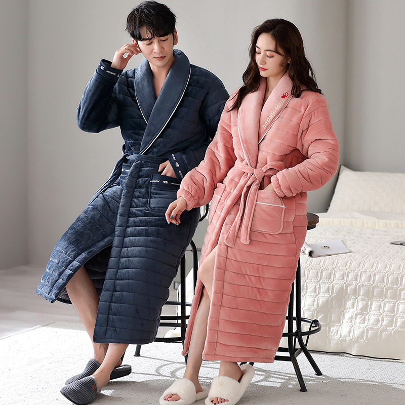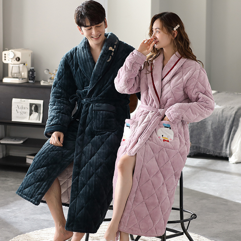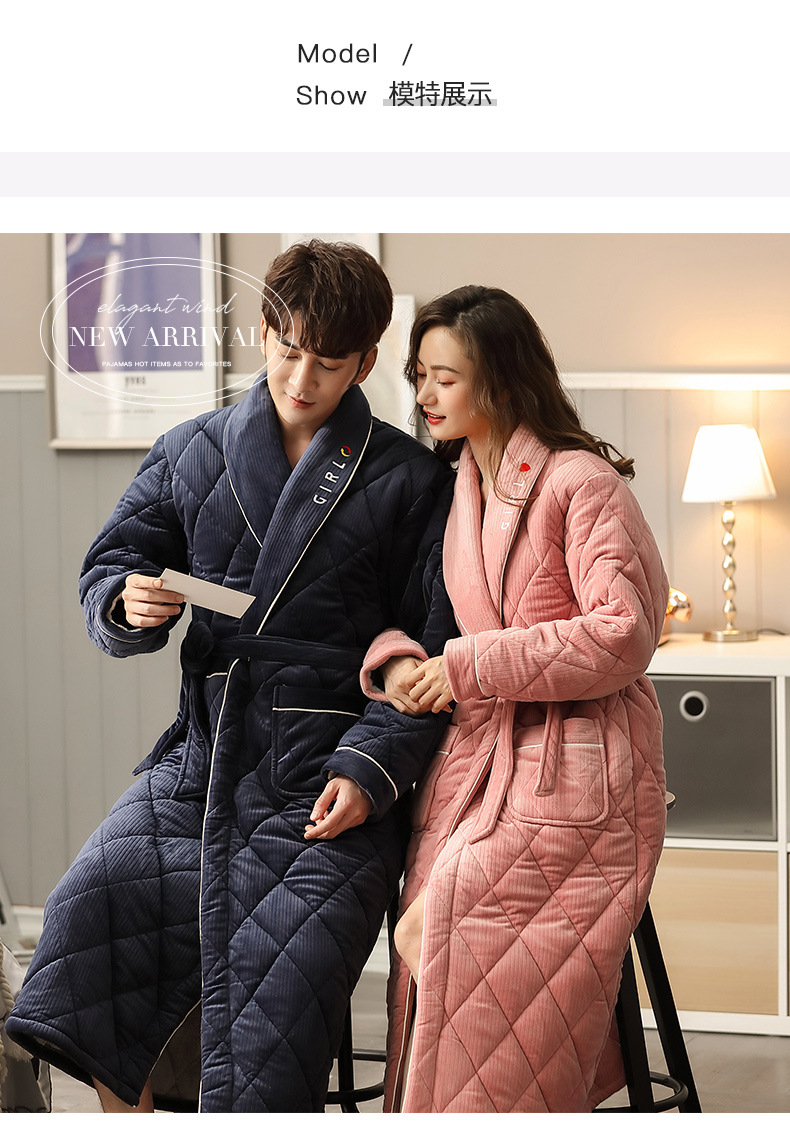 새로운 커플의 잠옷 여성의 겨울 두꺼운 긴 산호 양털 3 층 퀼트 파자마 남자 기모 따뜻한 두꺼운 목욕 가운스토어 가기