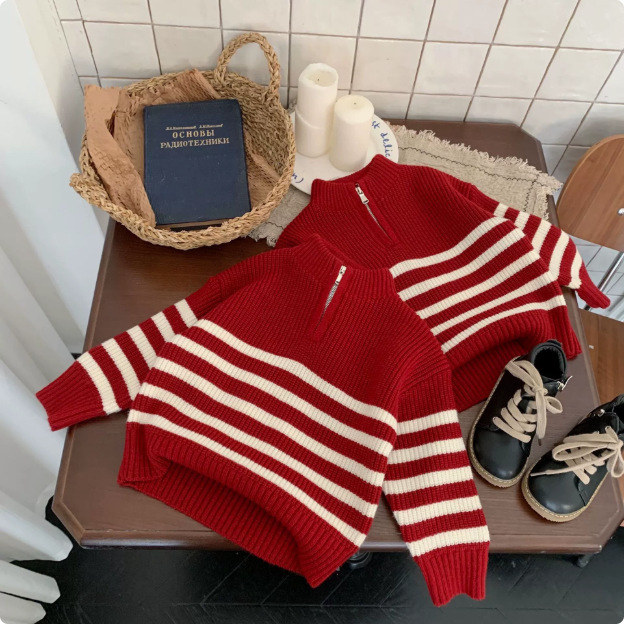 라임 보이의 붉은 스웨터 스네이크 서양식 어린이 줄무늬 스웨터 아기의 해피 이어 의류 패션 가을 겨울