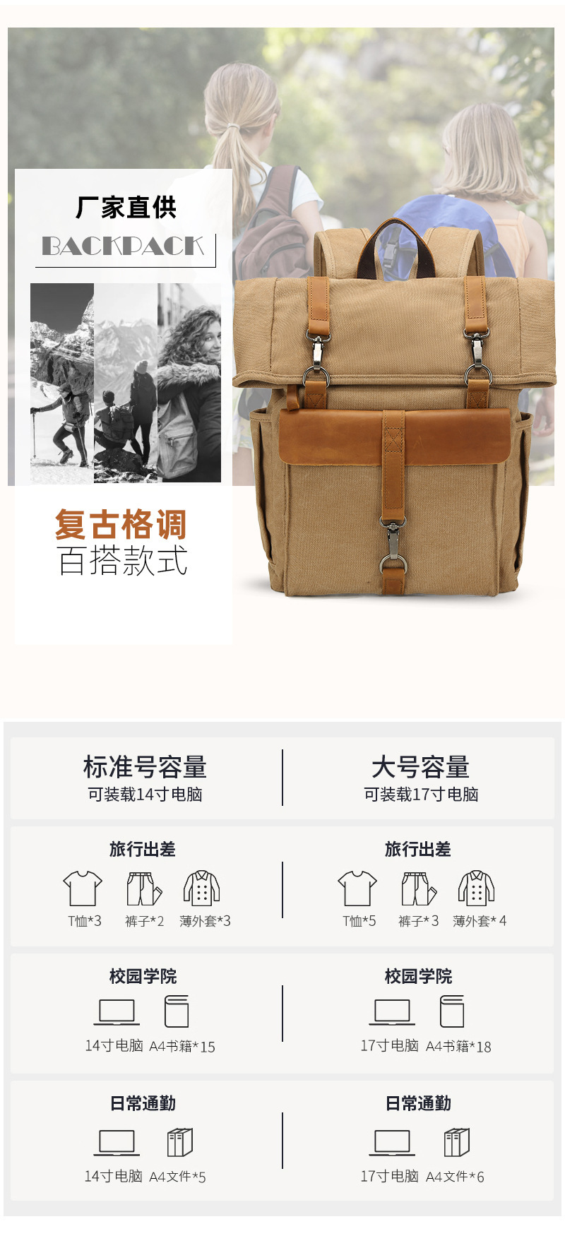 레트로 캔버스 가방 편리한 대용량 배낭 컴퓨터 가방 레저 여행 야외 세탁 등산 가방 도매스토어 가기