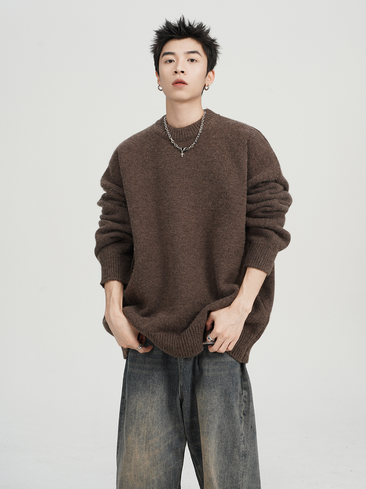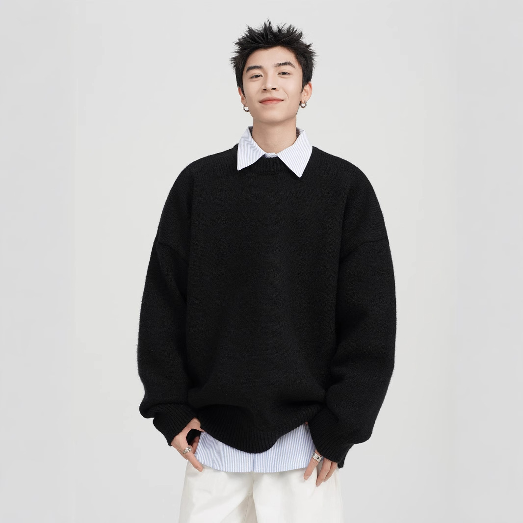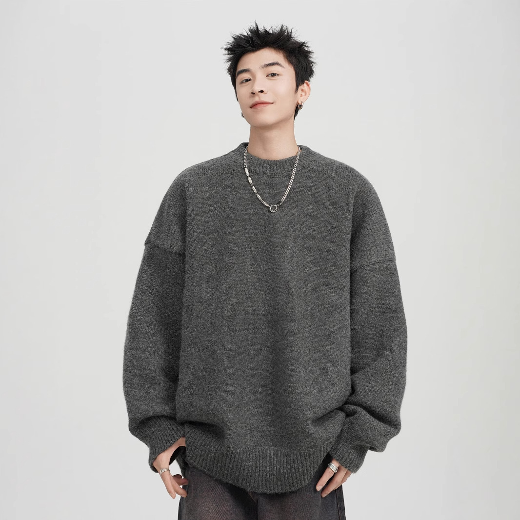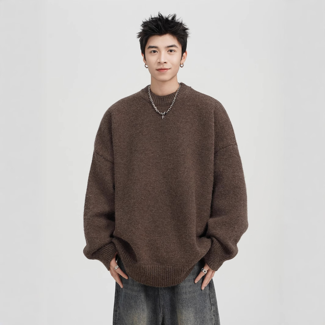 아메리칸 스타일 레트로 다크 브라운 크루 넥 스웨터 남자 가을 겨울 솔리드 컬러 올 매치 긴소매 캐주얼 게으른 풀오버 스웨터