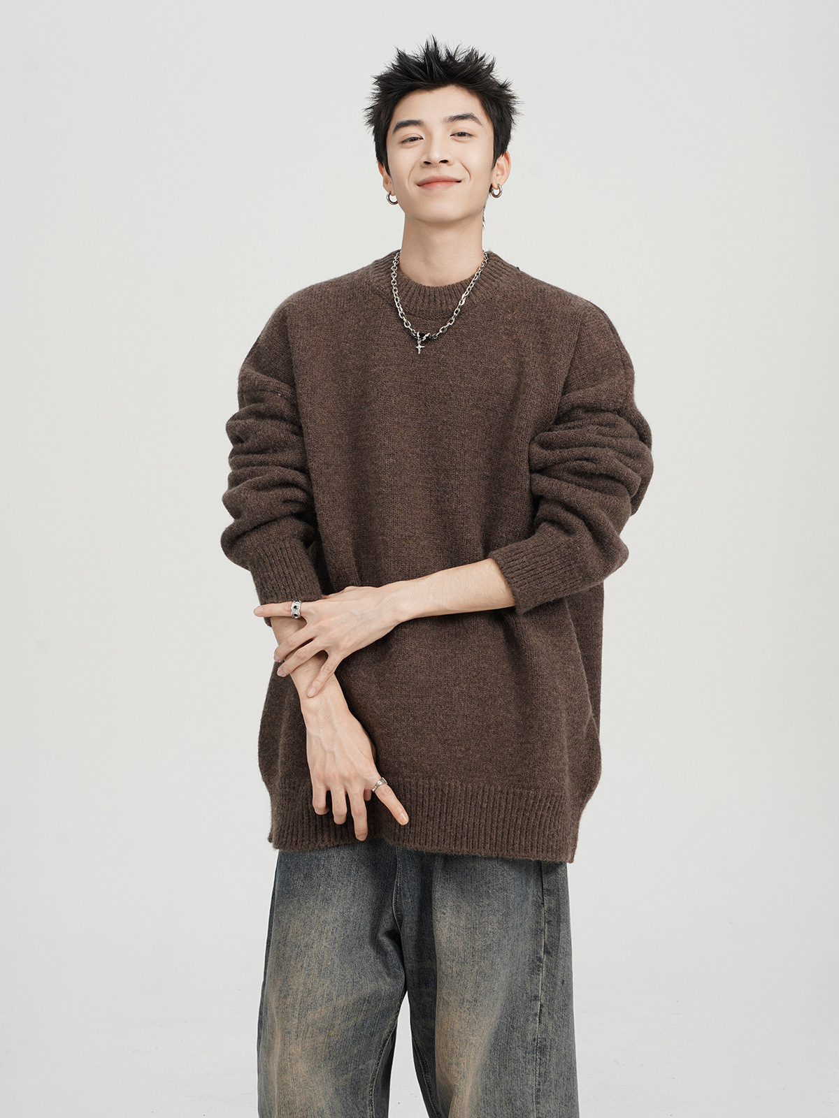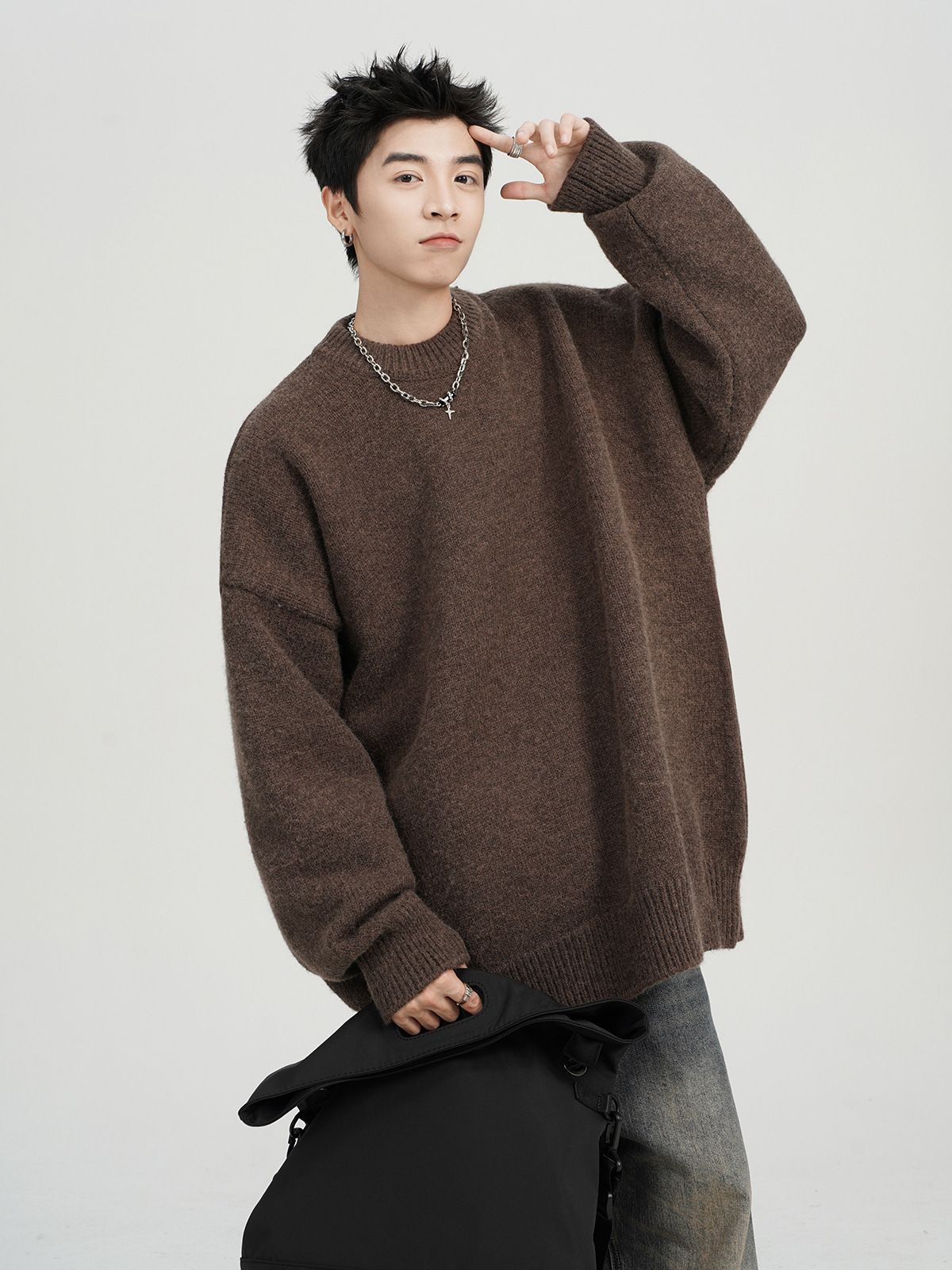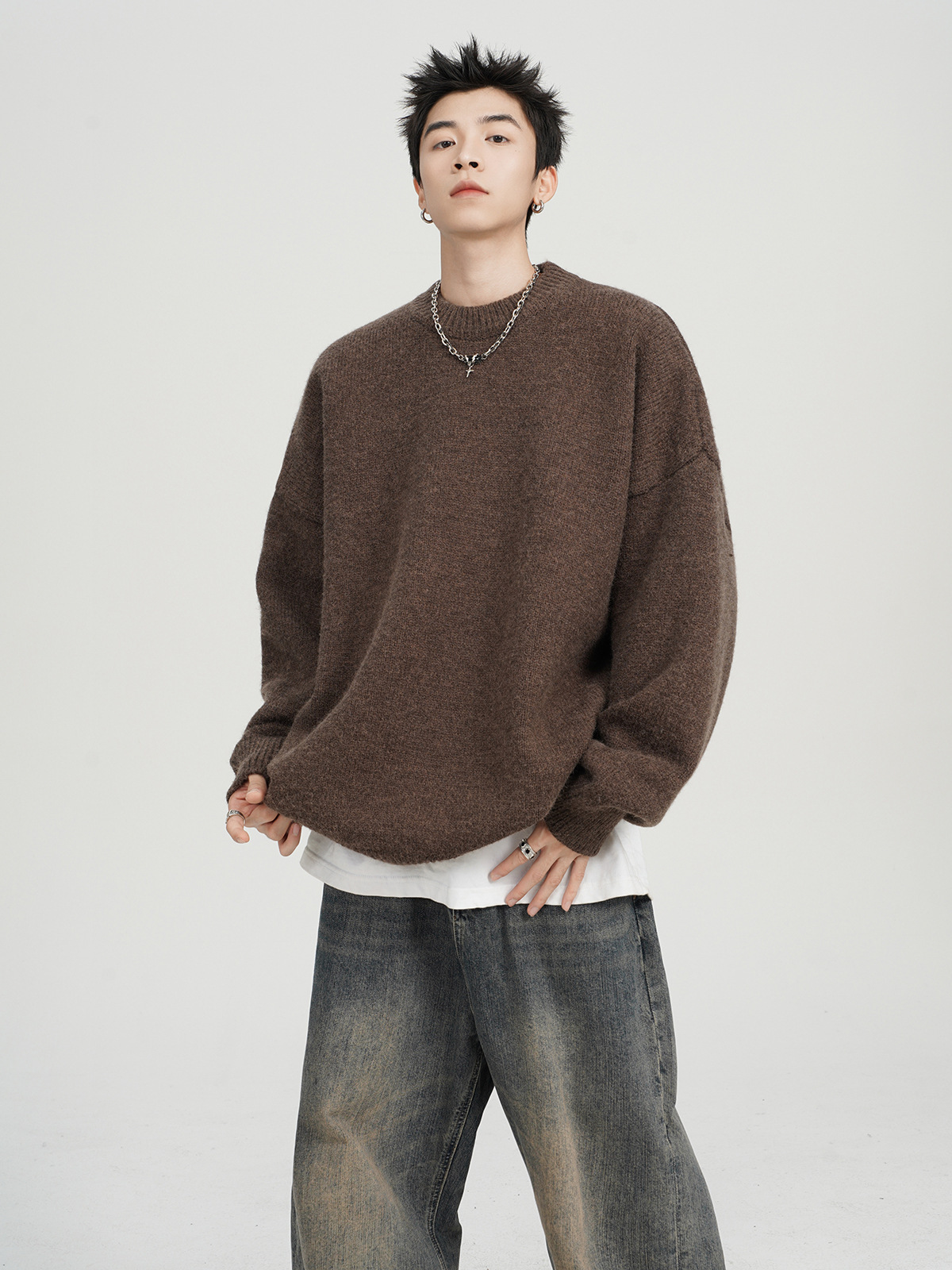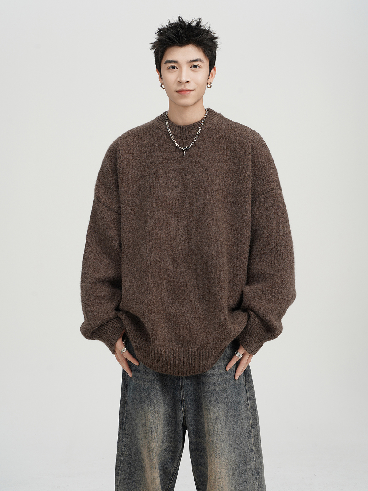아메리칸 스타일 레트로 다크 브라운 크루 넥 스웨터 남자 가을 겨울 솔리드 컬러 올 매치 긴소매 캐주얼 게으른 풀오버 스웨터
