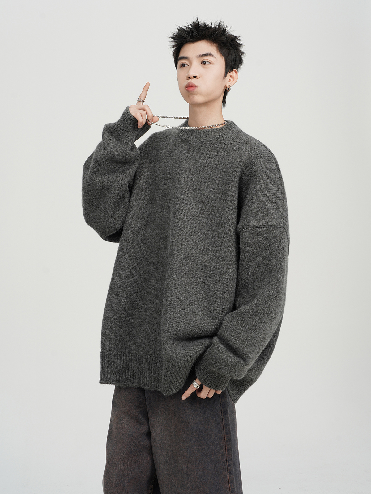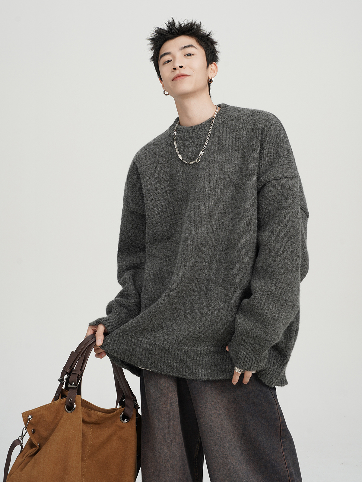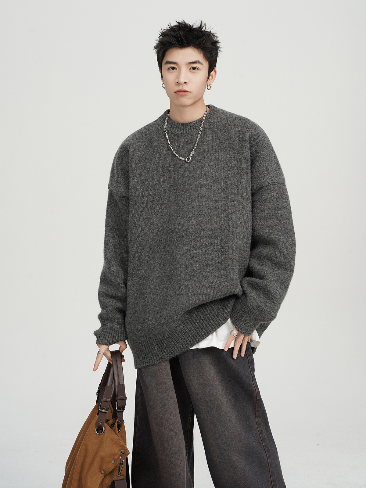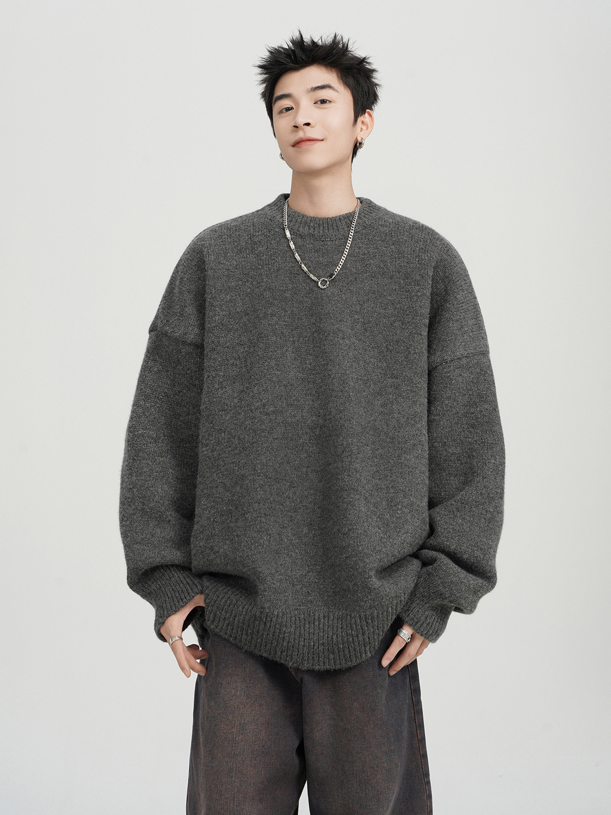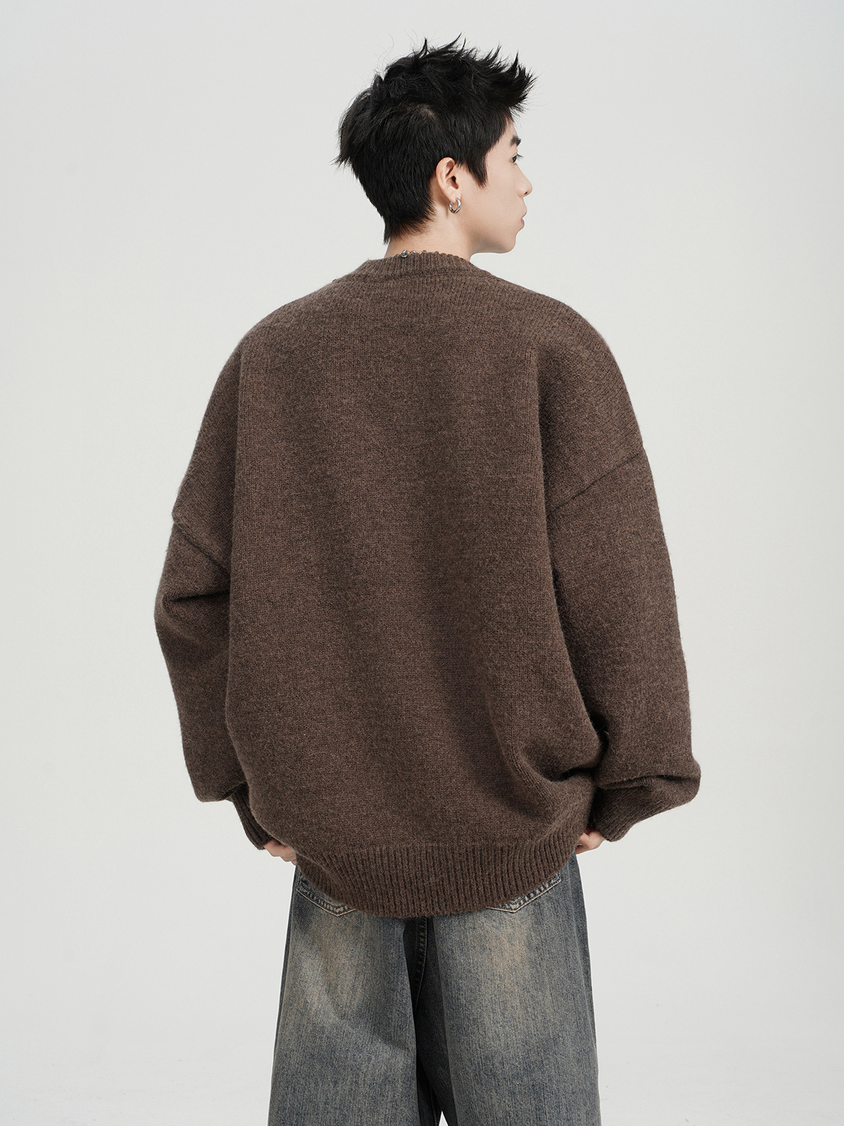아메리칸 스타일 레트로 다크 브라운 크루 넥 스웨터 남자 가을 겨울 솔리드 컬러 올 매치 긴소매 캐주얼 게으른 풀오버 스웨터