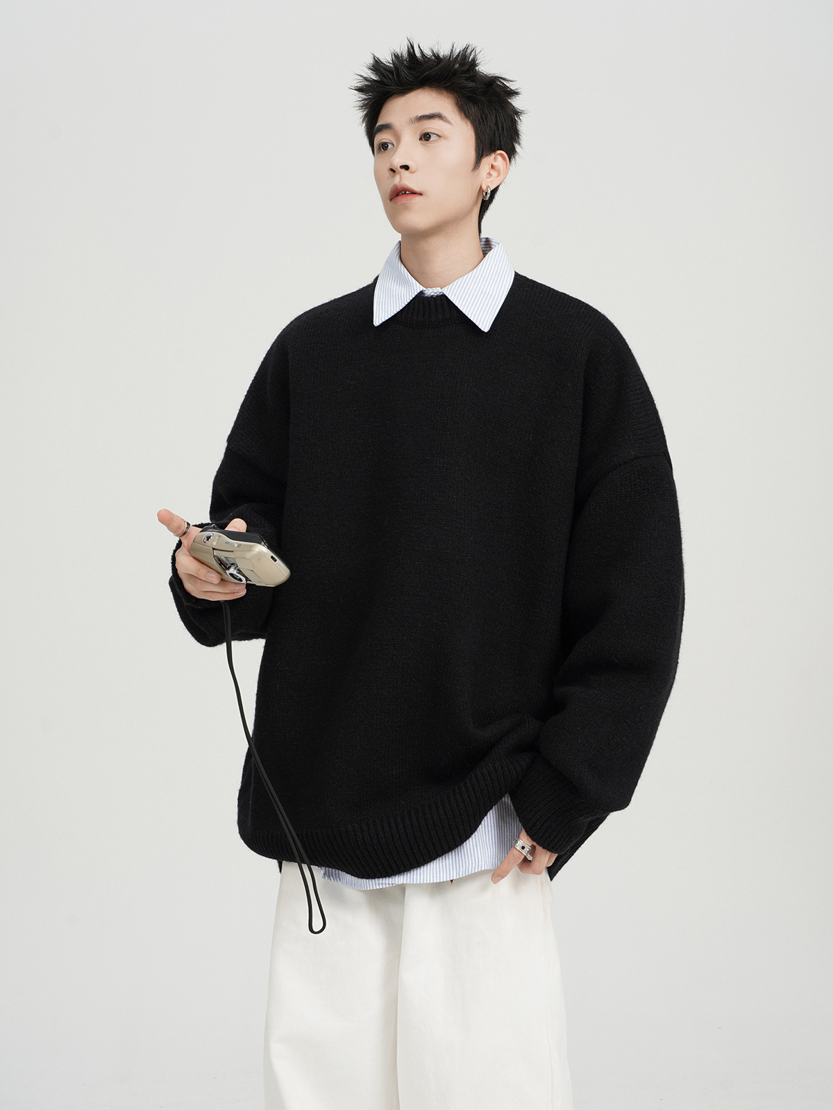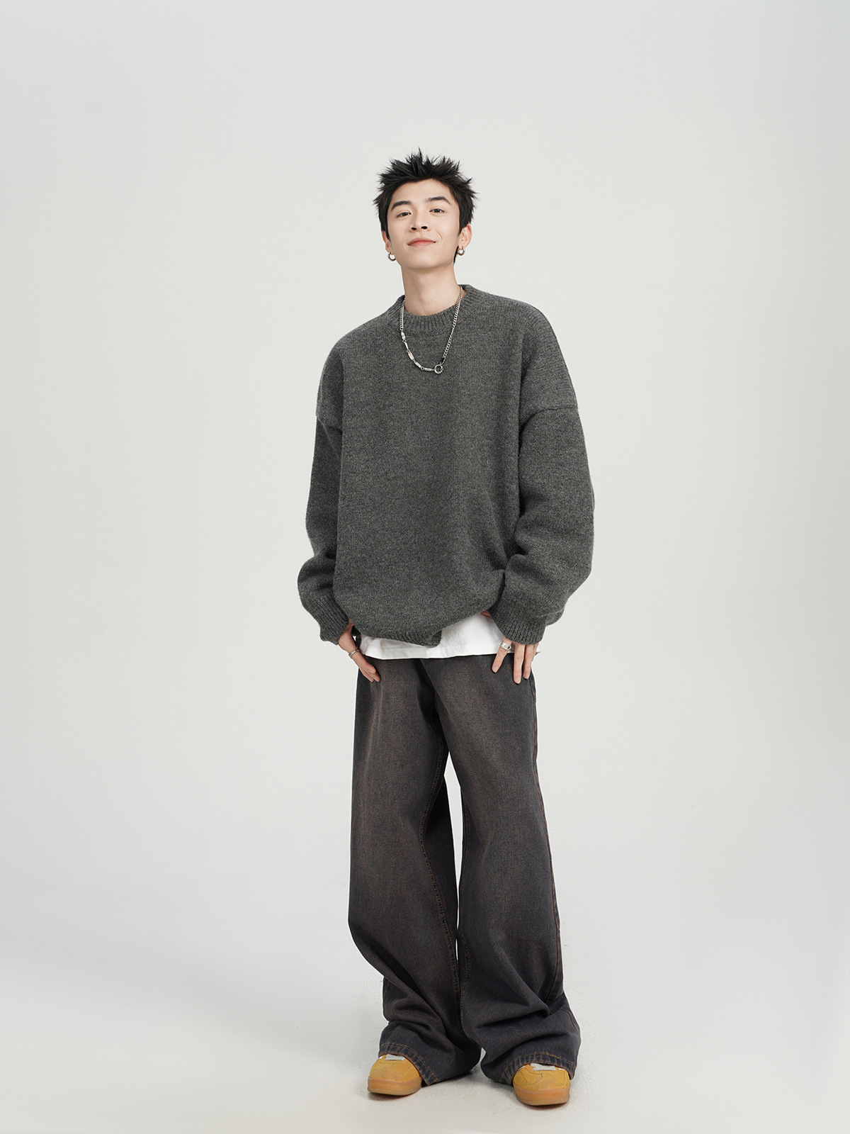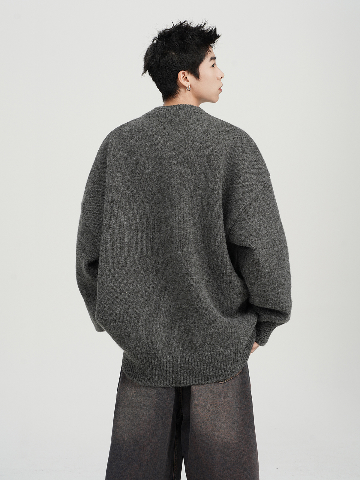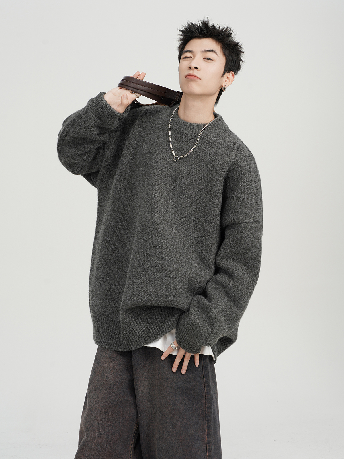 아메리칸 스타일 레트로 다크 브라운 크루 넥 스웨터 남자 가을 겨울 솔리드 컬러 올 매치 긴소매 캐주얼 게으른 풀오버 스웨터