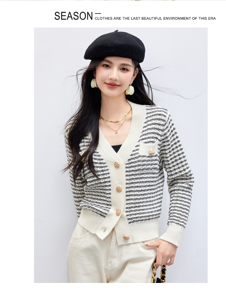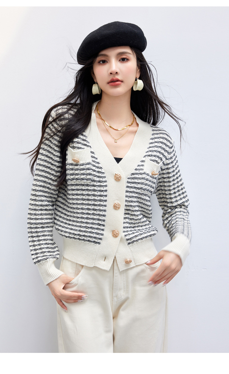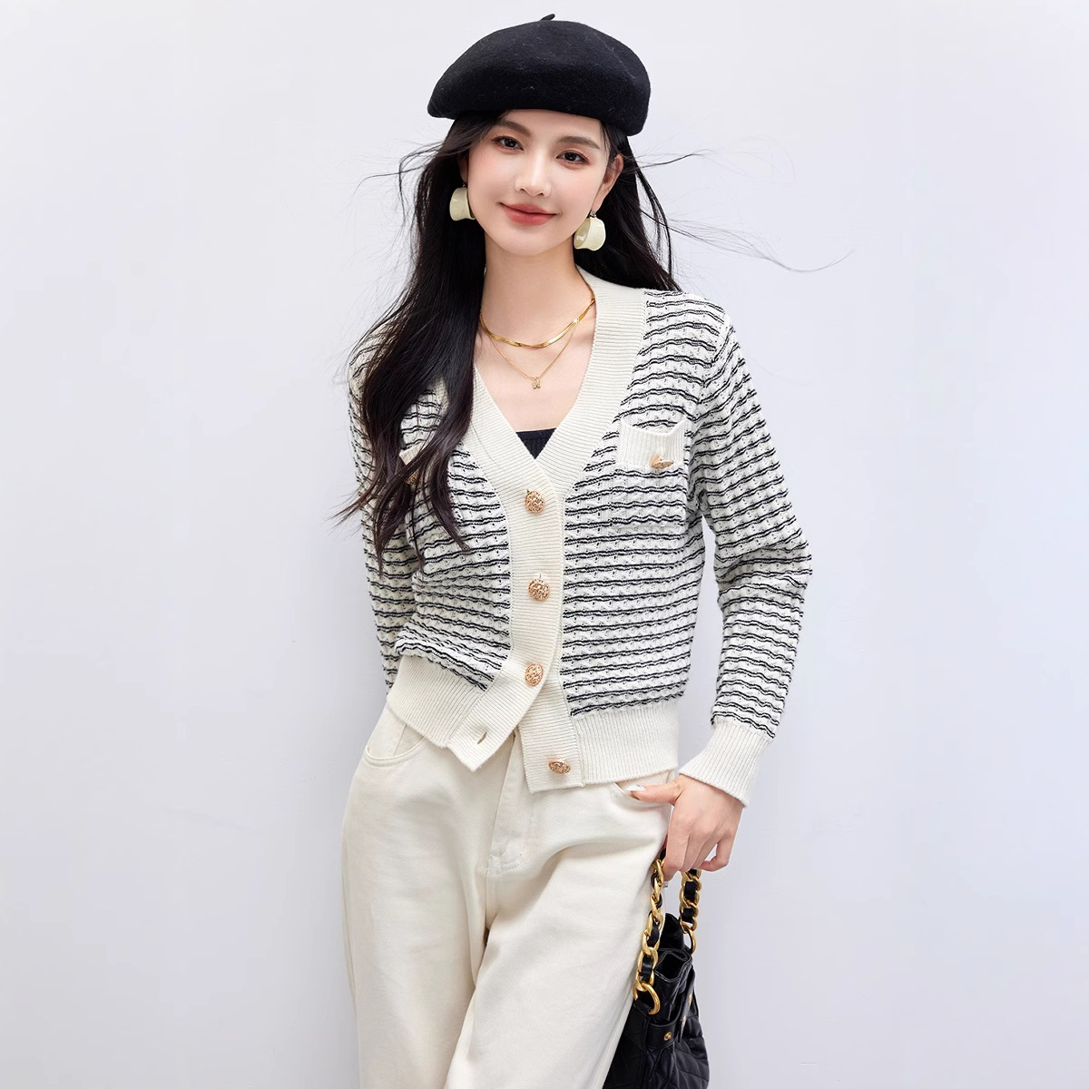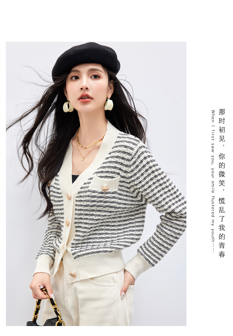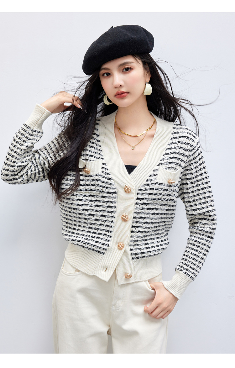 Xiaoxiang 니트 카디건 최고의 여성 2024 년 겨울 새로운 중공업 대비 컬러 스트라이프 리브 텍스처 센스 V 넥 스웨터