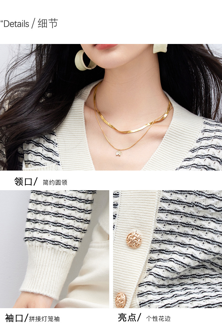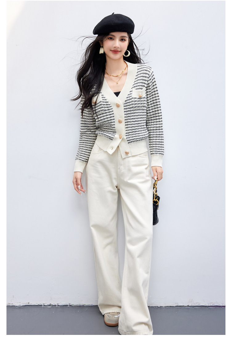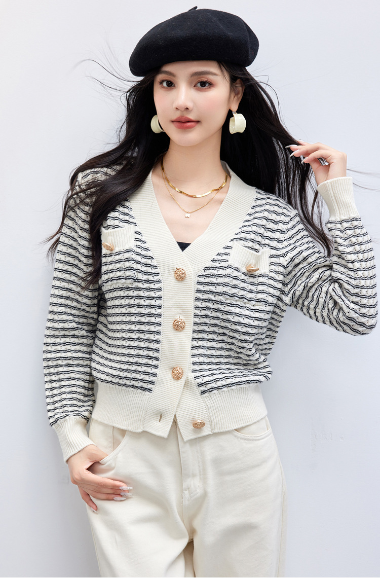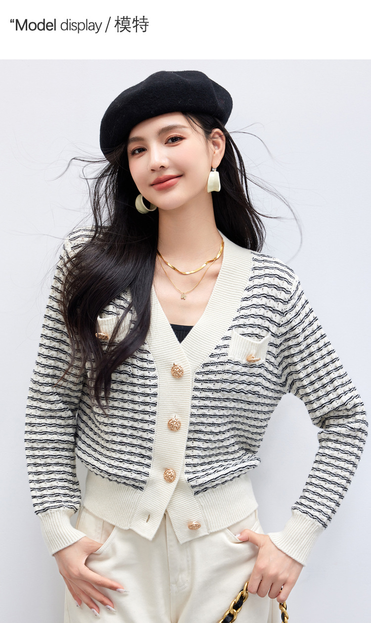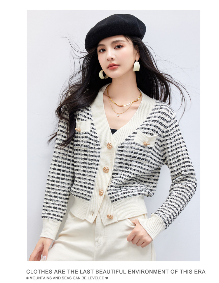 Xiaoxiang 니트 카디건 최고의 여성 2024 년 겨울 새로운 중공업 대비 컬러 스트라이프 리브 텍스처 센스 V 넥 스웨터